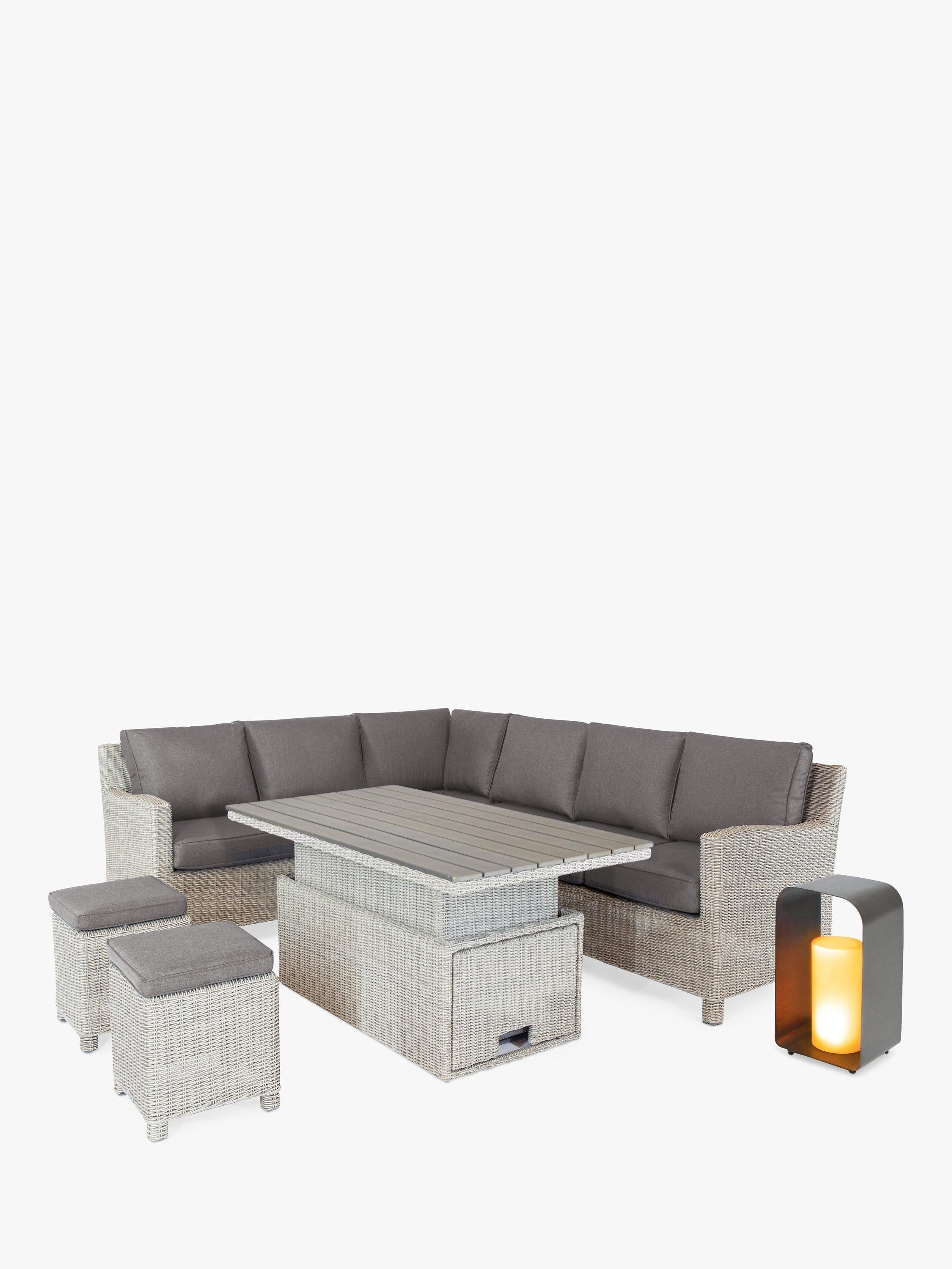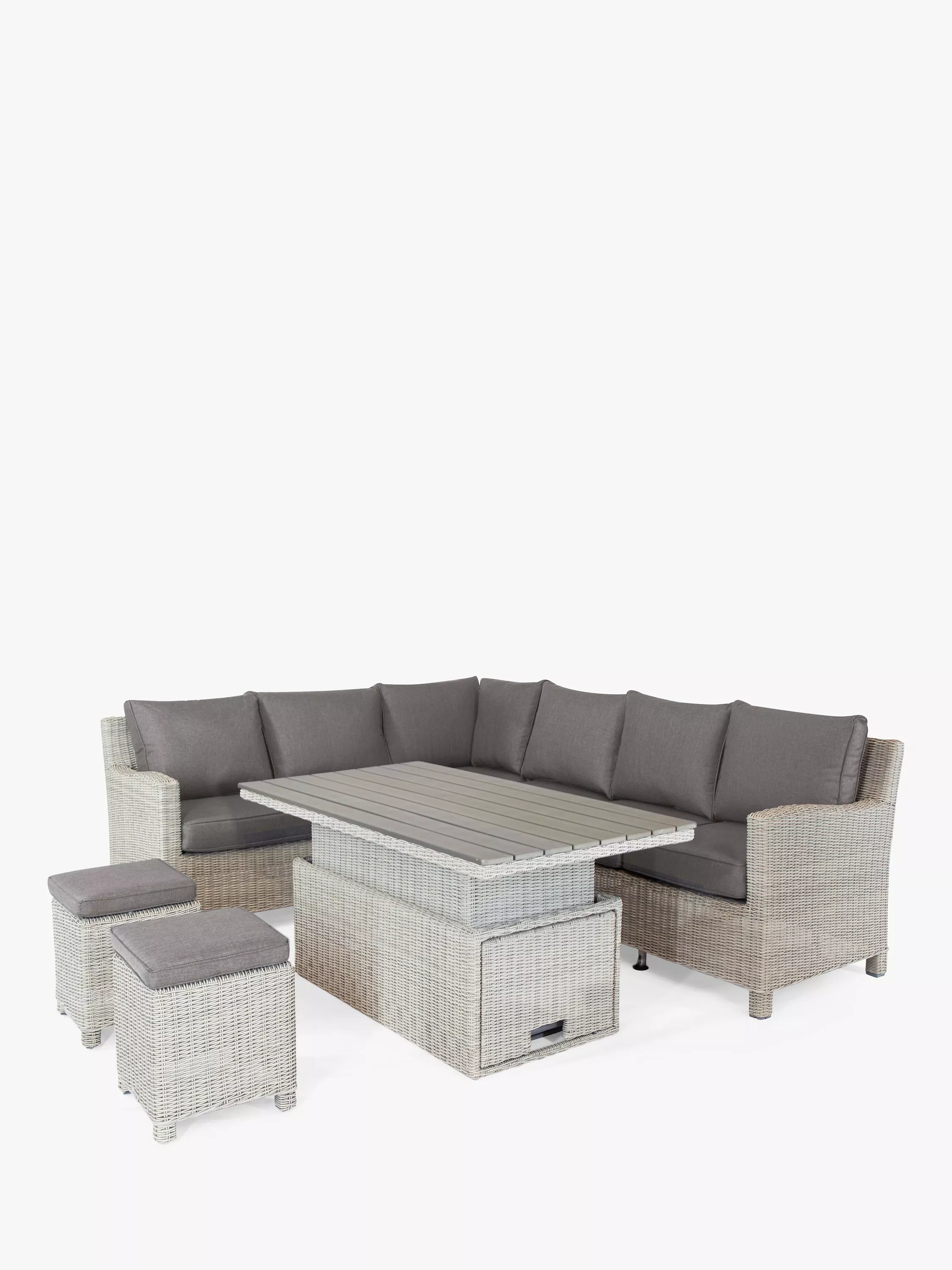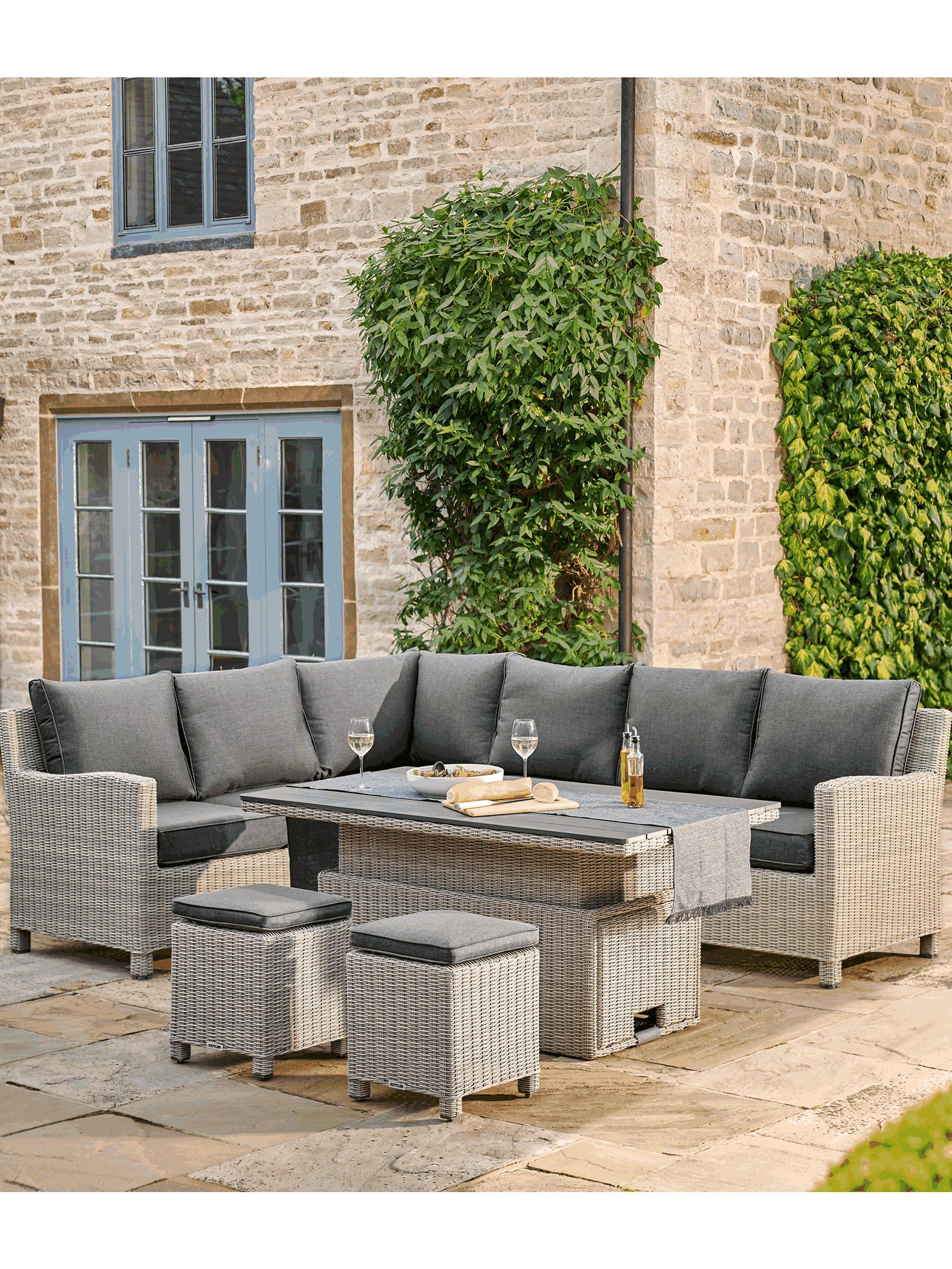 This roomy Palma set includes a six-seater corner sofa, two matching stools and a rectangular table that adjusts in height to take the set from relaxed lounging to casual dining. The table has a wood-effect slatted top which is weather-resistant.