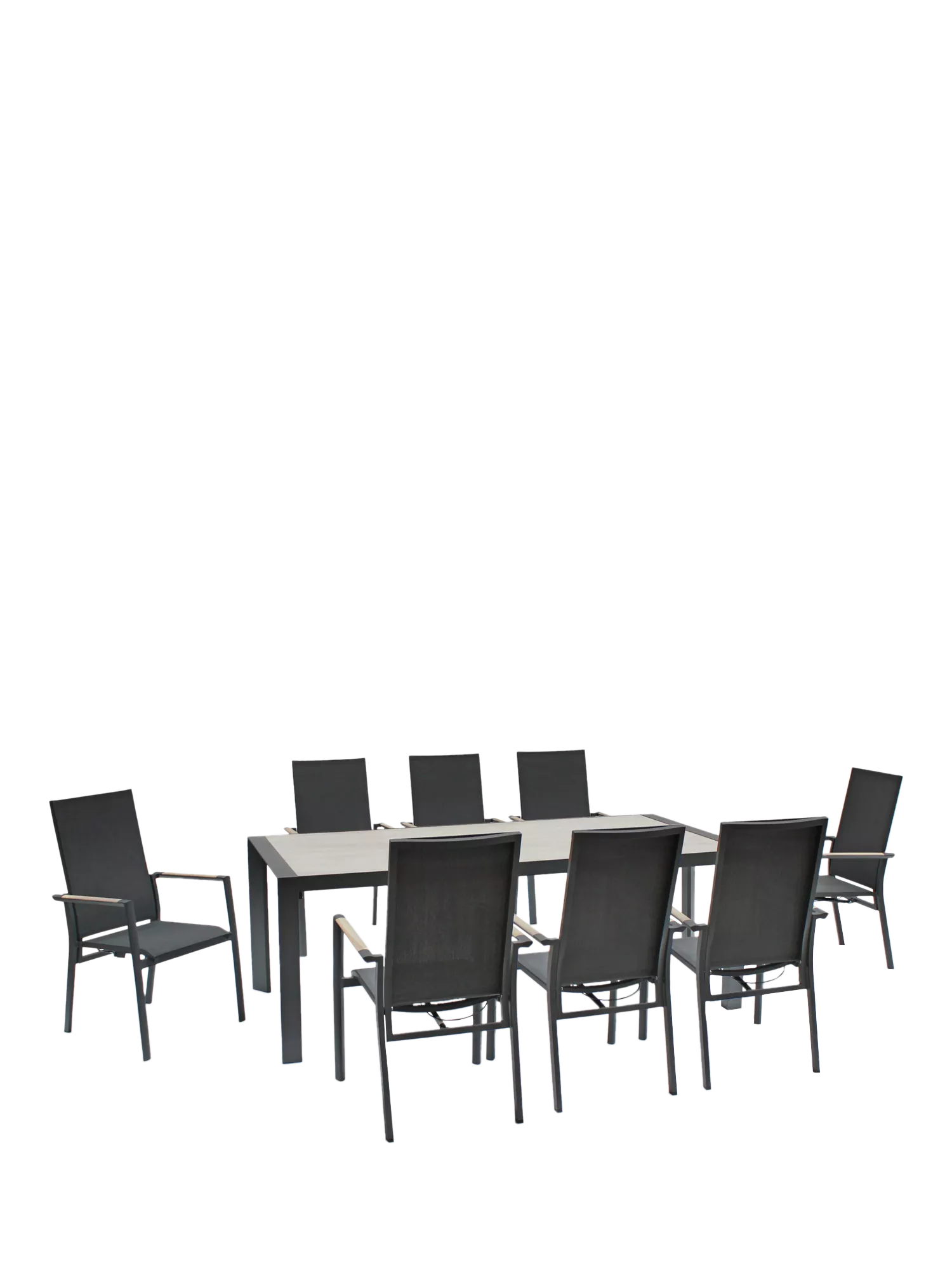 A modern design for the garden or conservatory, this Surf Active dining set from KETTLER includes eight reclining armchairs and a spacious rectangular dining table. The frames are made of robust yet lightweight powder-coated aluminium. Responsibly sourced teak wood armrests match the slatted teak-effect glass tabletop.
