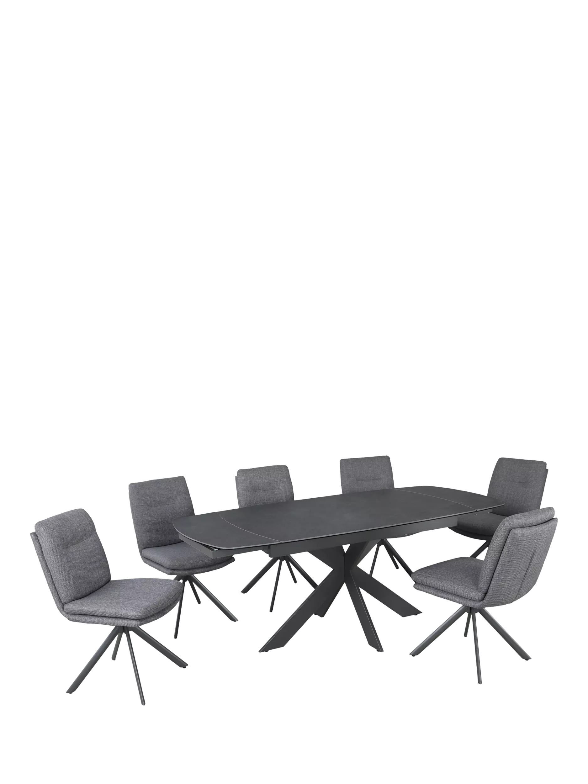 It's paired with six sleek and supportive Joey dining chairs, each featuring a smooth 180-degree swivel, supportive cushioning and a stain-resistant fabric. This set delivers the perfect balance of practical design and contemporary comfort for today’s family homes.