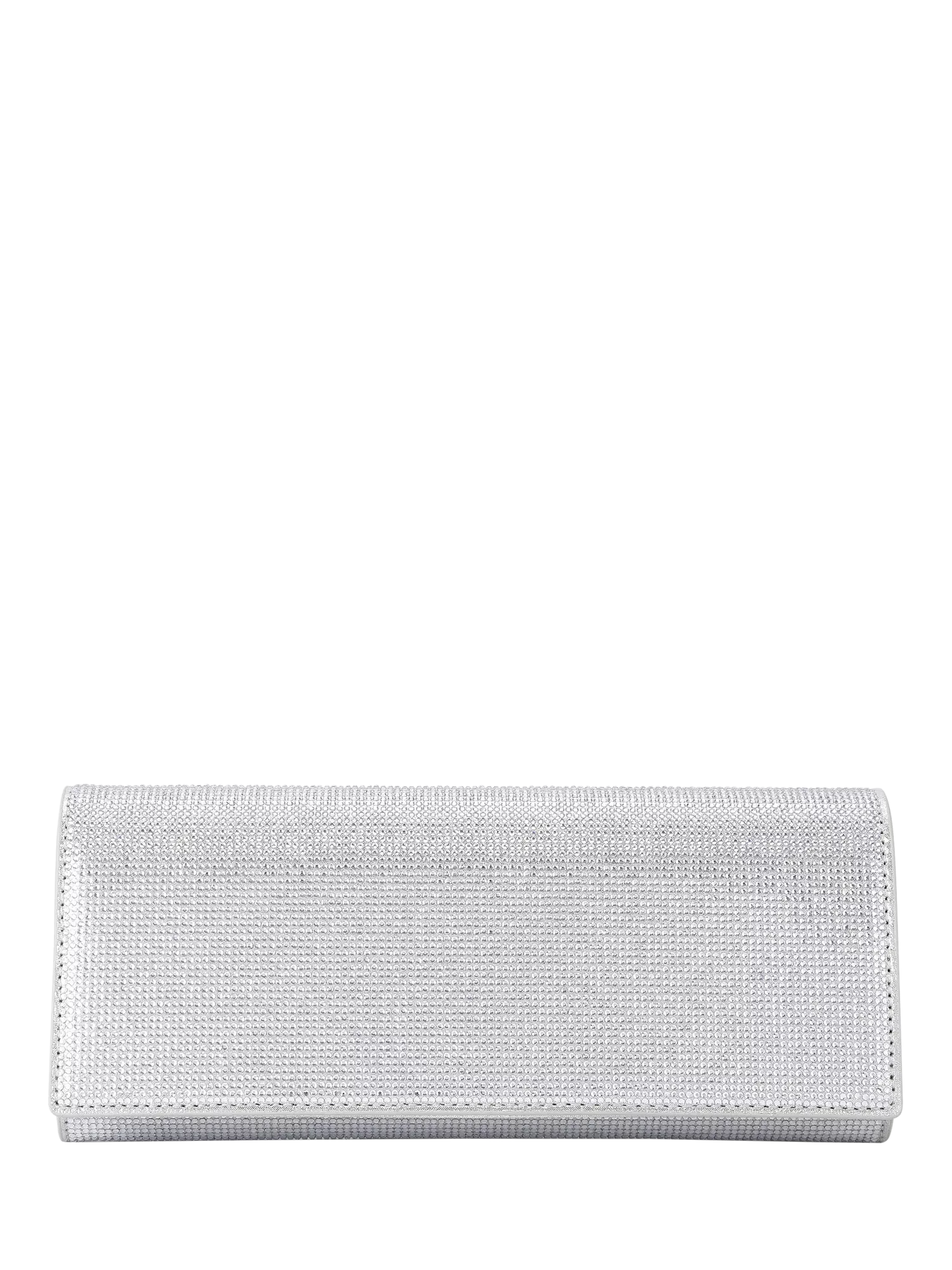 The KG Kurt Geiger Baily is an elongated clutch bag crafted from a silver fabric with crystal embellishment. There is a small KG Kurt Geiger pin stud on the back of the bag.