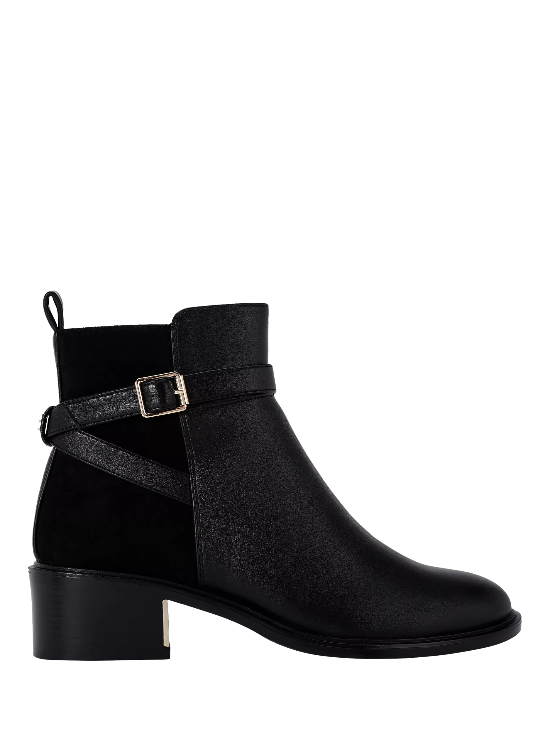 This Helen ankle boot from KG Kurt Geiger features a black upper with a microsuede panel on the heel. There is a strap around the ankle with a gold-tone buckle.