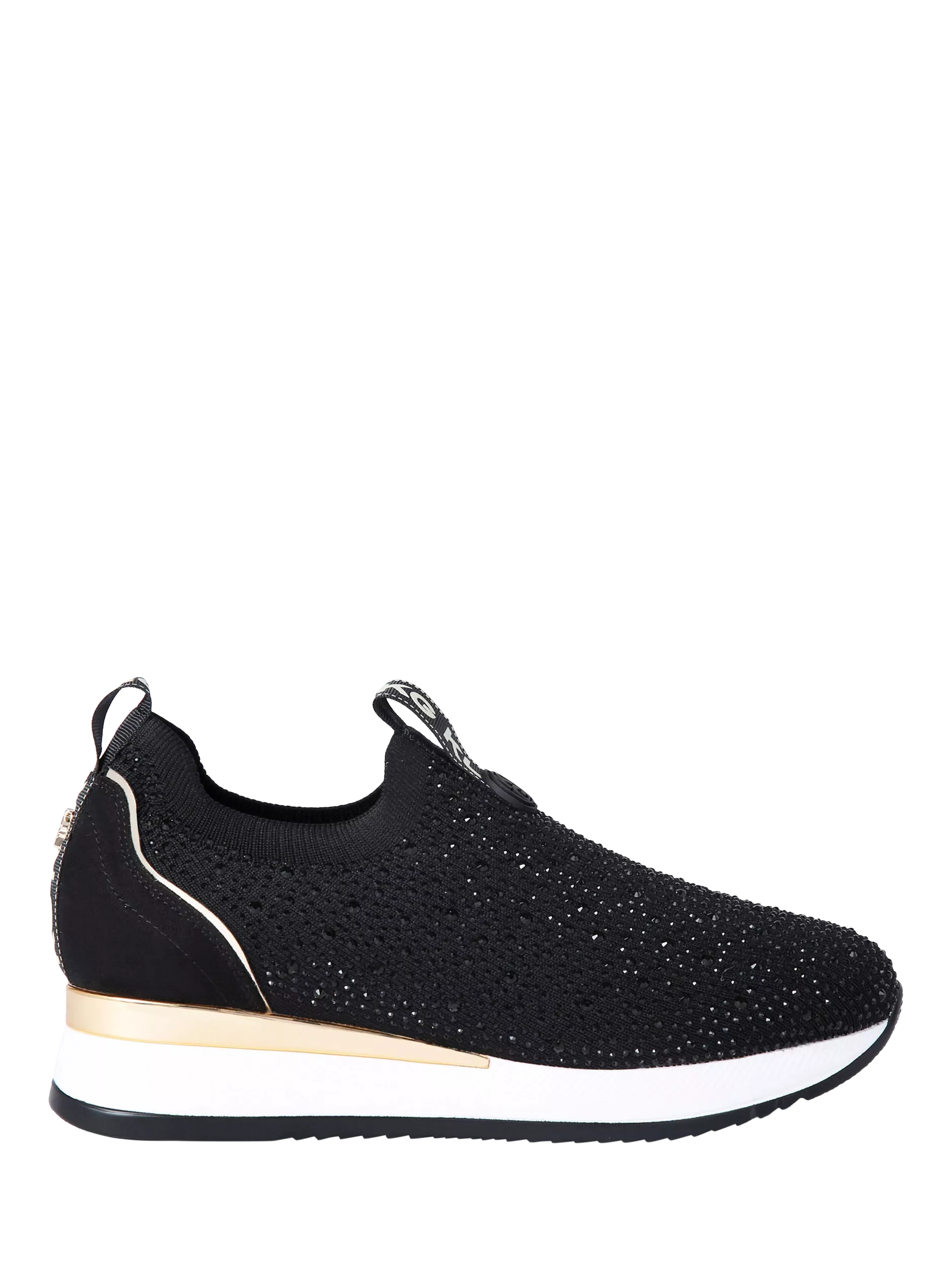 The Lara from KG Kurt Geiger is a sock-style trainer with black crystal embellishment across the upper. There are two black and white KG Kurt Geiger printed tabs and a rubber branded logo at the ankle.