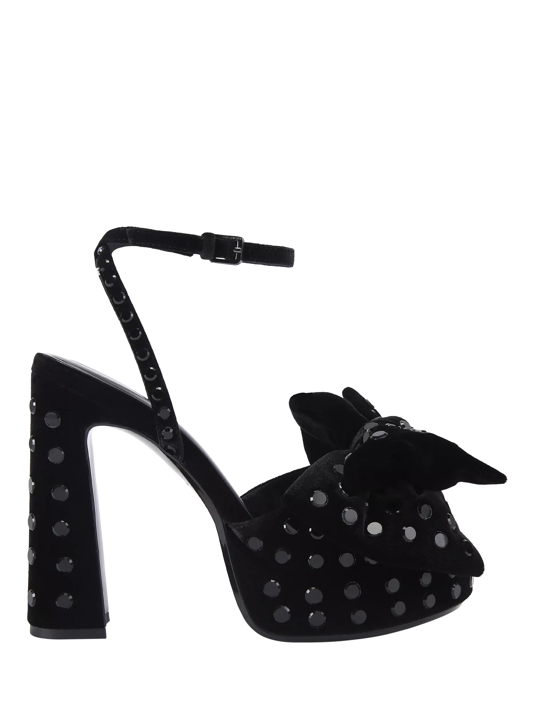 These embellished Style heels are available in a variety of finishes with embellished detailing. The statement sandal silhouette is completed with large bows across each of the open toes.