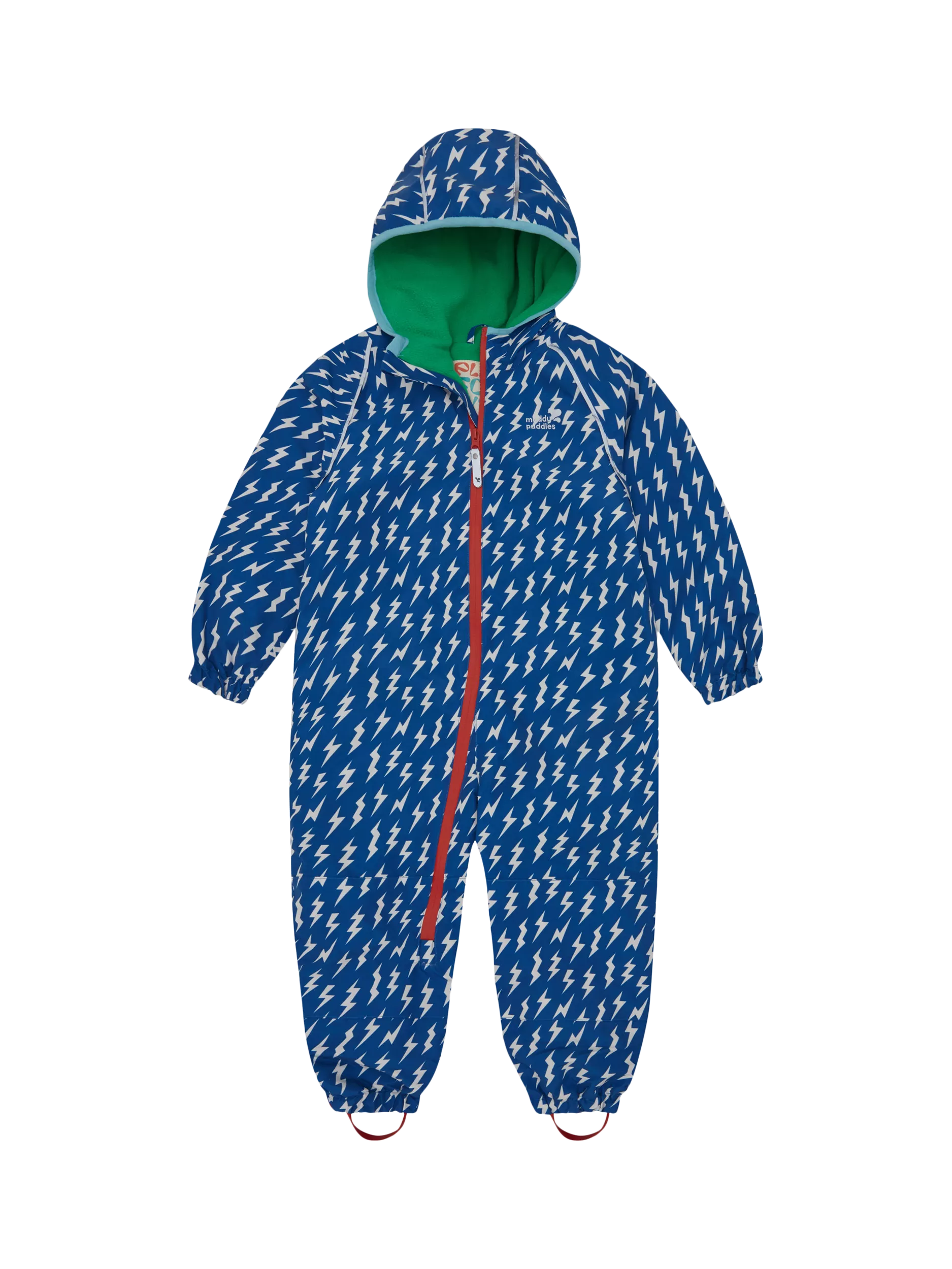 This all-in-one suit in a striking blue lightning print is fully waterproof to 10,000mm. A warm fleece-lined hood and body keep little adventurers cosy, while the breathable outer, taped seams and fluorine-free coating help keep rain and wind at bay. Reflective details improve visibility, and an extra-long zip makes dressing easy. With elasticated cuffs, adjustable stirrups and removable booties for babies, it’s machine-washable and easy to layer for versatile, year-round use.
