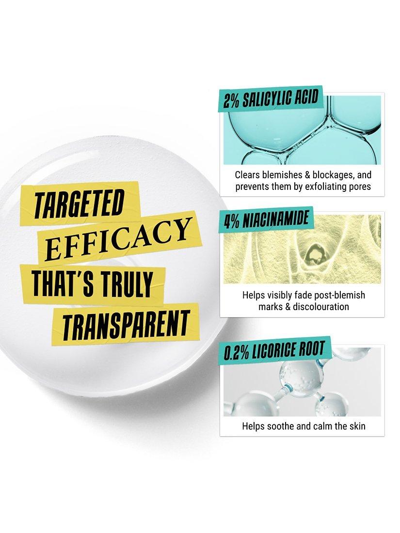 Concentrated with 2% Salicylic Acid, 4% Niacinamide and 0.2% Licorice Root, our formula targets the causes of blemishes, as well as calming and fading post-mark discolouration.