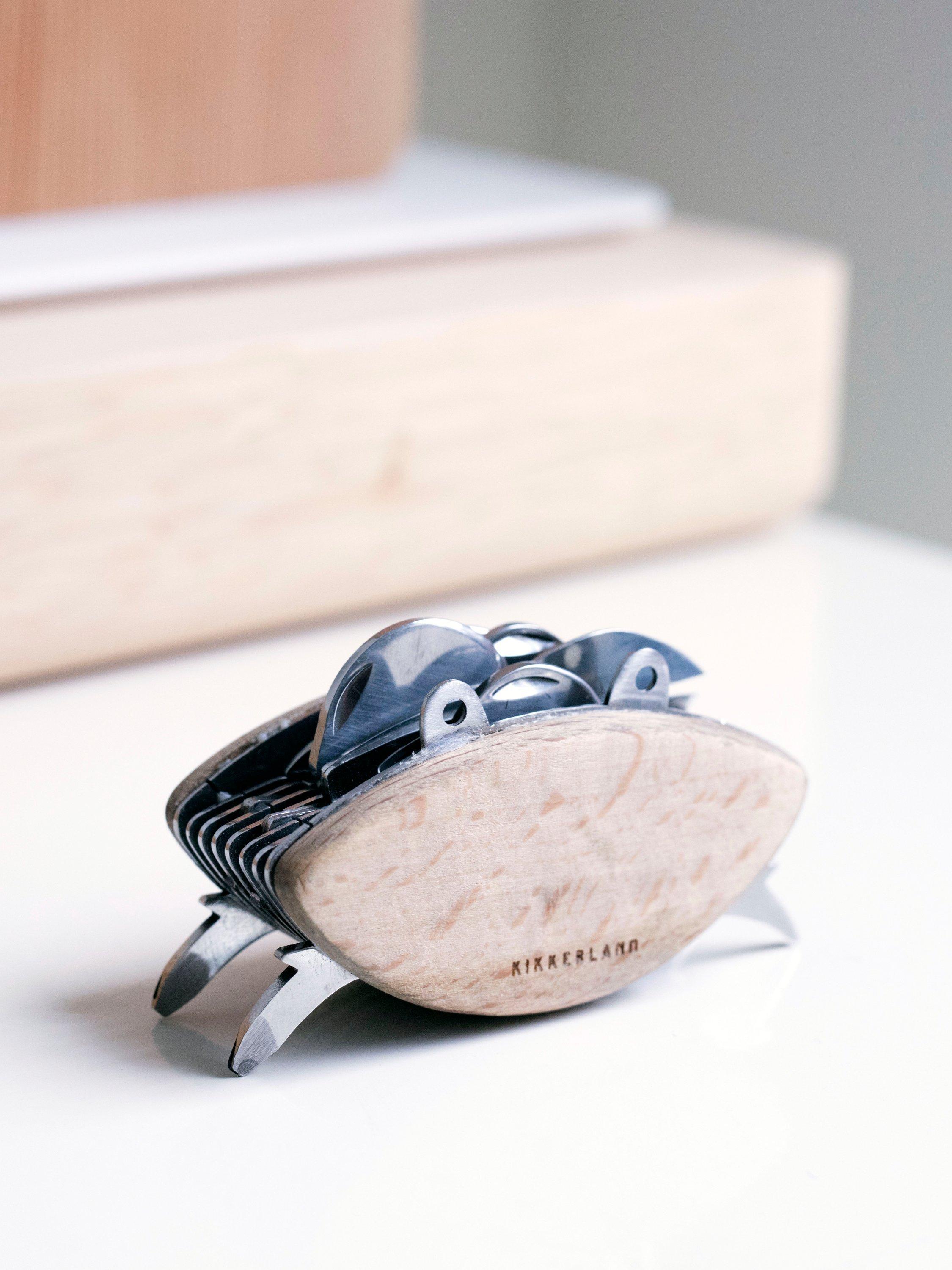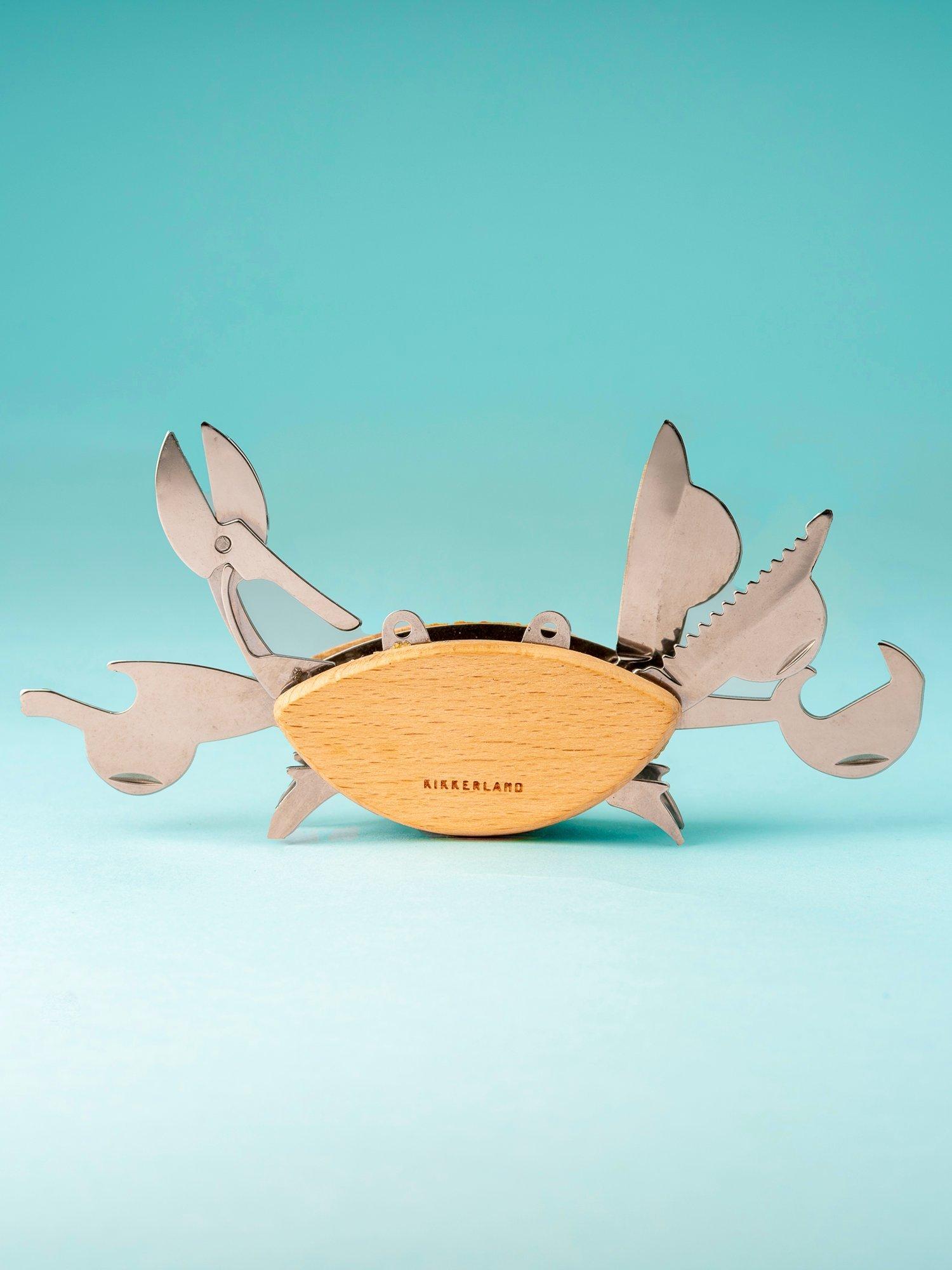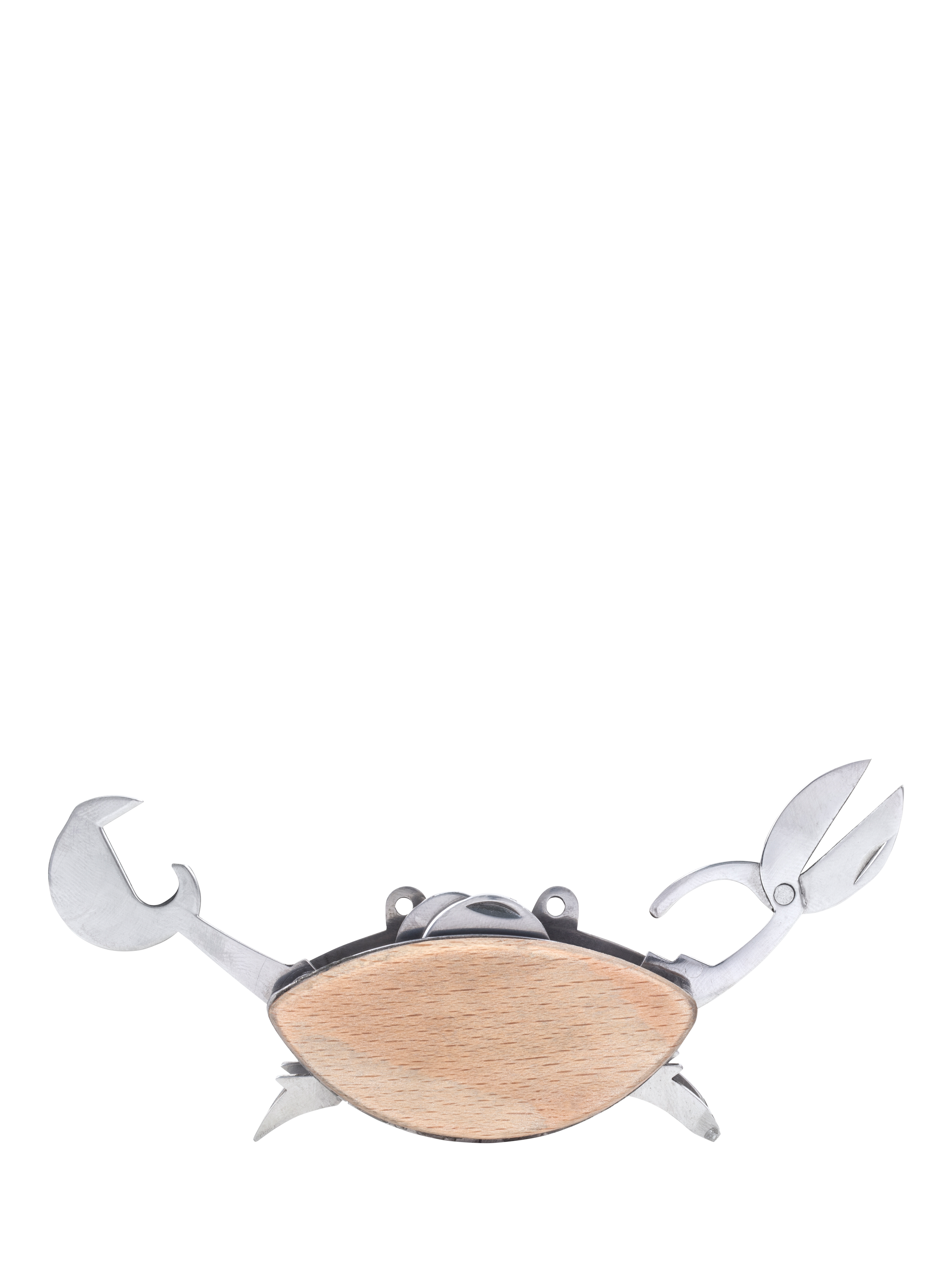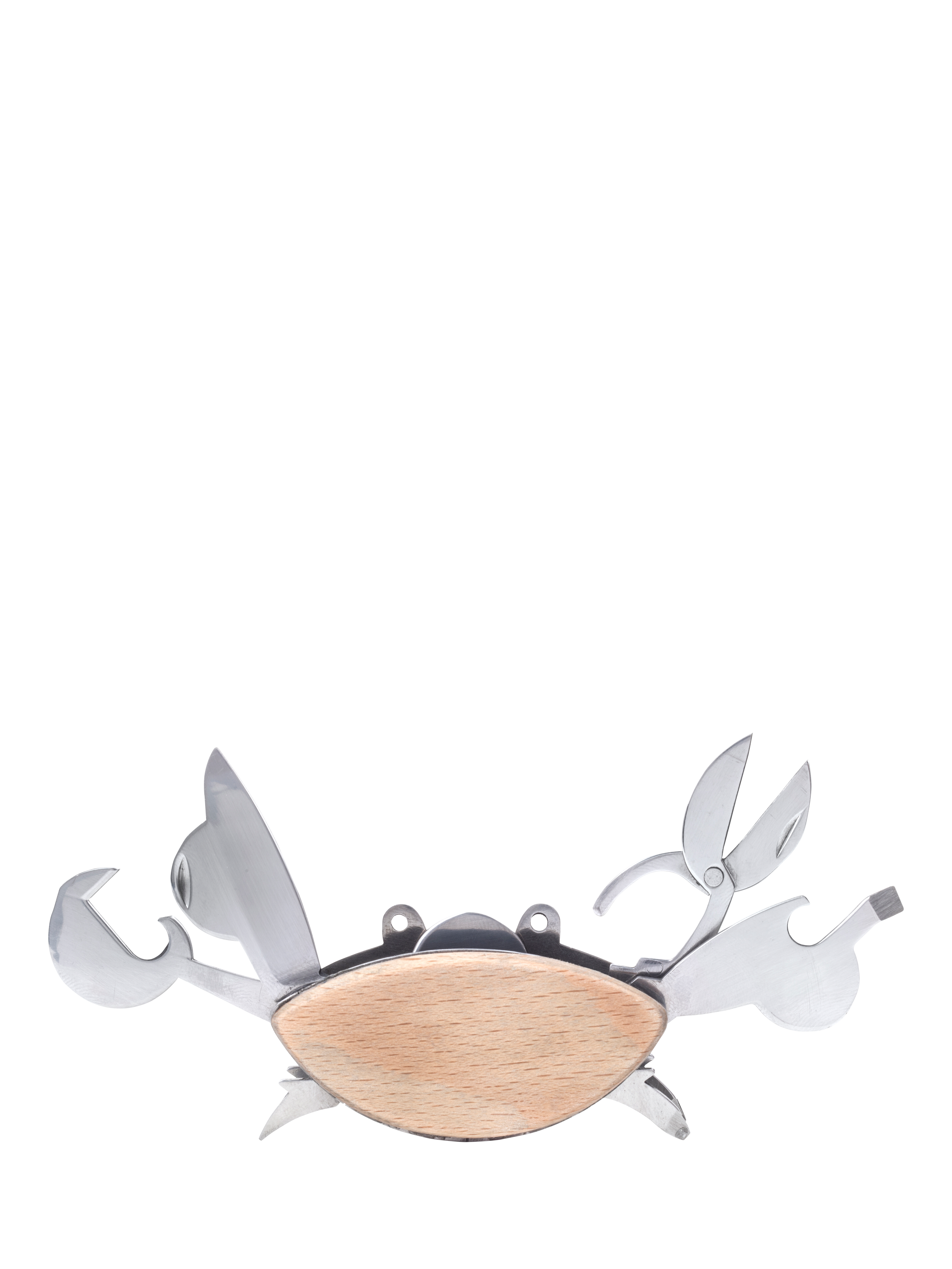 At the beach or on the go, this crab just wants to lend a helping claw. Grip his sturdy beechwood shell to utilize any one of his helpful stainless steel appendages. Comes with a mini scissor, bottle opener, 3/16 flat head screwdriver, can opener, mini knife, and rope saw.