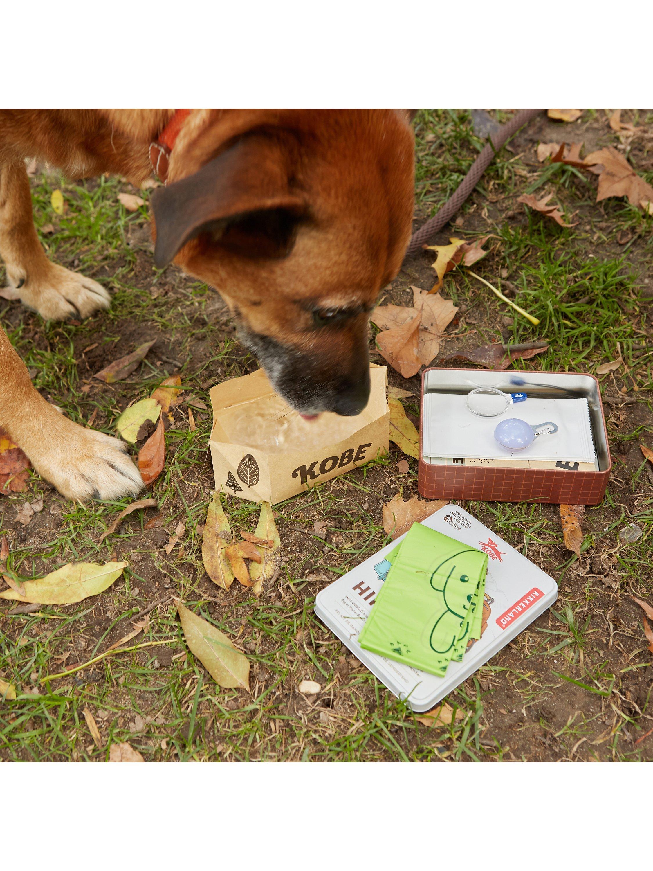 A hiking kit designed for your dog. Includes biodegradable poop bags, wet wipes, dog light, paper water bowls, booklet, tick removal tool.