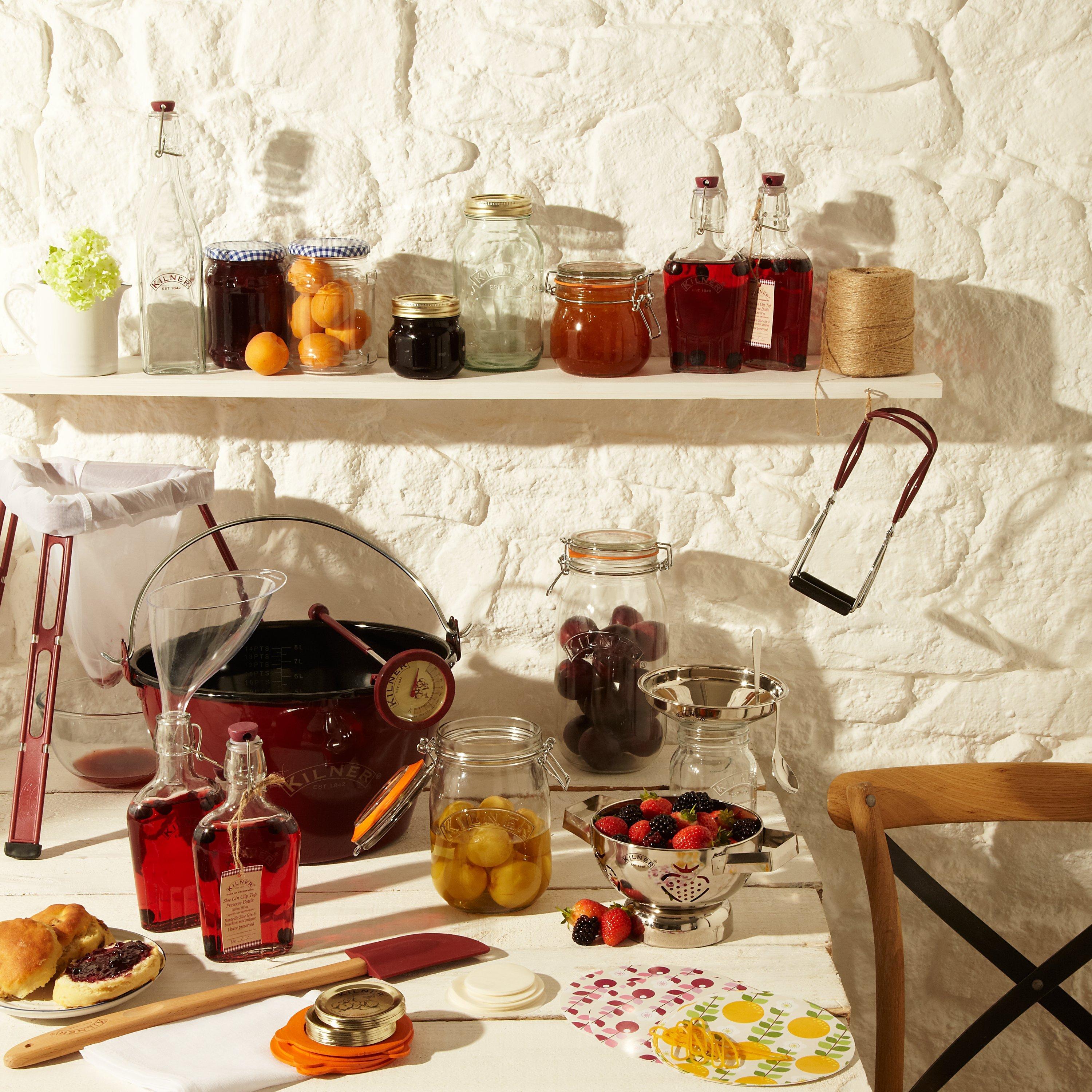 This new Kilner jelly straining kit has been specially designed to aid with straining pips and seeds when making clear jellies. It can also be used for making cream cheese and homebrew. This neat and simple device works by sitting over a bowl and allowing the liquid mixture to strain through the nylon bag. Easy to assemble and a space saving solution for storage. Contains a bag and stand.