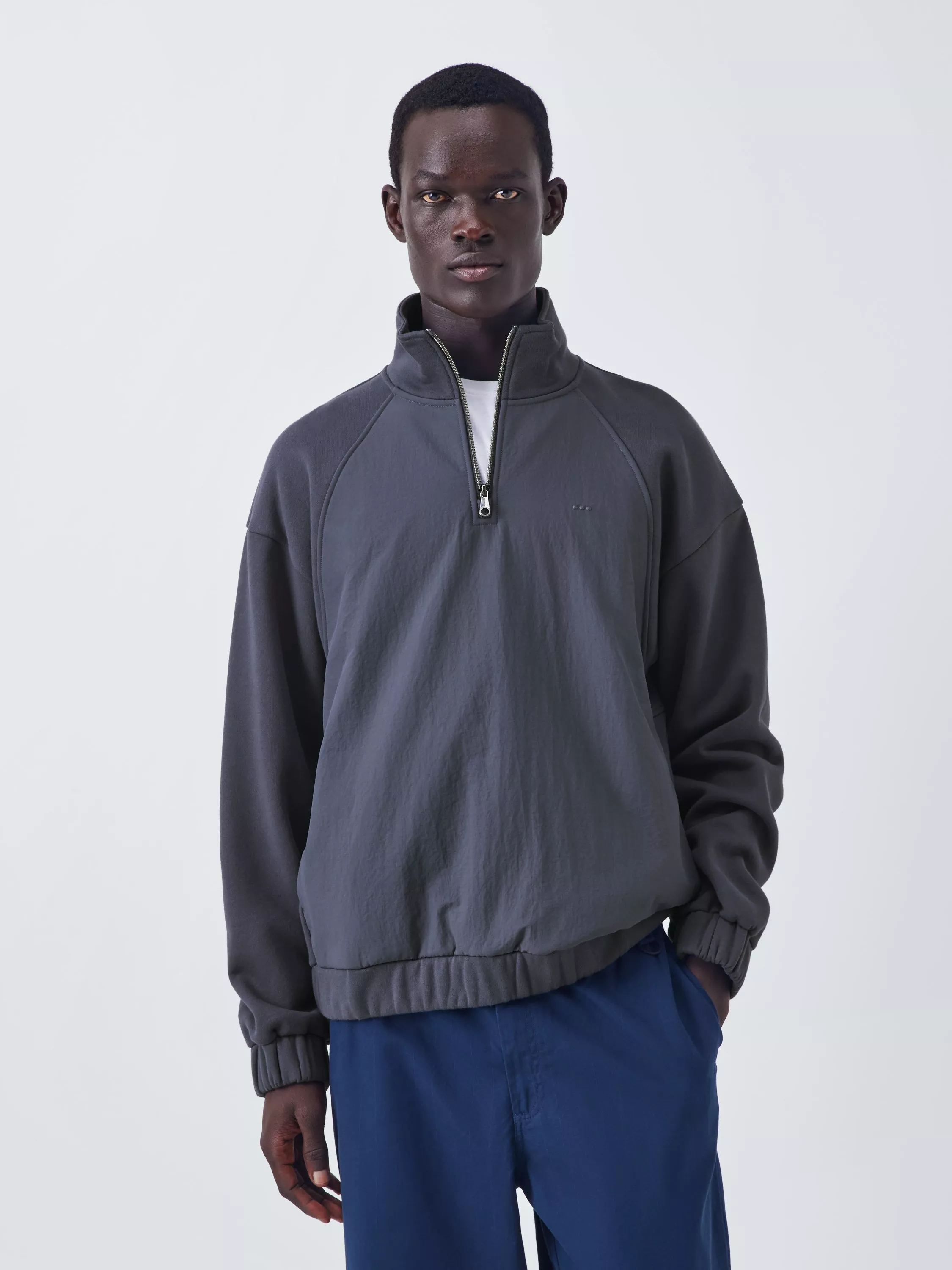 A simple yet stylish jumper with a middle nylon panel housing a big kangaroo pocket. Designed with a half-zip and high neck.