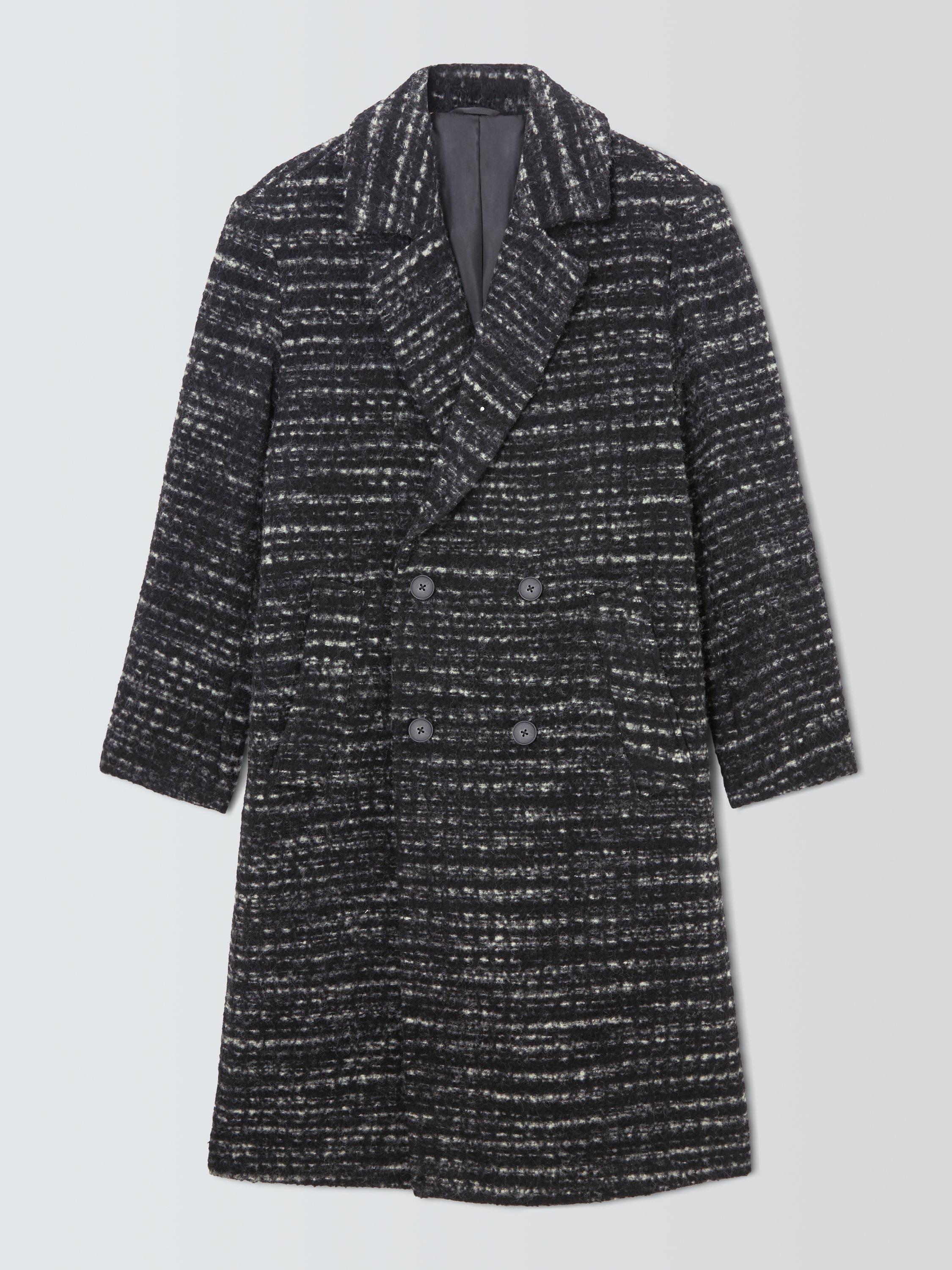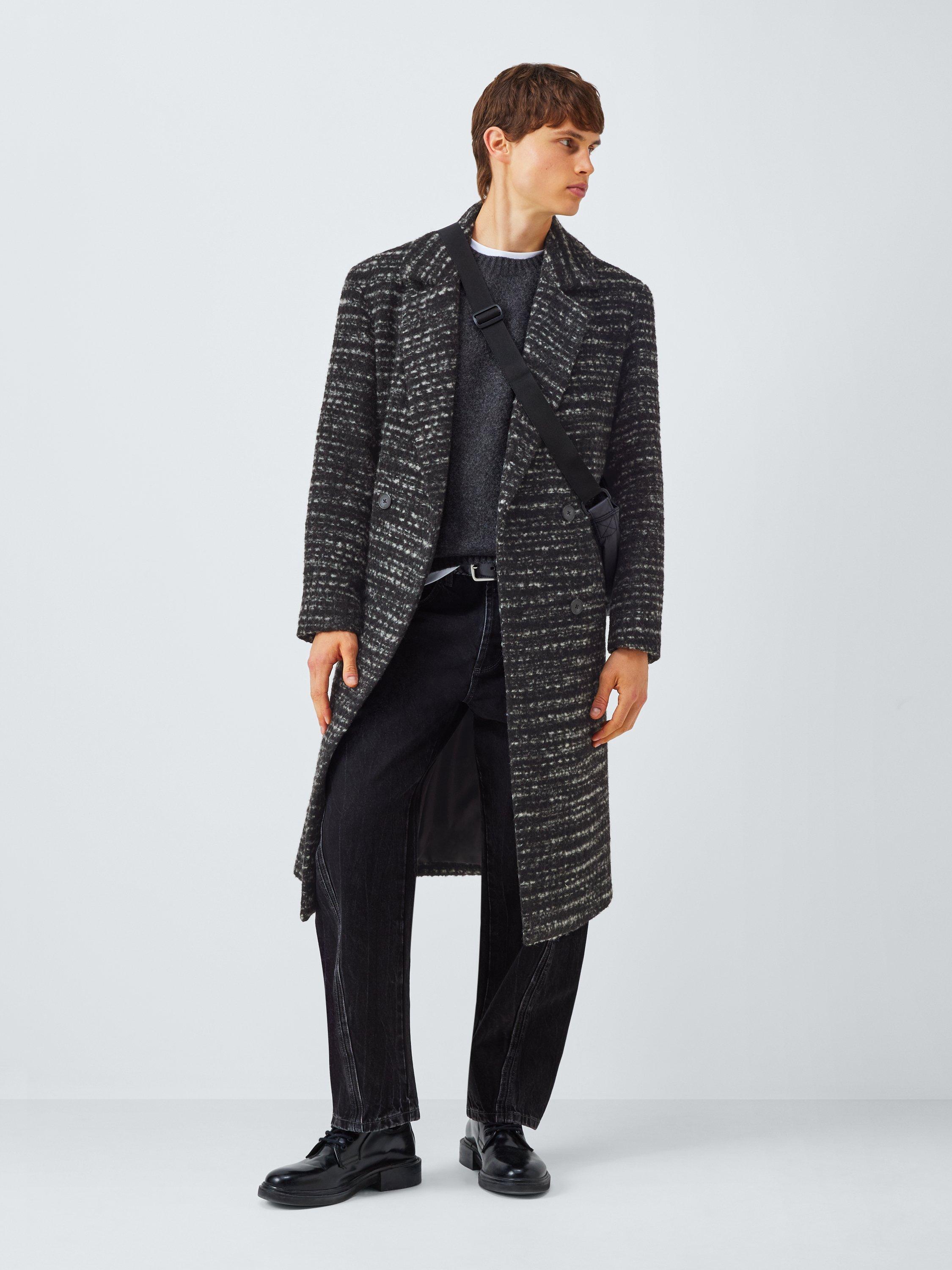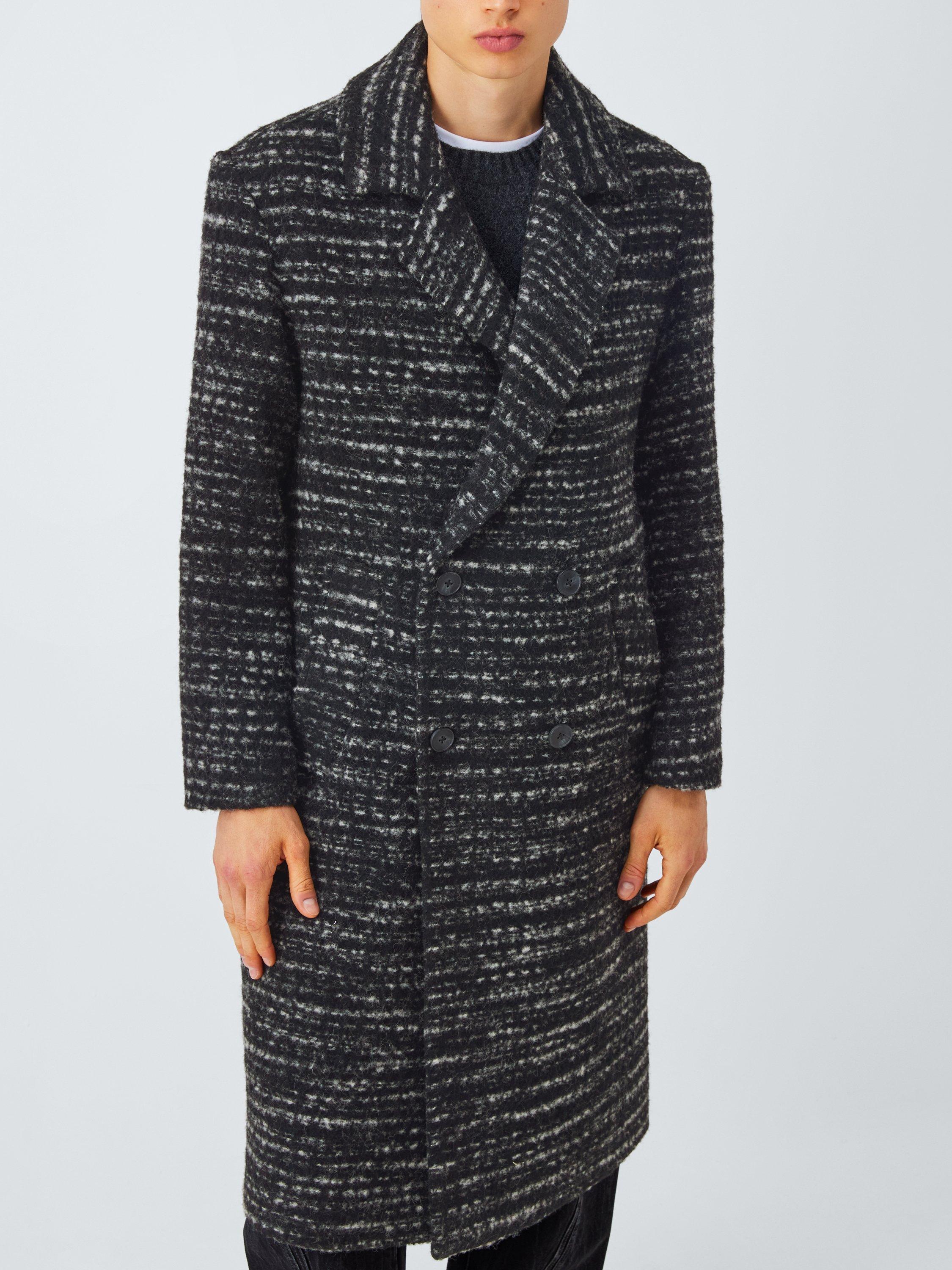 A long double-breasted coat with a contemporary take on a check pattern in a textured feel. Made with soft, warm wool in the blend, the coat is lined for comfort and has two side pockets and a large notch lapel collar.