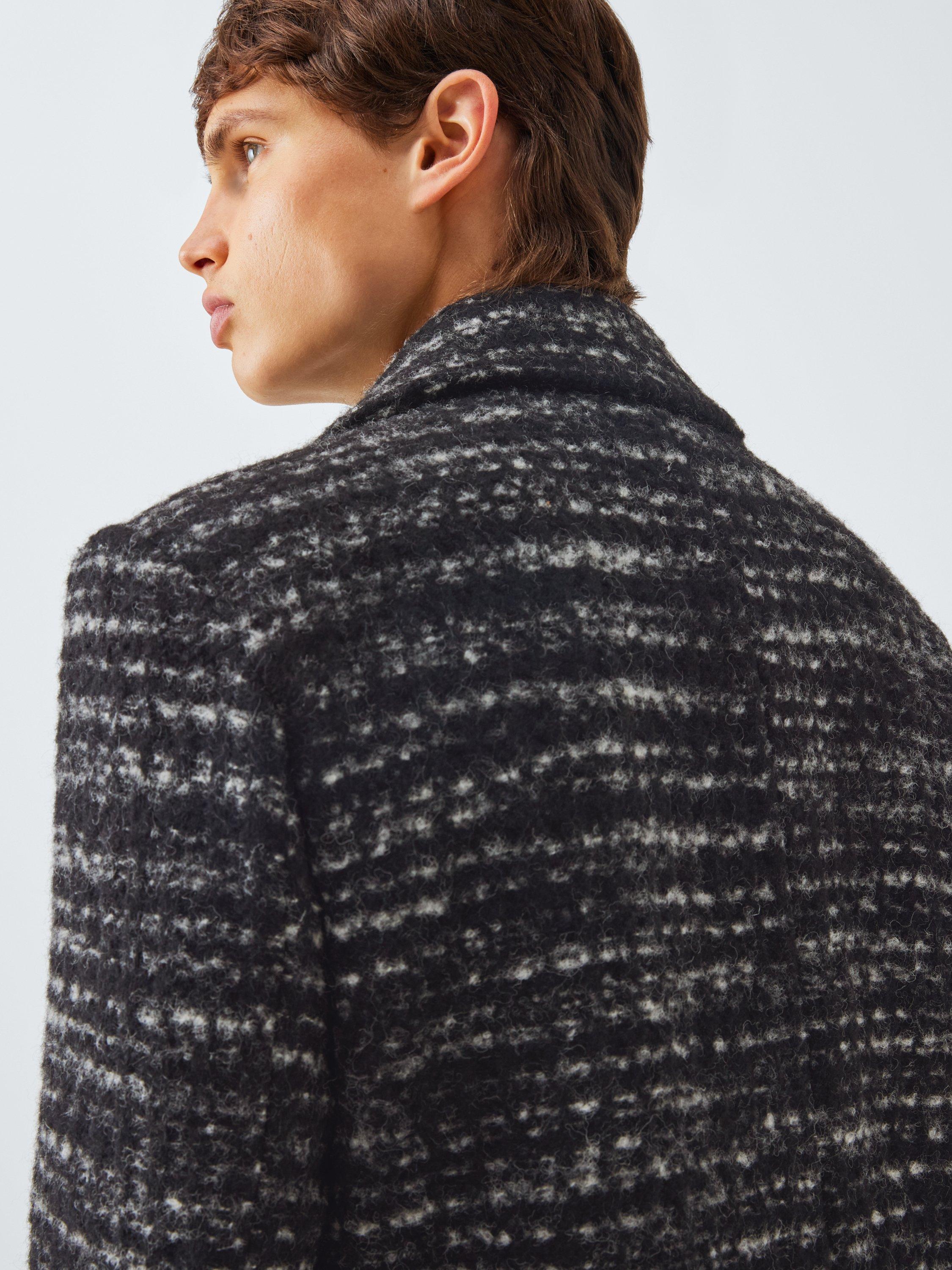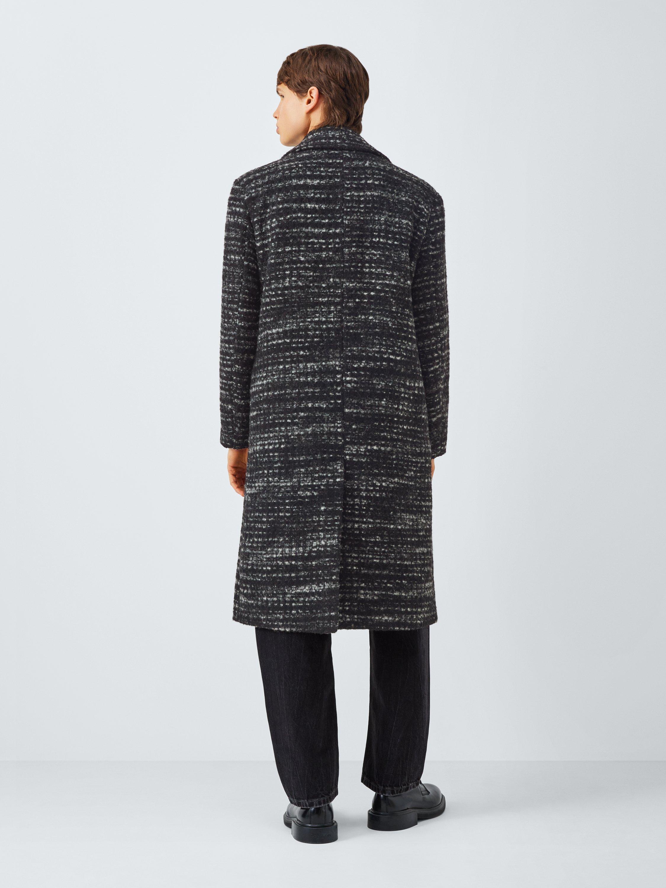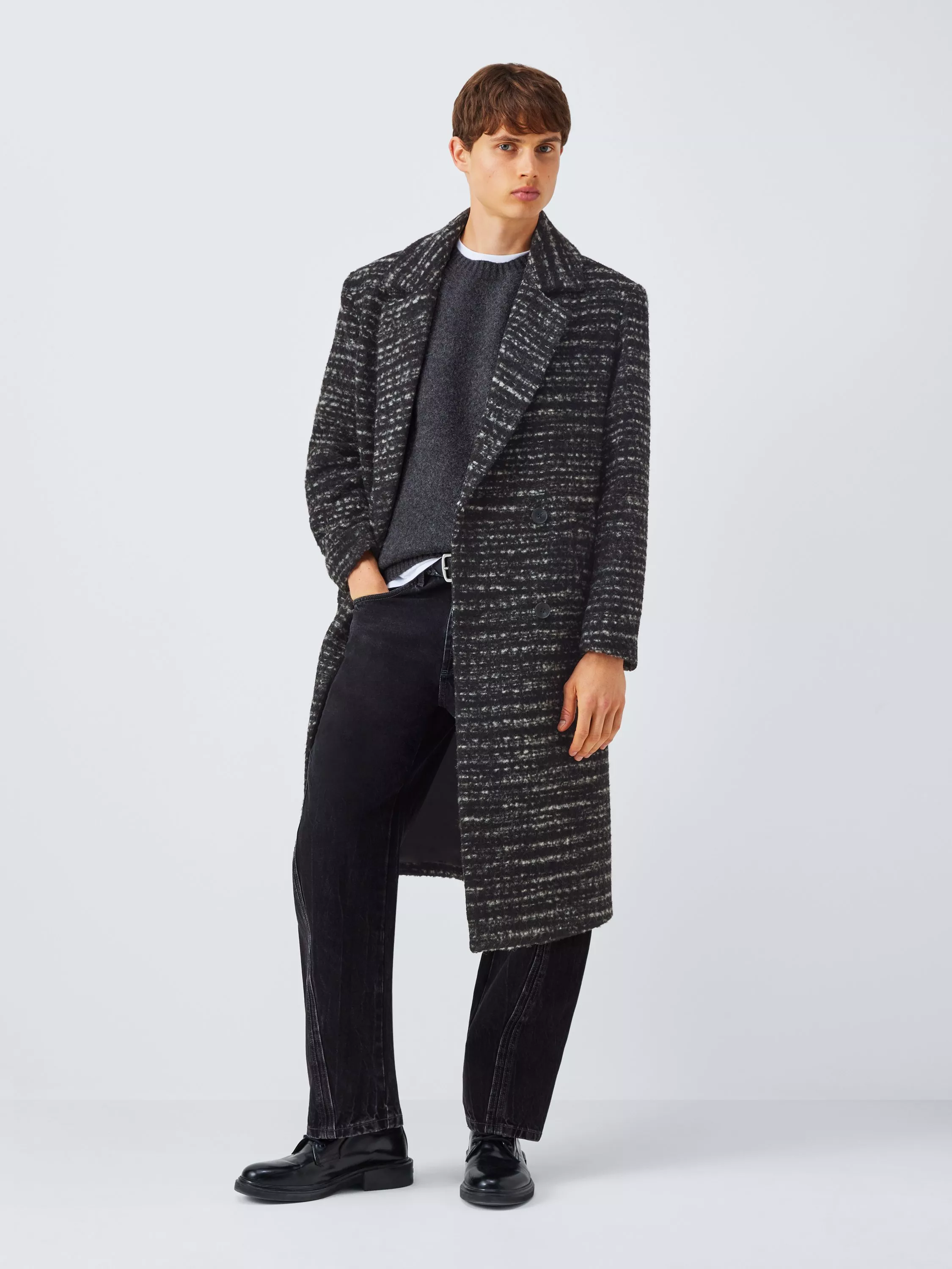 A long double-breasted coat with a contemporary take on a check pattern in a textured feel. Made with soft, warm wool in the blend, the coat is lined for comfort and has two side pockets and a large notch lapel collar.