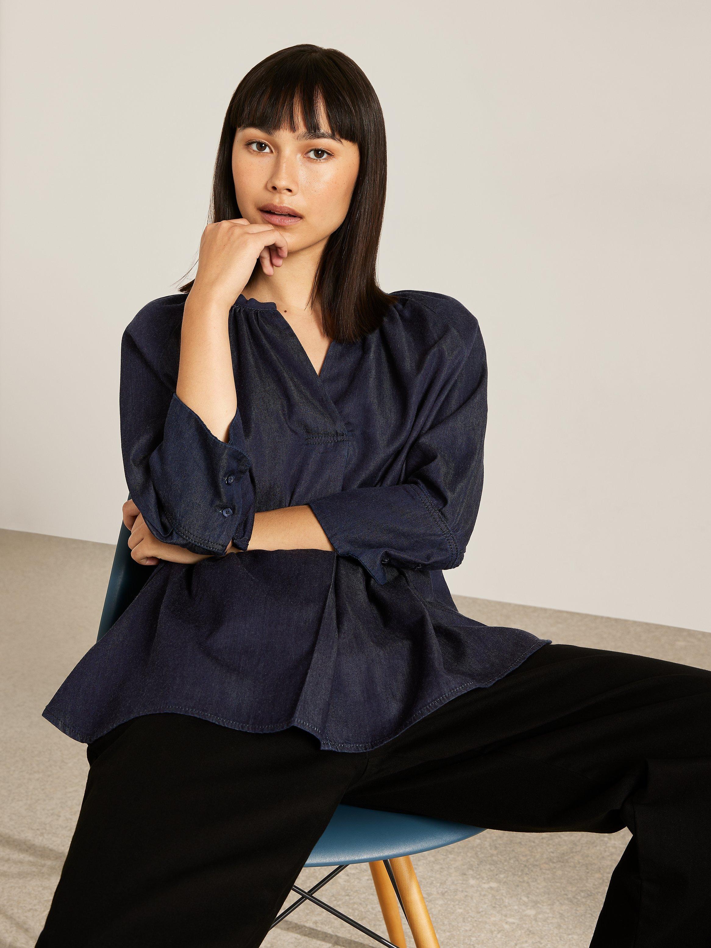 Made from soft tencel fibres blended with cotton, this Kin top has a gathered neckline for a modern, relaxed fit. Shaped with a curved stepped hem, the V-shaped detail at the neck and deep cuffs with poppers add structure to the soft silhouette.