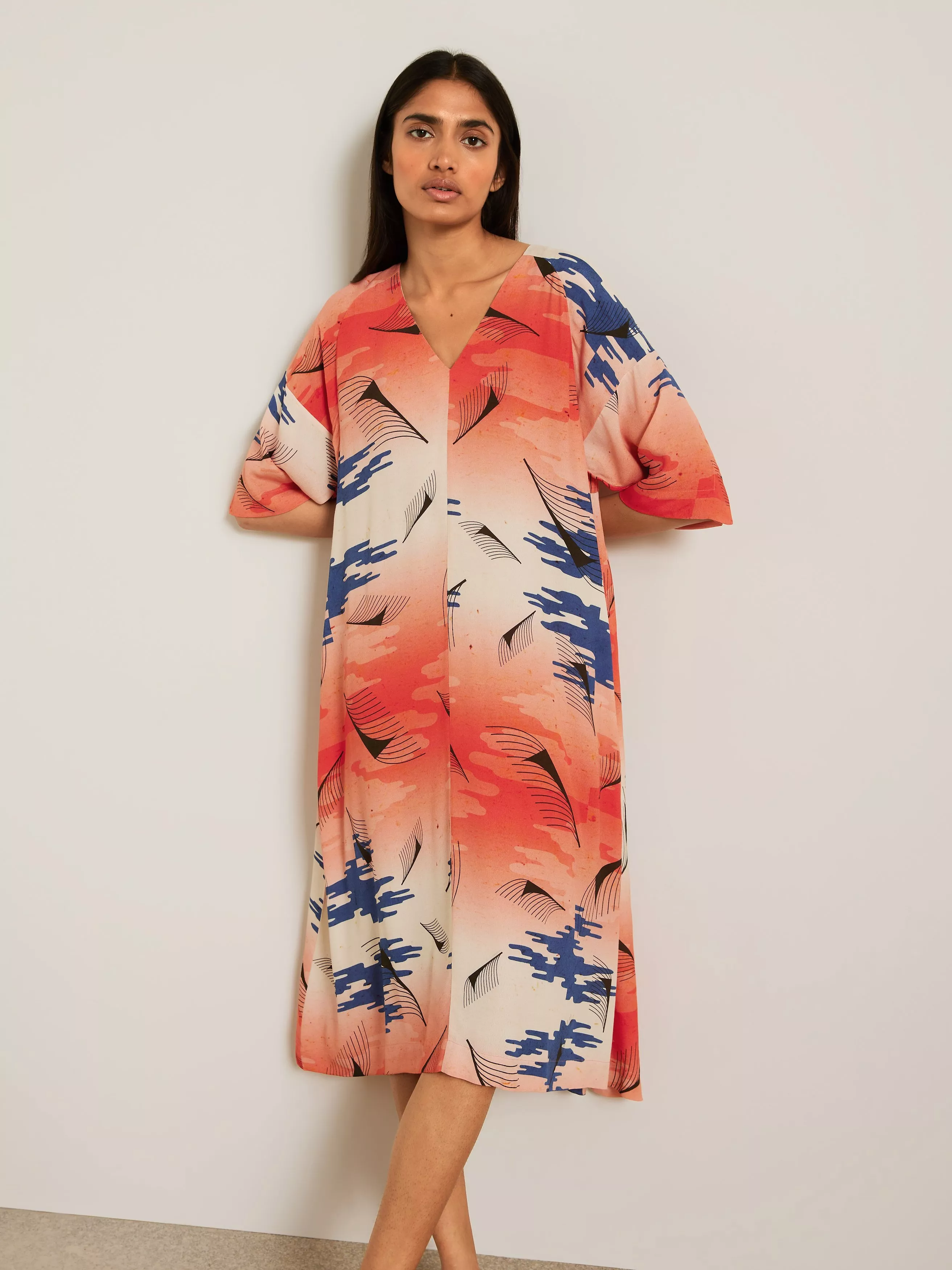 This soft printed dress is part of our collaboration with graphic designer Julmeme. Made from a blend of sustainable viscose, it has a simple silhouette with a V-shaped front and back, while the dropped shoulders add drape and fluidity throughout the piece.
