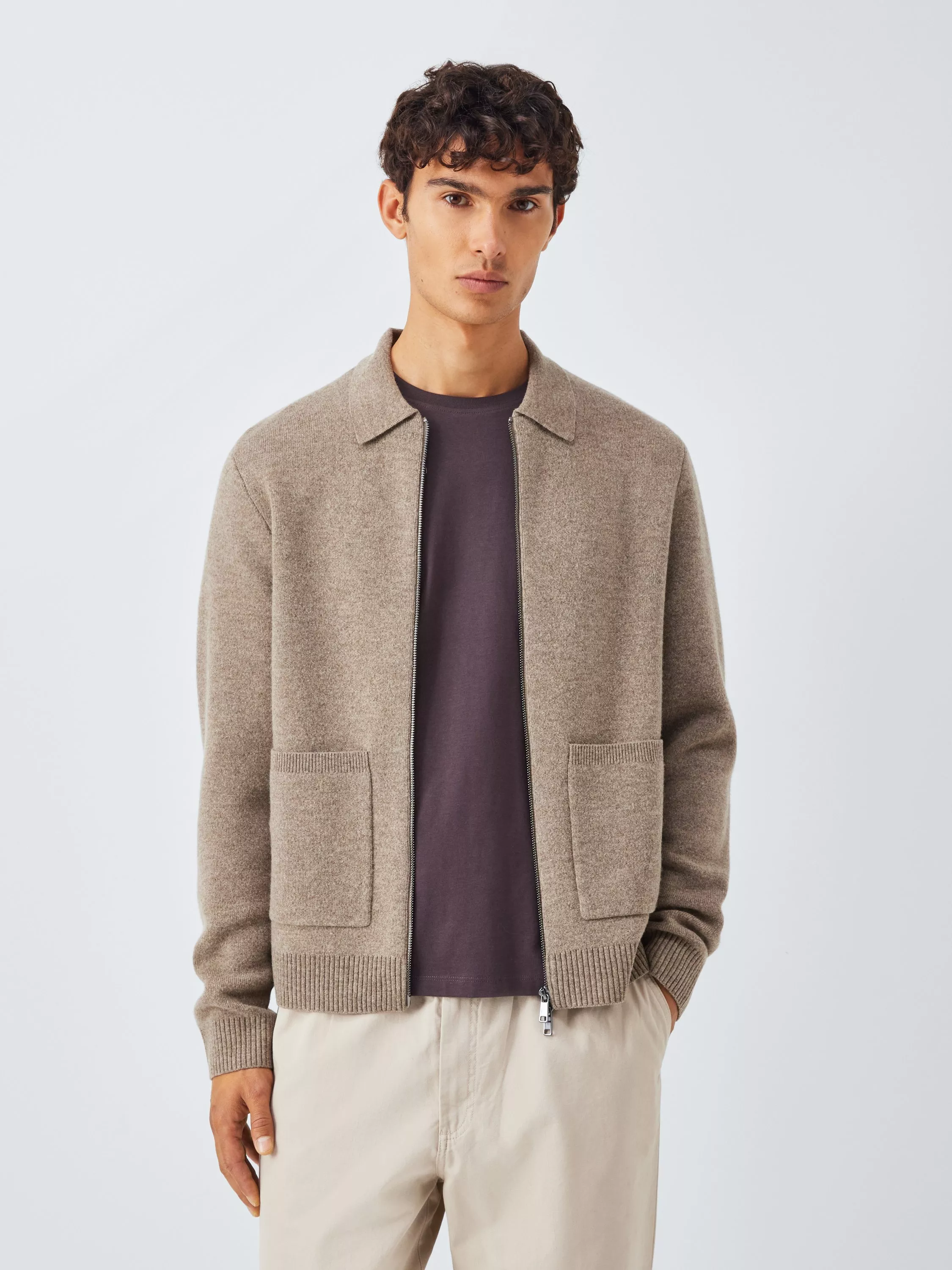 Zip-through cardigan with a collar, two-way zip, front patch pockets and a ribbed knit on the hem and cuffs. The fabric blend includes naturally temperature-regulating lambswool with nylon, which adds softness to the yarn.