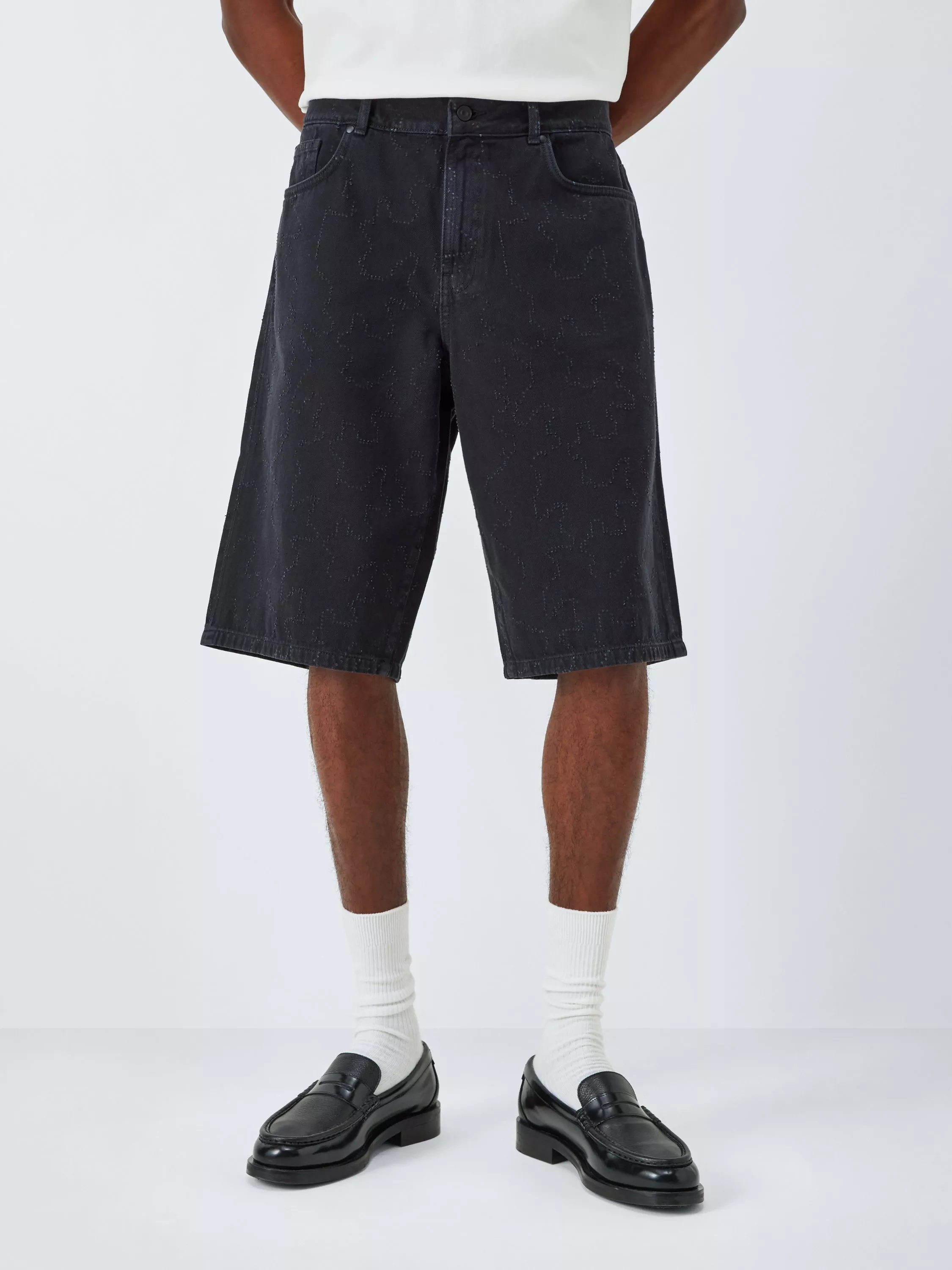 Cotton denim shorts, laser-engraved with a subtle decorative abstract pattern. Featuring two side pockets, back pockets, belt loops and a shank and zip fly fastening.