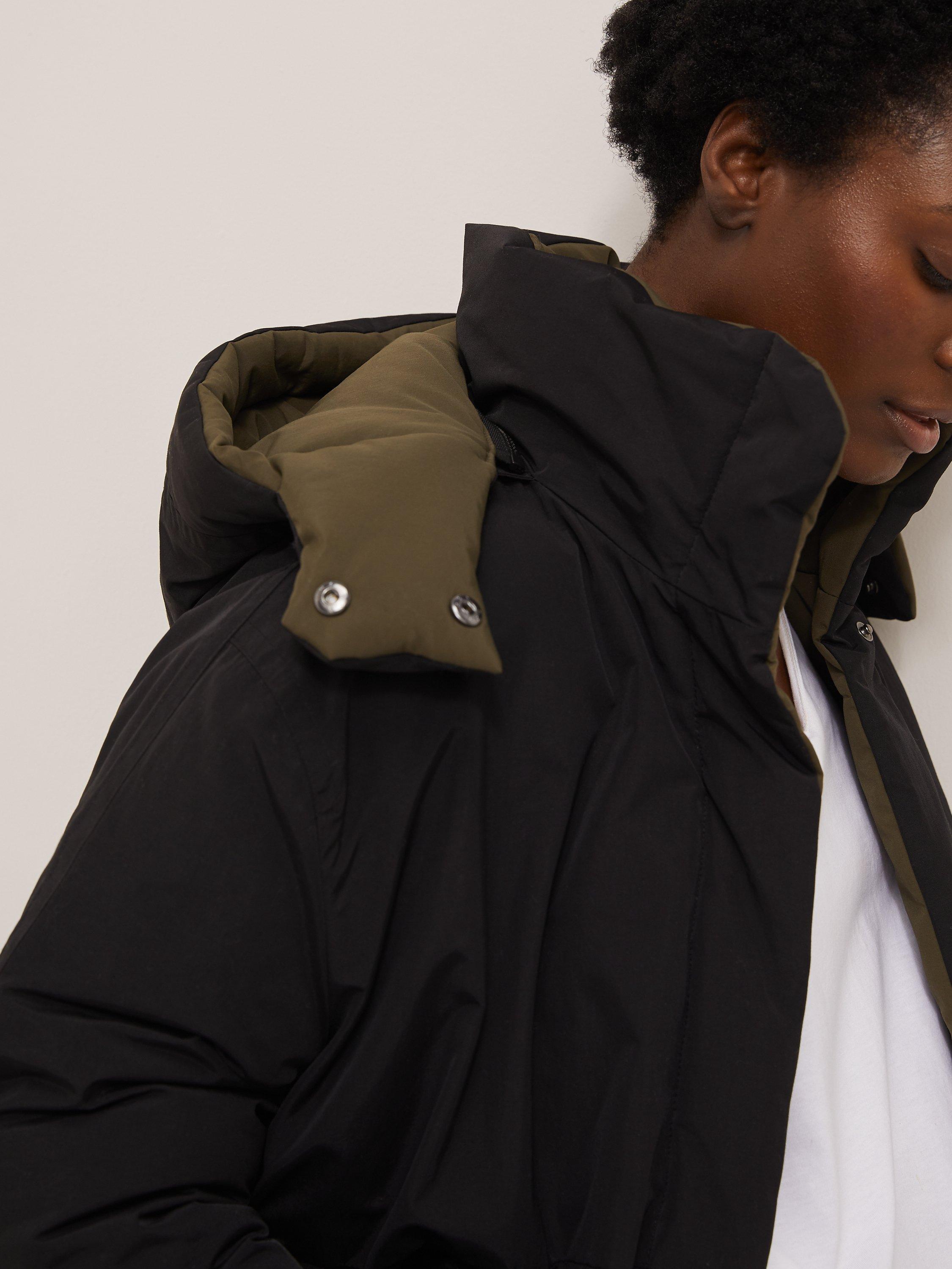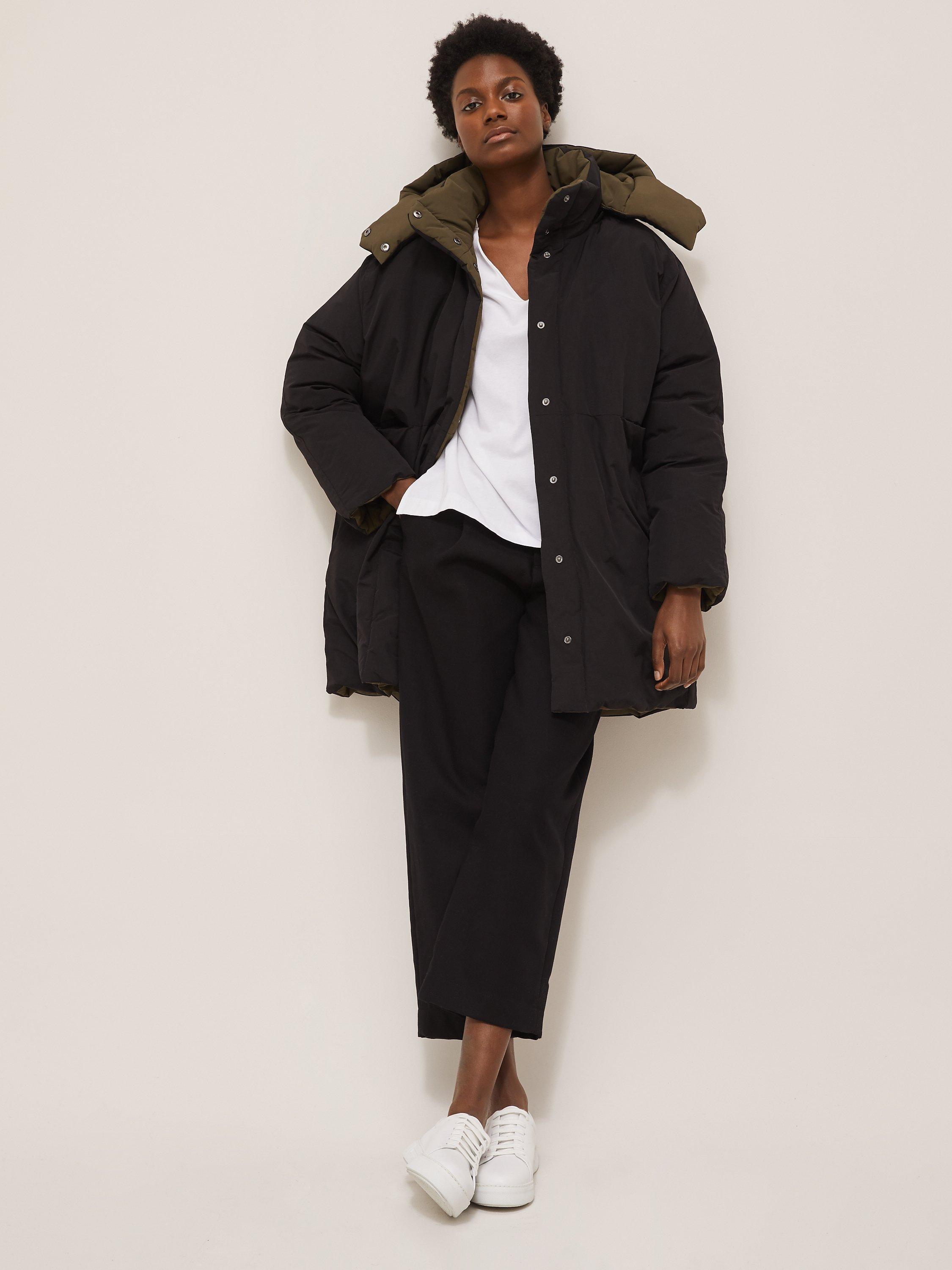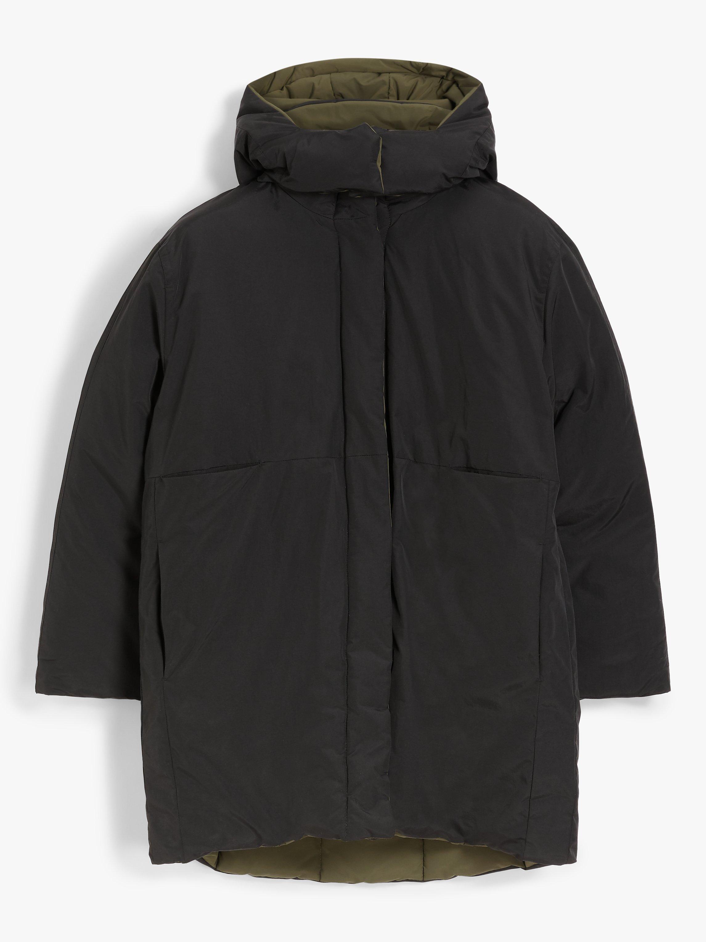 This reversible jacket from Kin features two versatile tones to mix and match. Easy to layer with relaxed dropped shoulder sleeves, it fastens with poppers and has a dipped back hem giving you more coverage and a detachable hood that sits behind a cosy funnel neck.
