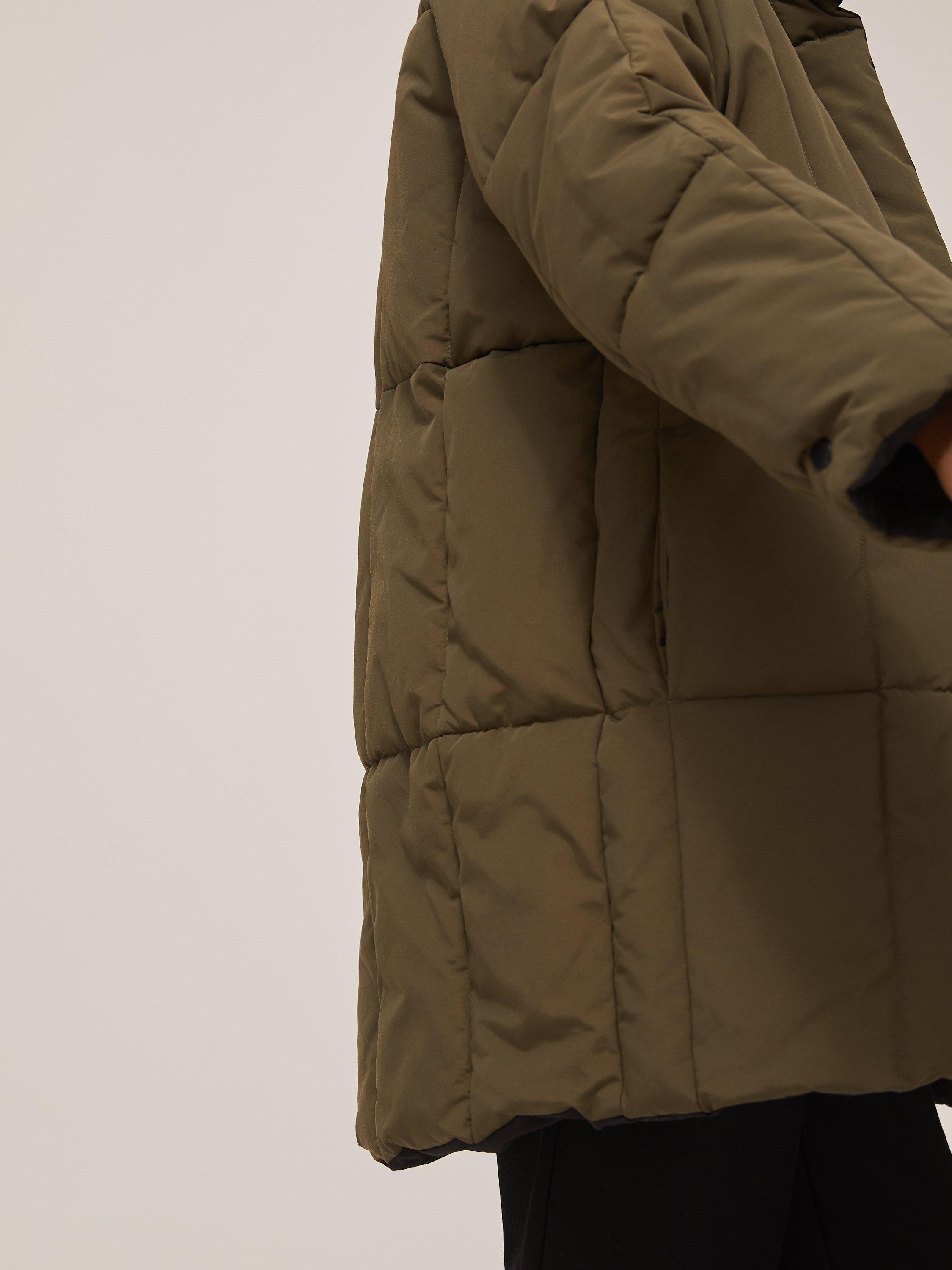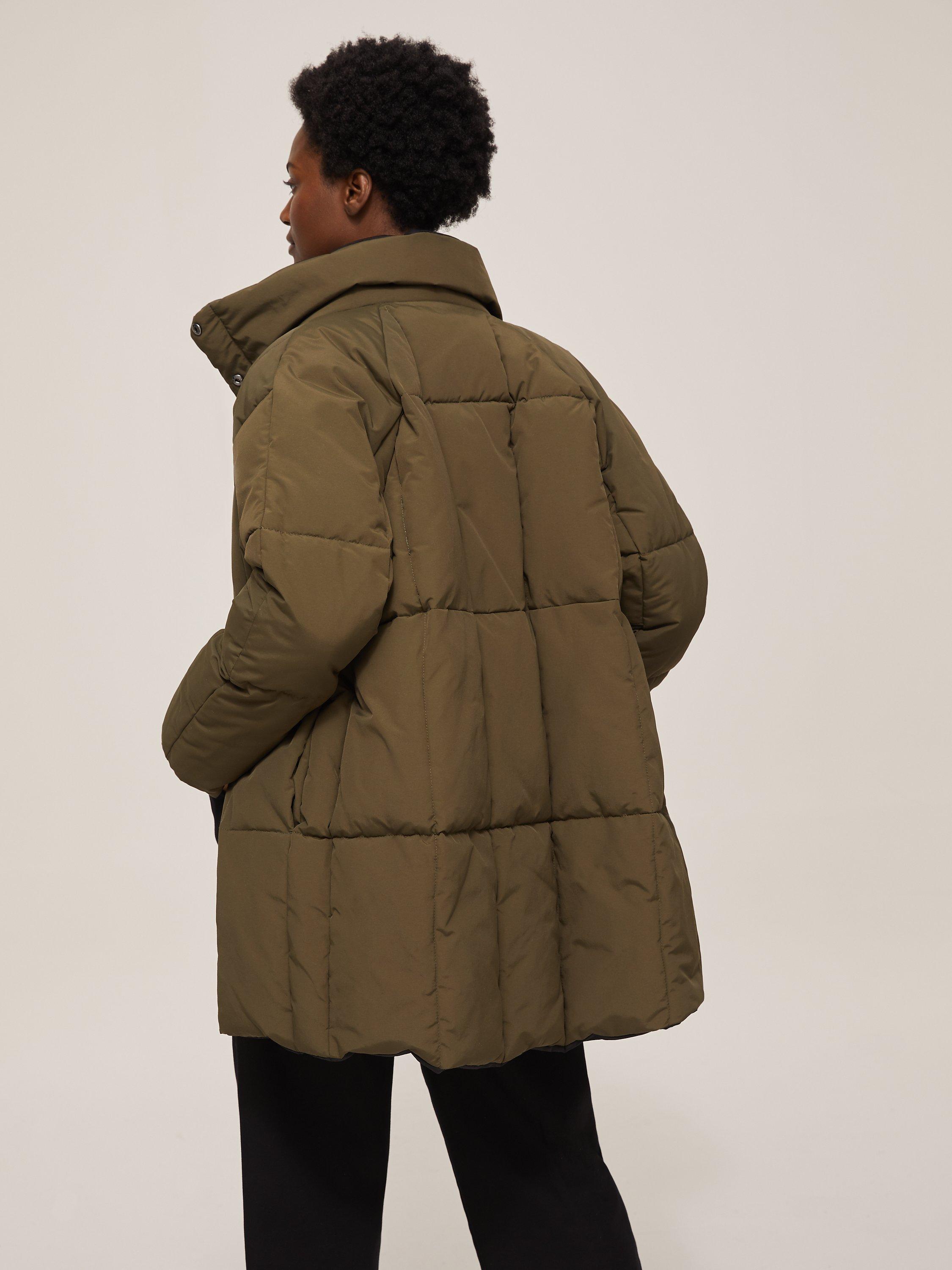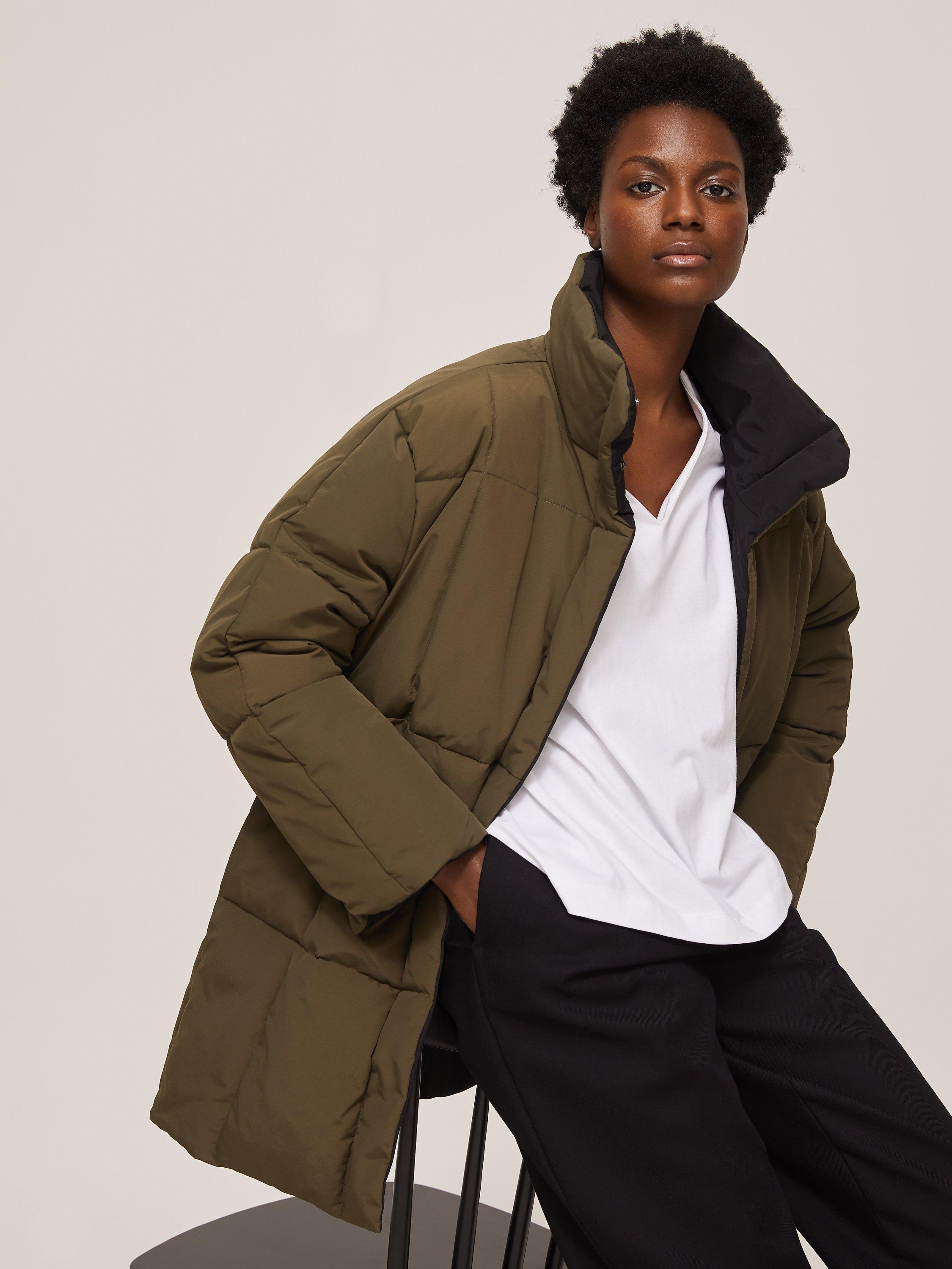 This reversible jacket from Kin features two versatile tones to mix and match. Easy to layer with relaxed dropped shoulder sleeves, it fastens with poppers and has a dipped back hem giving you more coverage and a detachable hood that sits behind a cosy funnel neck.