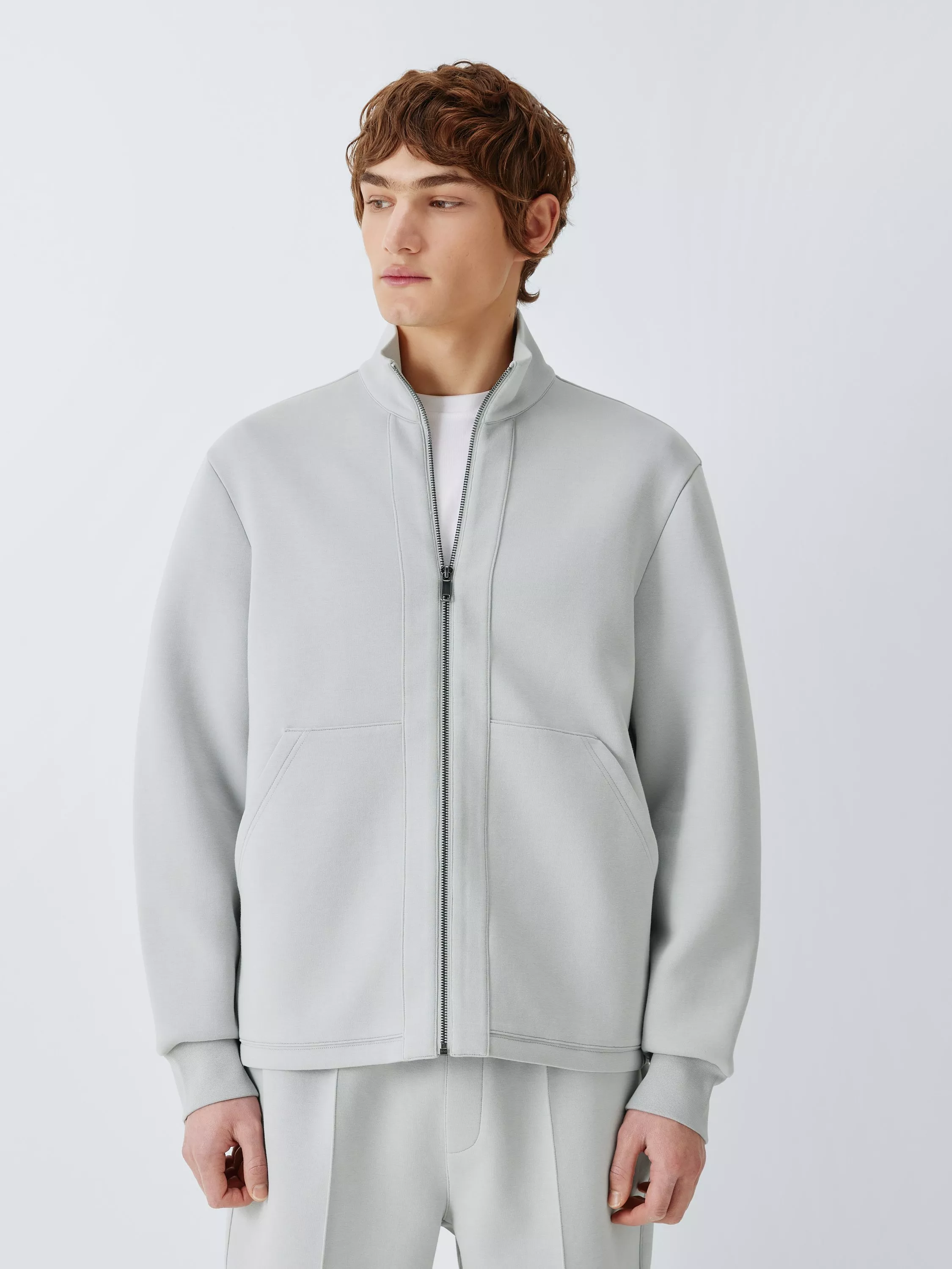 A modern layer, this zip-through top is defined by a high-density scuba fabric that holds its sharp, structured silhouette. Unlike traditional jersey, this technical material is naturally crease-resistant and offers a refined, minimalist aesthetic that remains crisp throughout the day.