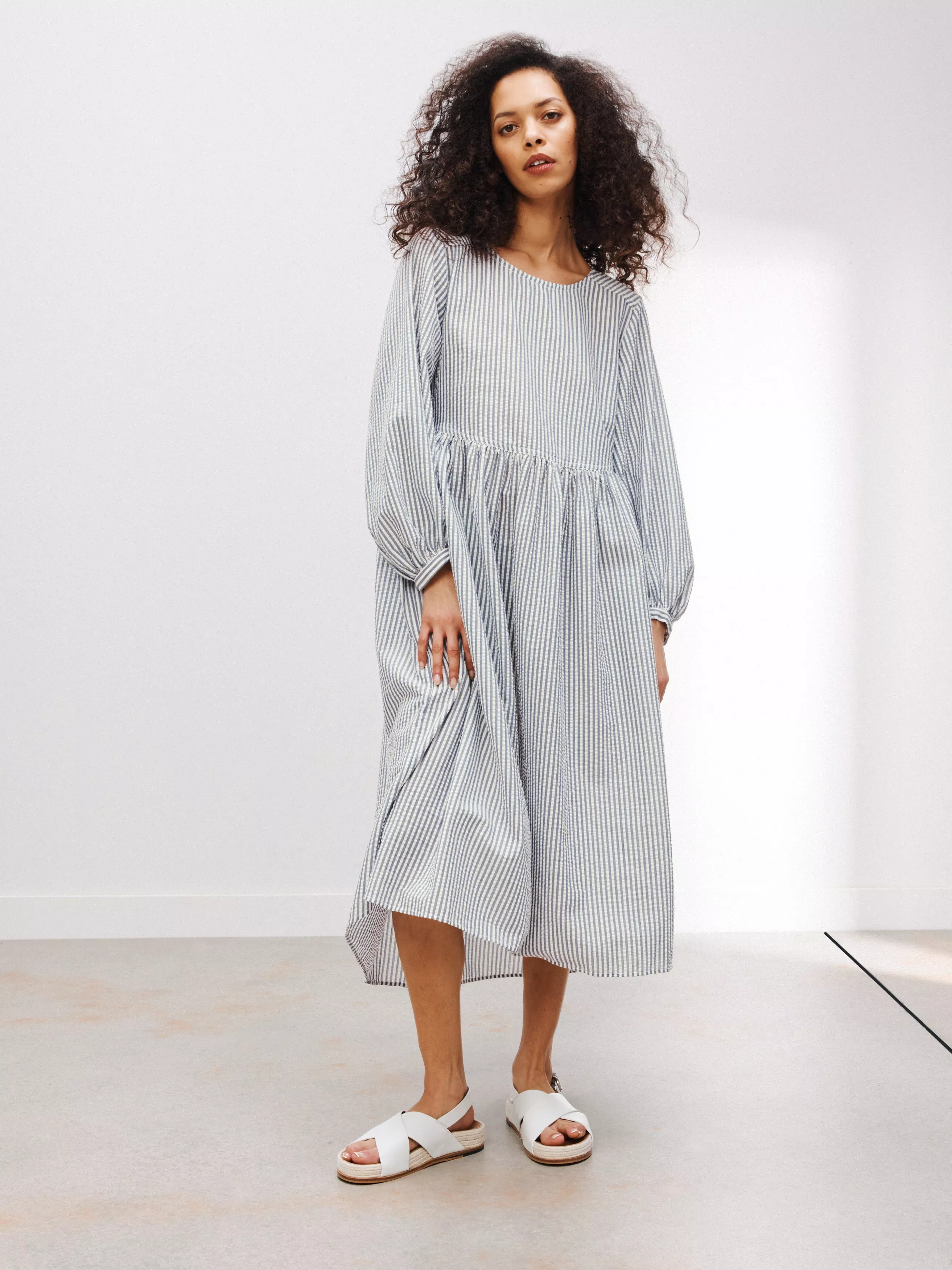 A wardrobe staple for transitional days, this dress comes in a beautifully textured seersucker cotton blend. In a fuss-free smock style, it's accented with a delicate bow on the back and a handy pocket on each side.