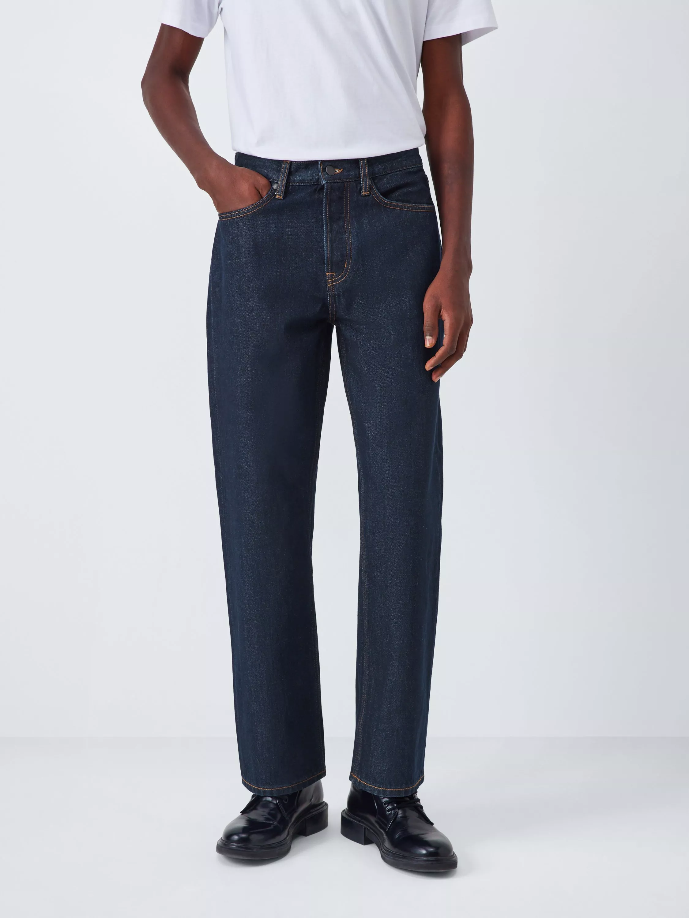 Denim jeans in our regular fit with a straight leg and a classic five-pocket style: two front pockets, two at the back, and a coin pocket. Completed with belt loops on the waistband, and a single button and zip fly fastening.