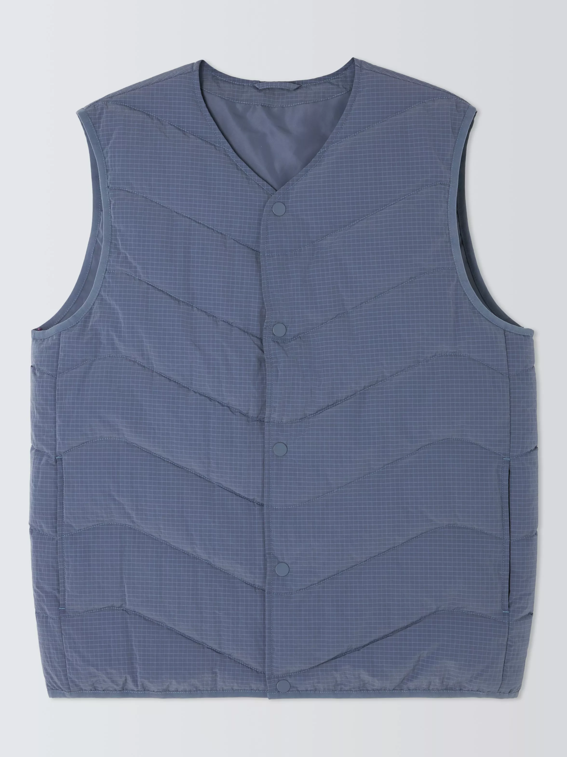 Dynamic chevron quilting meets a micro-grid pattern in this contemporary gilet, designed for versatile layering. The wave-like stitch pattern ensures the insulating wadding remains evenly distributed, providing consistent warmth without unnecessary bulk. Its slim, V-neck profile is cut to slide seamlessly under tailored overcoats or over casual knitwear as the seasons shift.