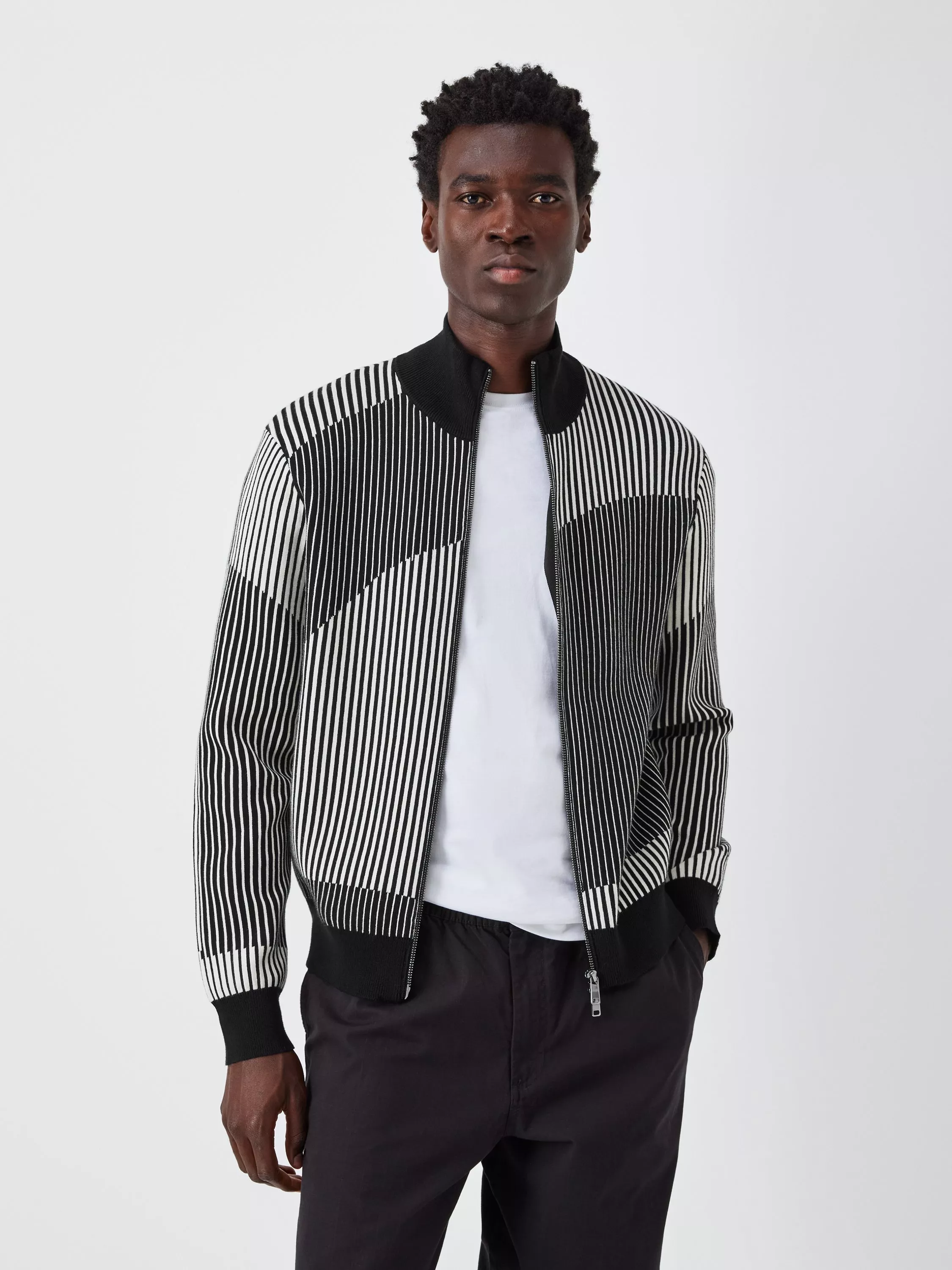 A knitted jacket with a two-way, zip-fastened front and stripe detailing that enriches the style with statement-worthy appeal.