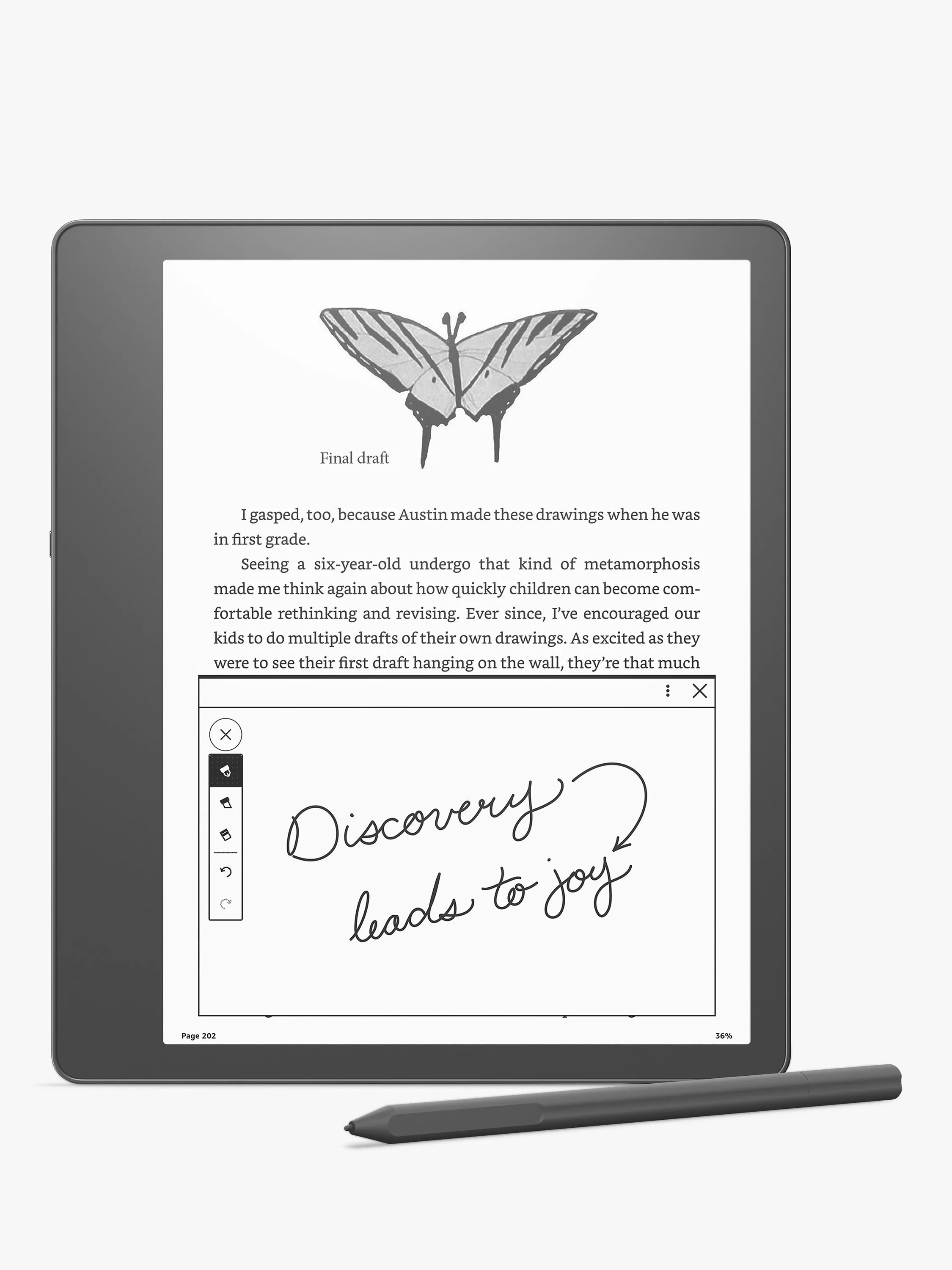 Kindle Scribe is ideal for reading AND writing, even in direct sunlight. With a large 10.2” glare-free display, it gives you room to take notes or write a diary entry, and makes it easy to adjust font size and margin width for reading comfort. Writing on the Kindle Scribe feels like writing on paper, from the natural grip of the pen in your hand to the sound you hear when you write. It’s all designed for a satisfying reading and writing experience.