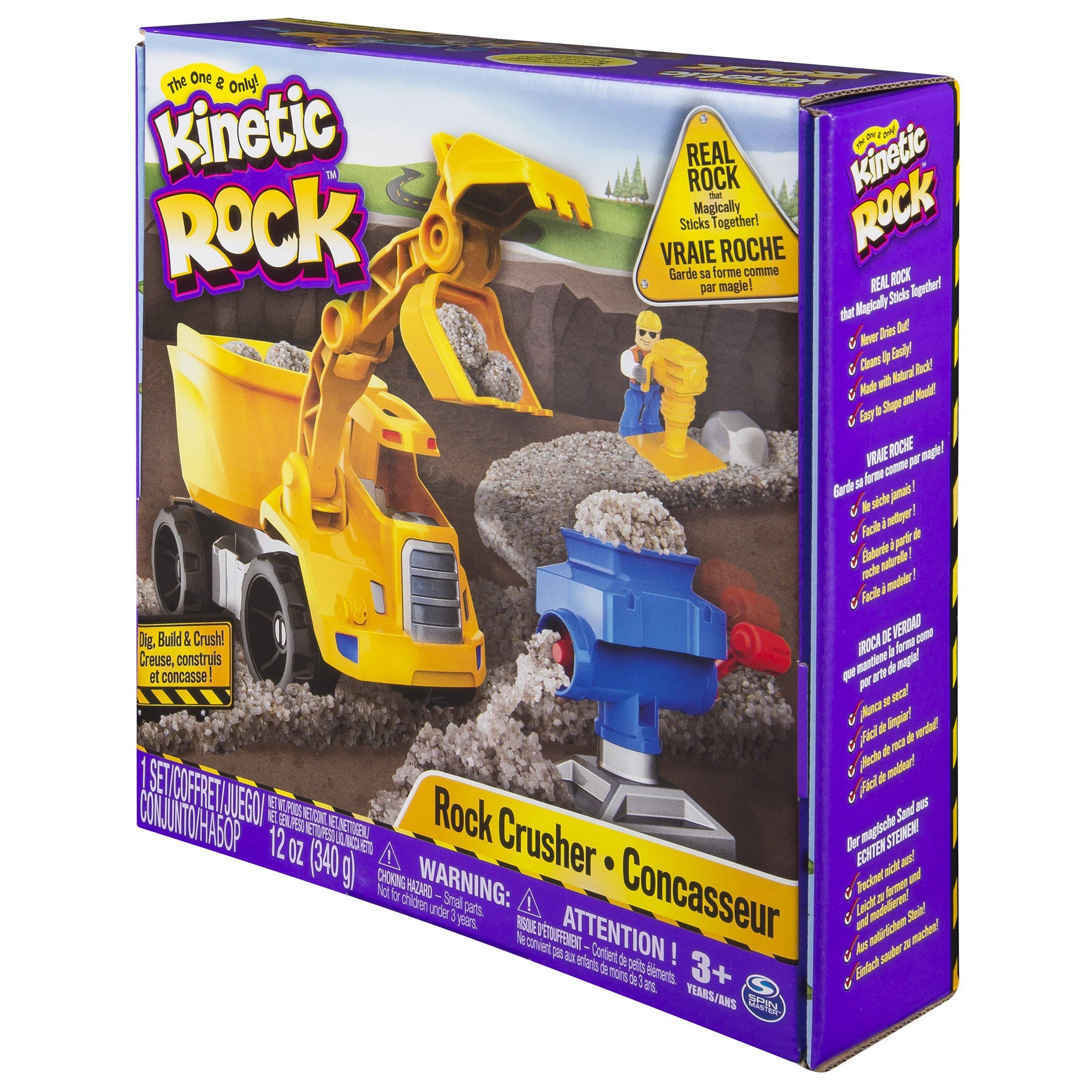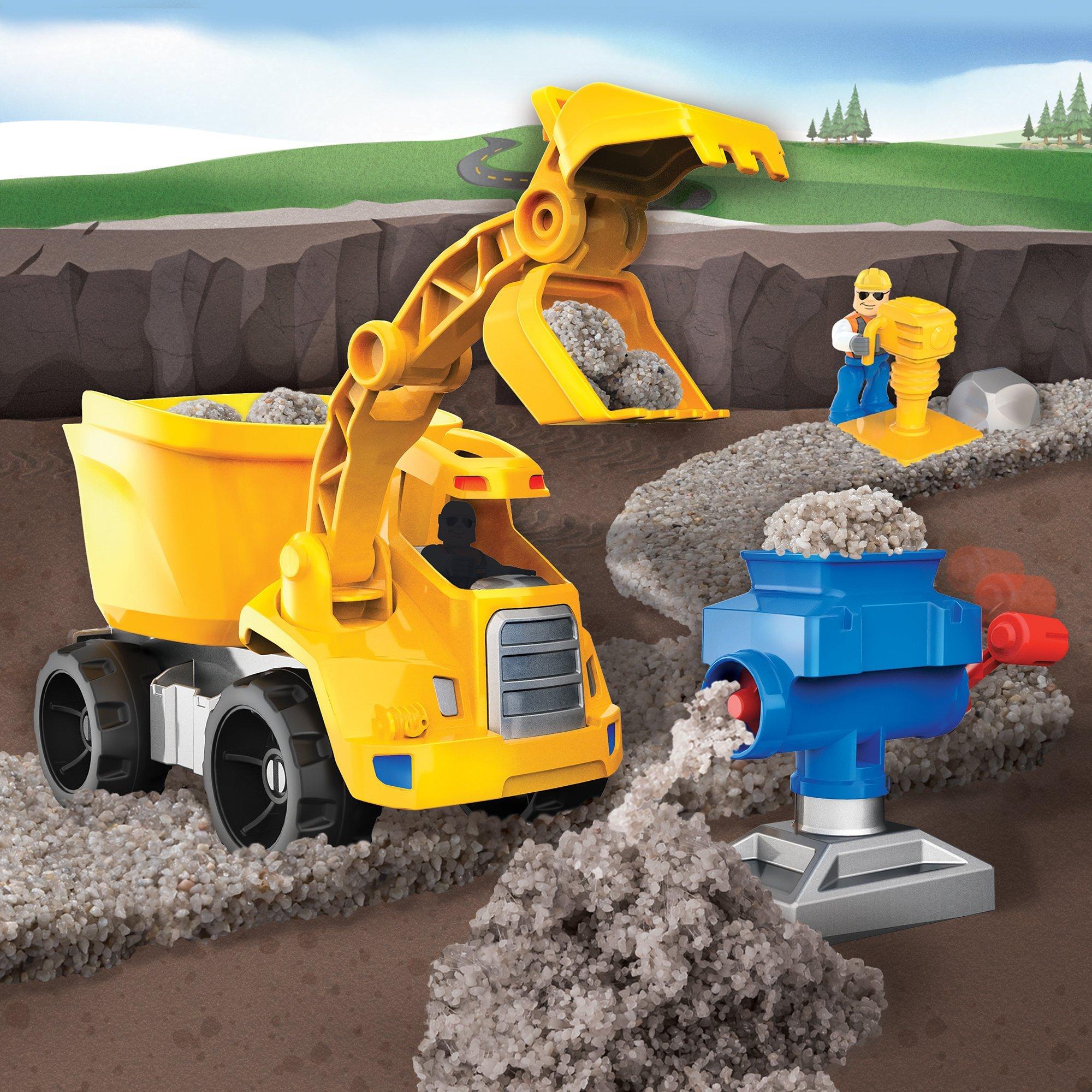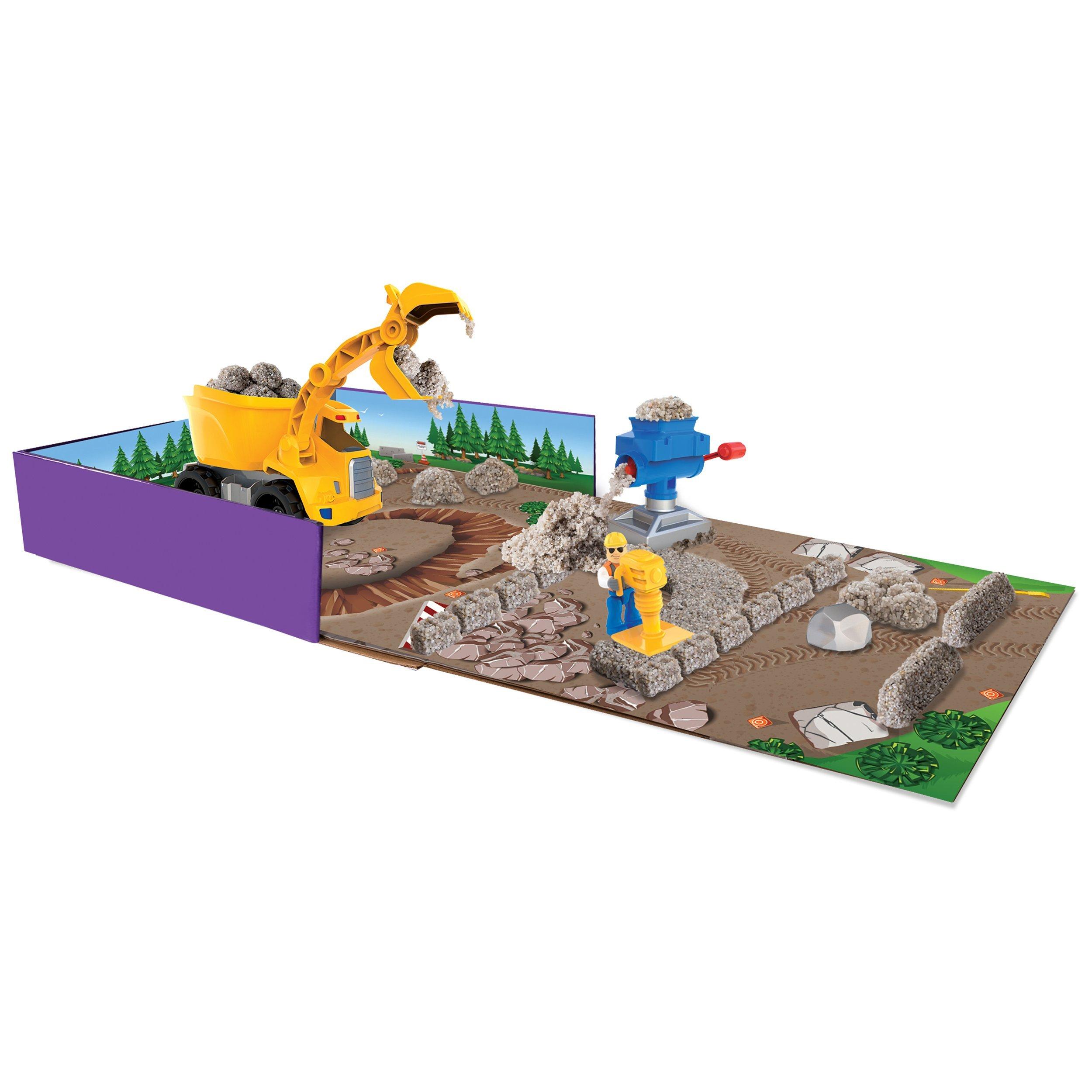 Use the included mould to create boulders. Then use the vehicle's claw to pick up the boulder, transport it, and dump it. You'll have help from the poseable construction figure that fits inside the vehicle. Now use the rock crusher to turn moulded bounders into rock! Flatten out and smooth the rock with the tamper tool. The all-new Kinetic Rock Crusher Set provides real construction fun!