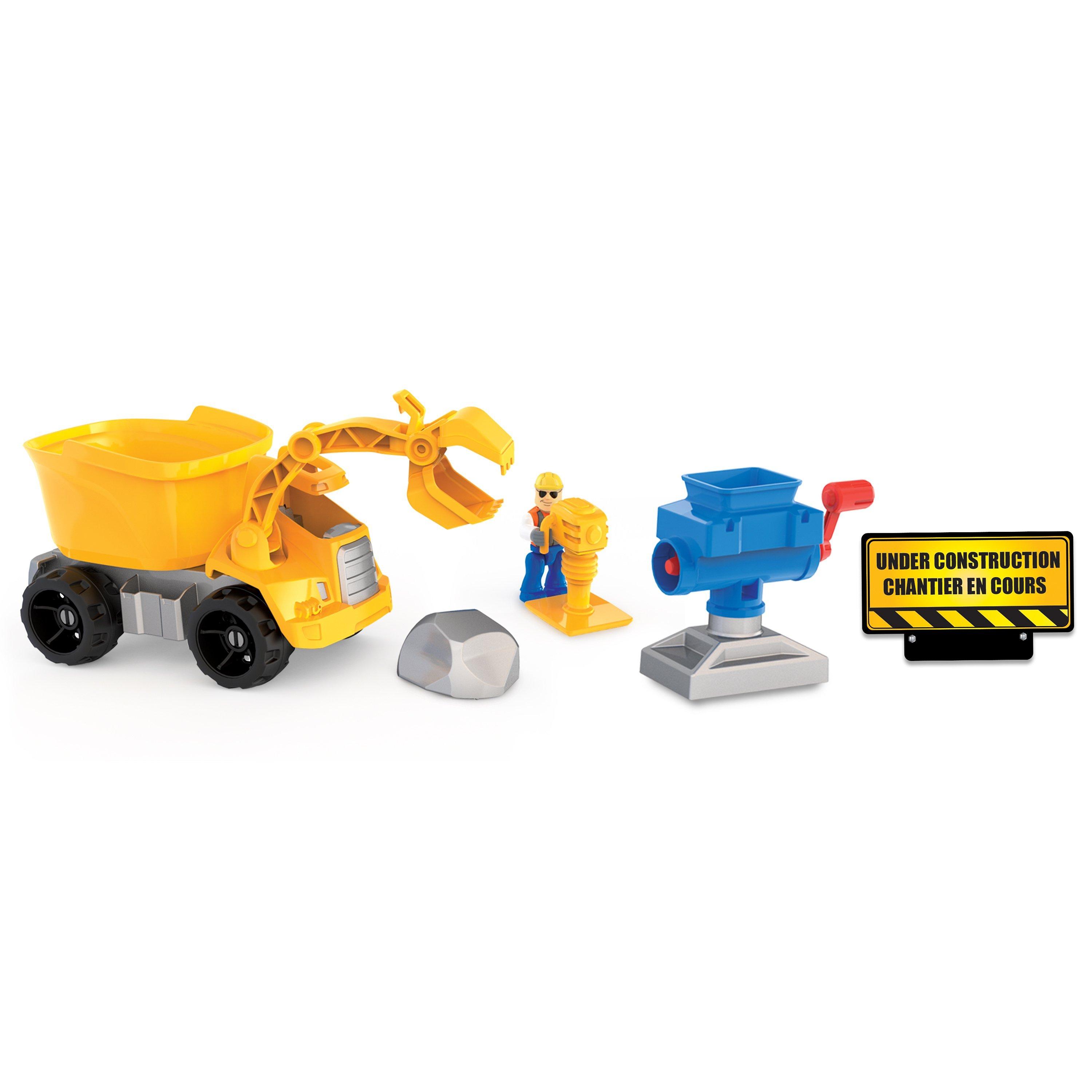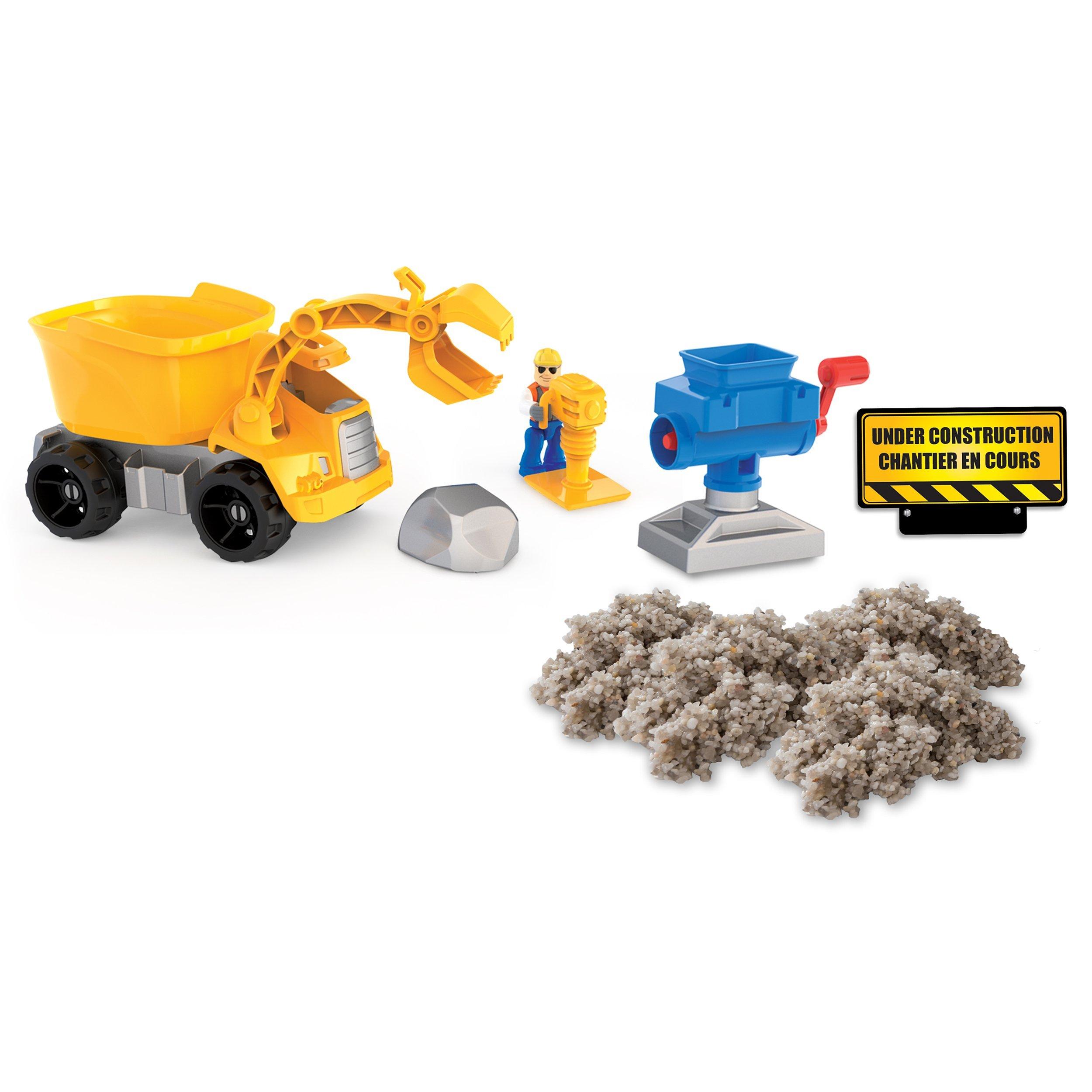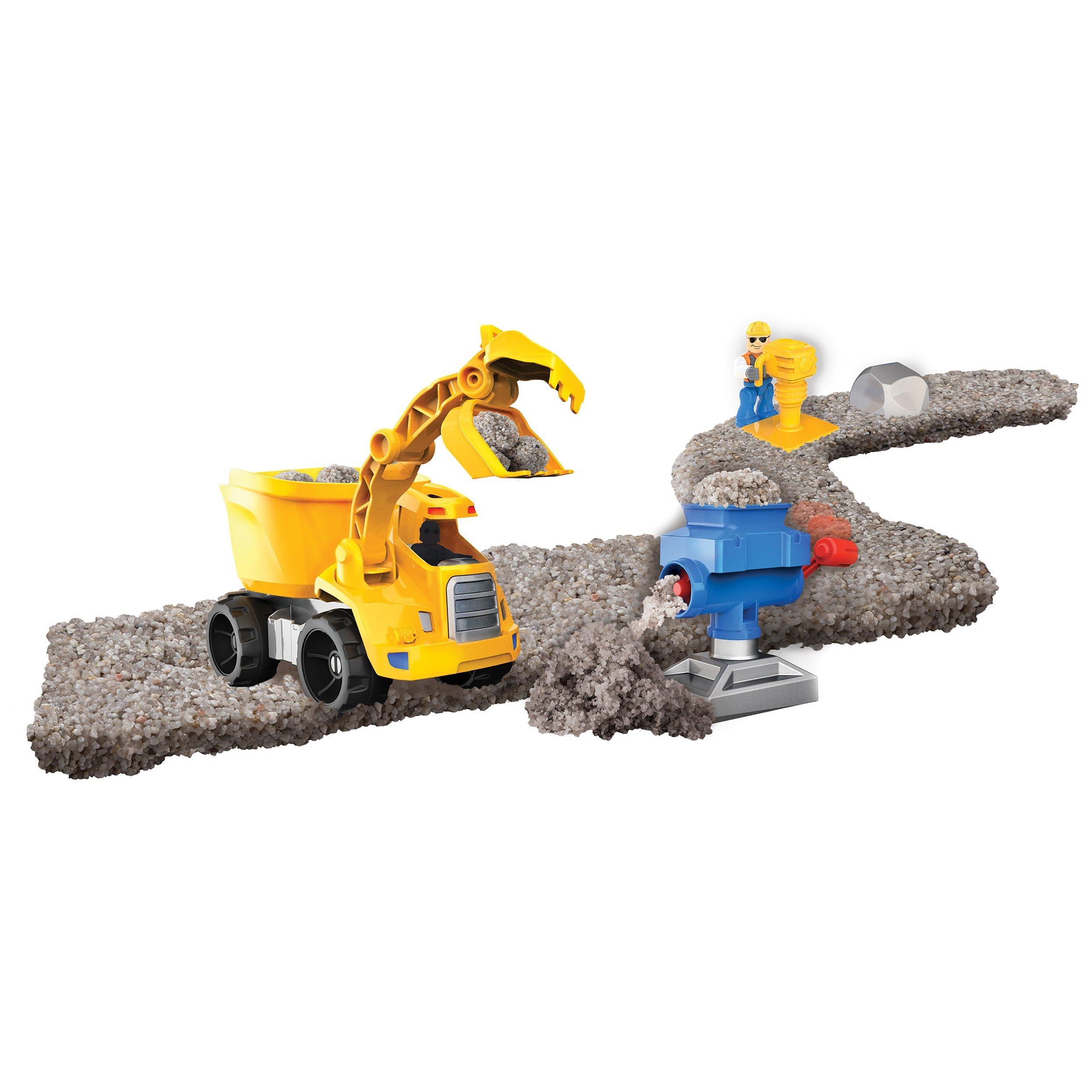 Use the included mould to create boulders. Then use the vehicle's claw to pick up the boulder, transport it, and dump it. You'll have help from the poseable construction figure that fits inside the vehicle. Now use the rock crusher to turn moulded bounders into rock! Flatten out and smooth the rock with the tamper tool. The all-new Kinetic Rock Crusher Set provides real construction fun!