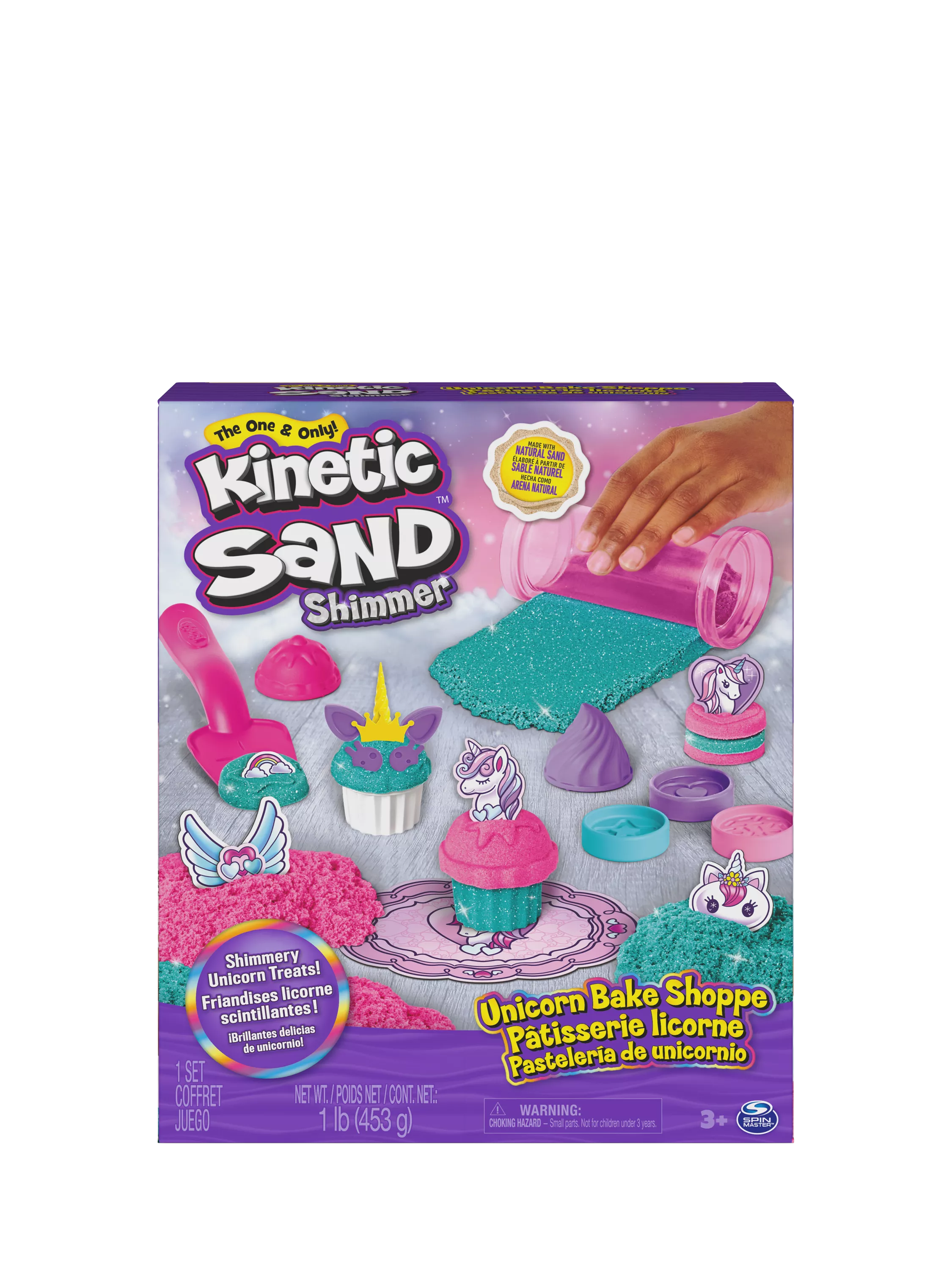 Run the ultimate Kinetic Sand Unicorn Bake Shoppe. This playset features 453g of Kinetic Sand: 226g of shimmer teal and 226g of pink neon sand. Create unicorn cupcakes with the moulds and tools. This set includes three cupcake moulds, roller, spatula and six unicorn-themed accessories.
