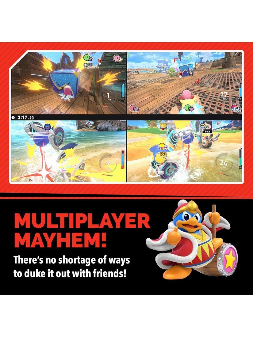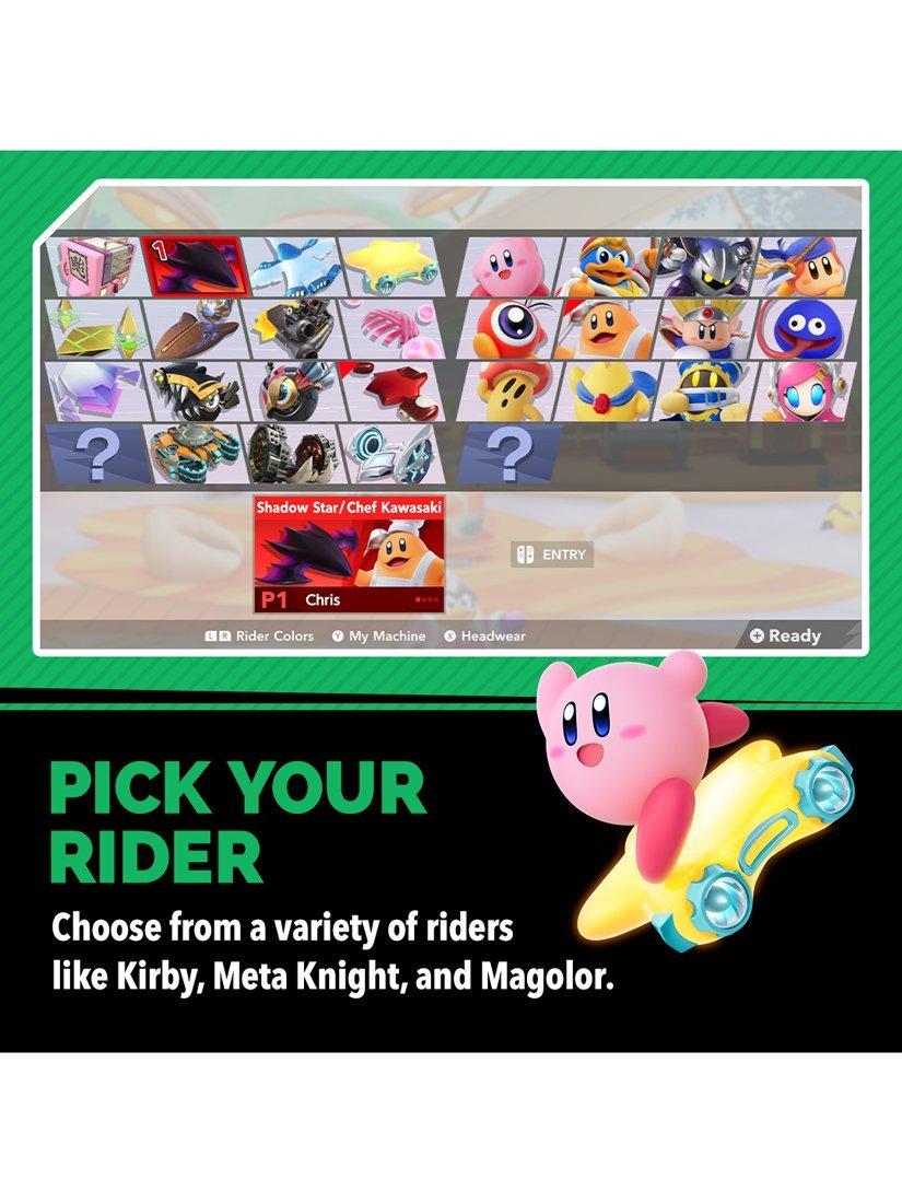 Choose from a variety of riders like Kirby, Meta Knight, King Dedede, and Magolor from Kirby’s Adventure Wii, and machines including the Warp Star, Wheelie Bike, Chariot and more. Each machine handles differently, and each rider has their own set of stats and Specials – they can also grab Copy Abilities off their foes to get an edge in the fray.