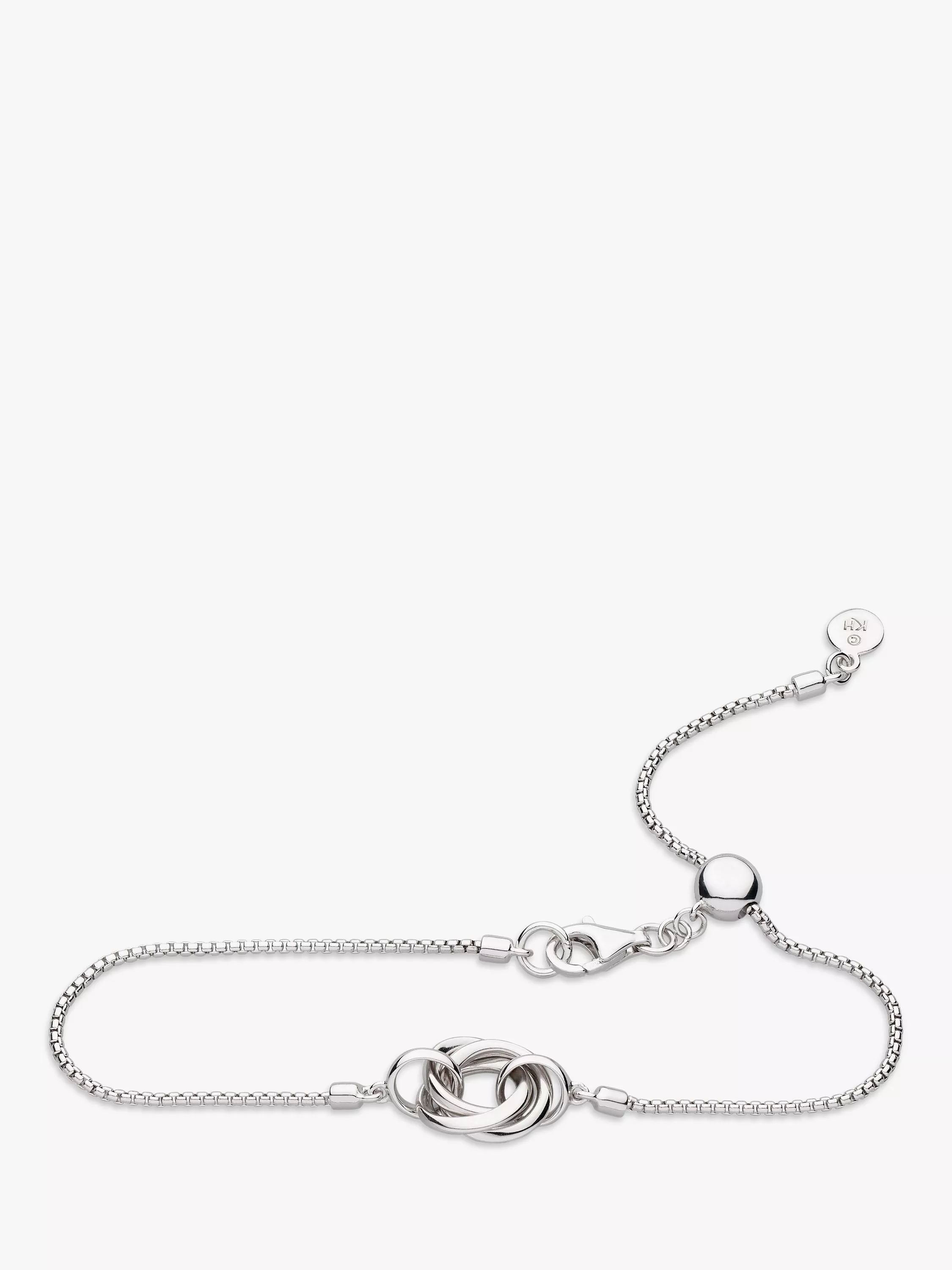 Three beautiful Sterling Silver rings become one, with this circle bracelet from Kit Heath. A trio of silver circles intertwine to adorn a round box chain. Secured with a lobster and sliding toggle clasp, you can easily adjust for a great fit.