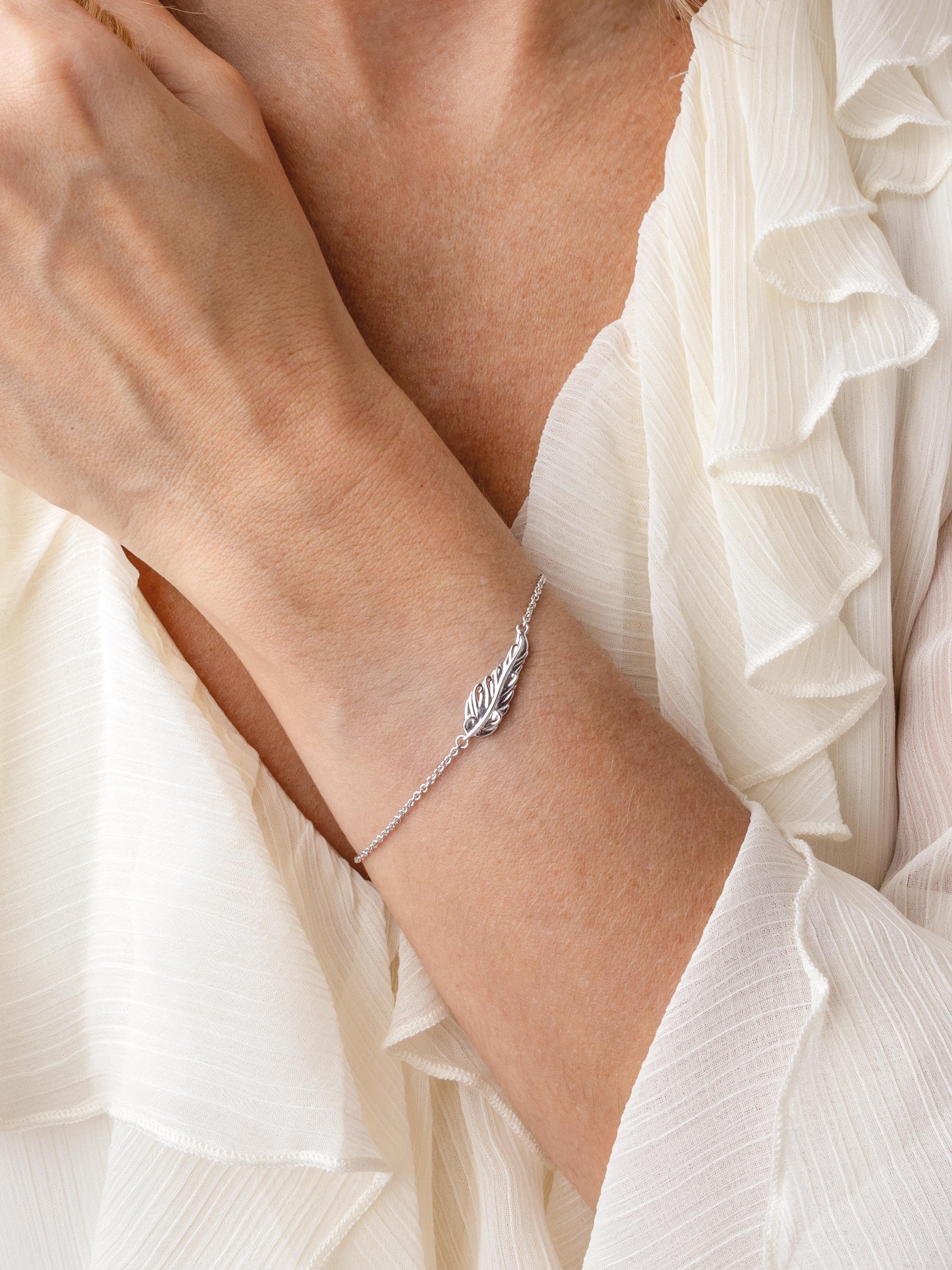 The Feather Wisp Bracelet by Kit Heath showcases a refined and graceful feather design that elegantly graces the wrist. Symbolising honour, connection, trust, wisdom and strength from within, this beautiful bracelet evokes cherished memories of love and beauty. The delicate feather detailing adds both elegance and depth, making it a meaningful and timeless piece.