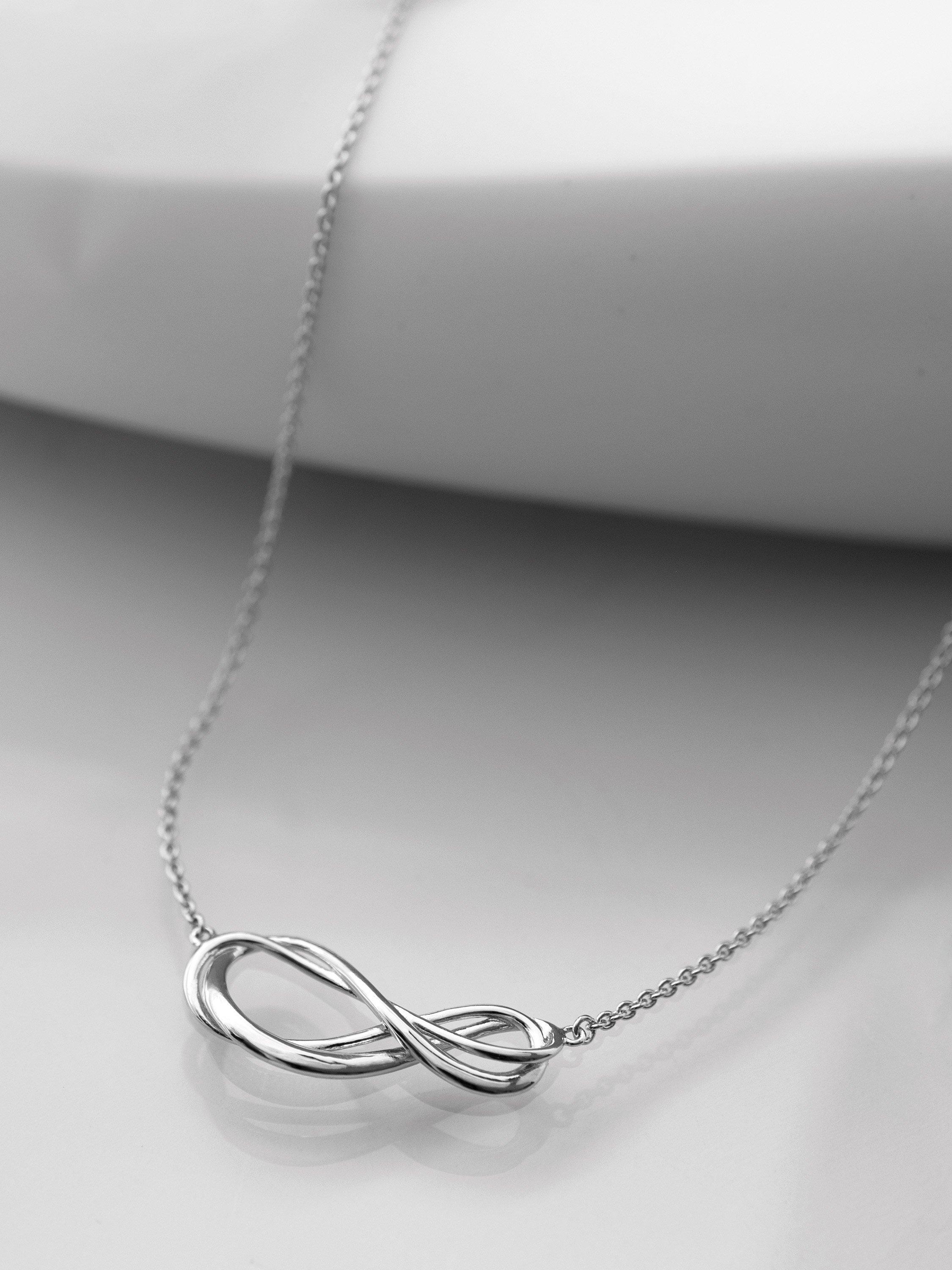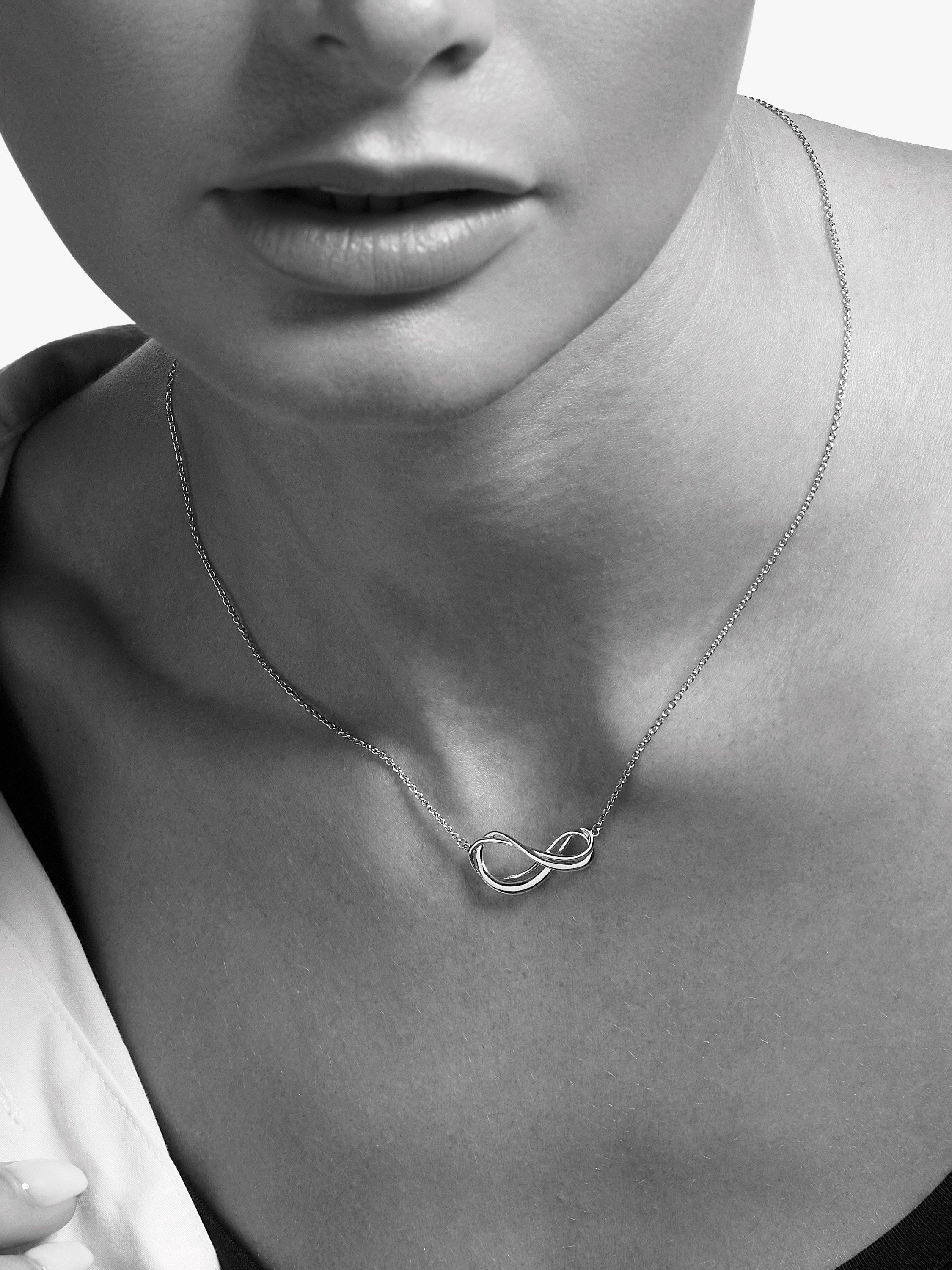 Representing everlasting love, the Infinity symbol in sterling silver is featured on a fine sterling silver chain. Perfect for day to night wear, with a design to be cherished for a lifetime.