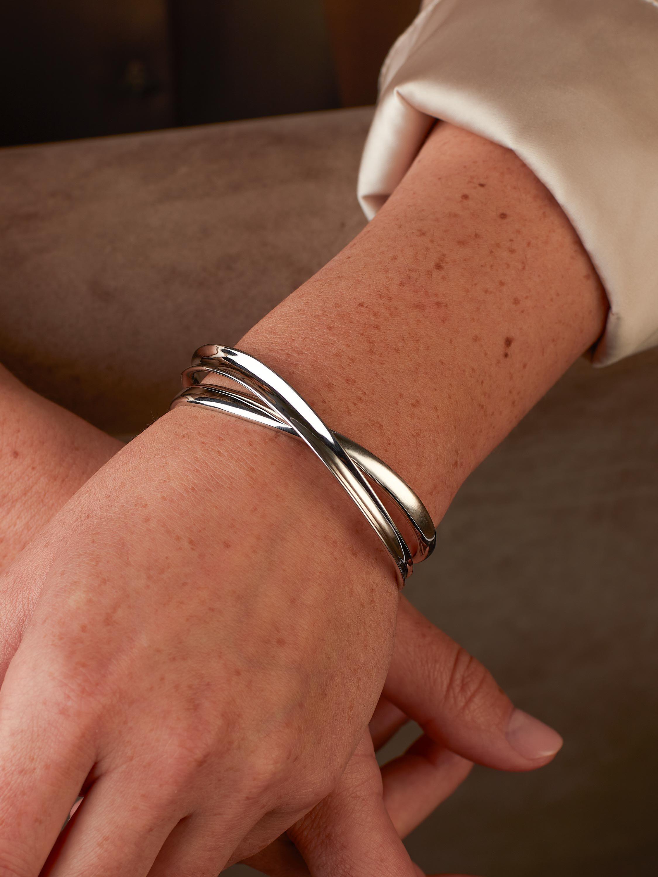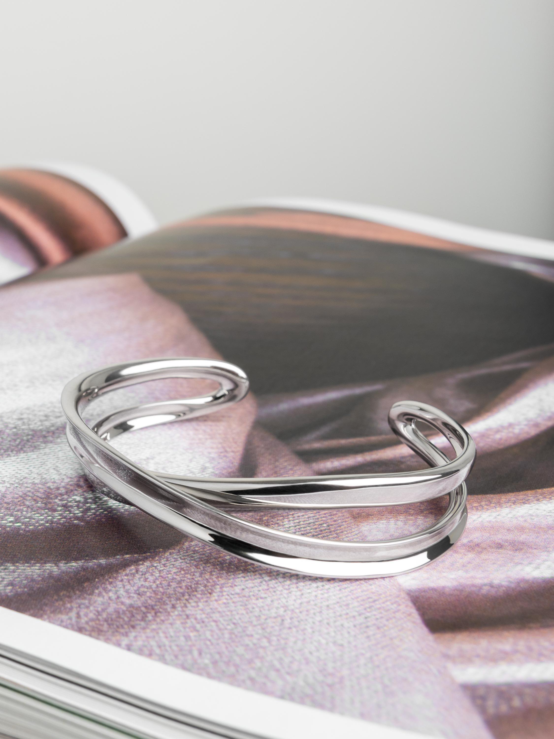 The Serenity Grande Crossover cuff bangle by Kit Heath combines elegance with modern design, featuring a fluid, graceful form. Its broad silhouette and solid, polished finish exude sophistication and timeless beauty.