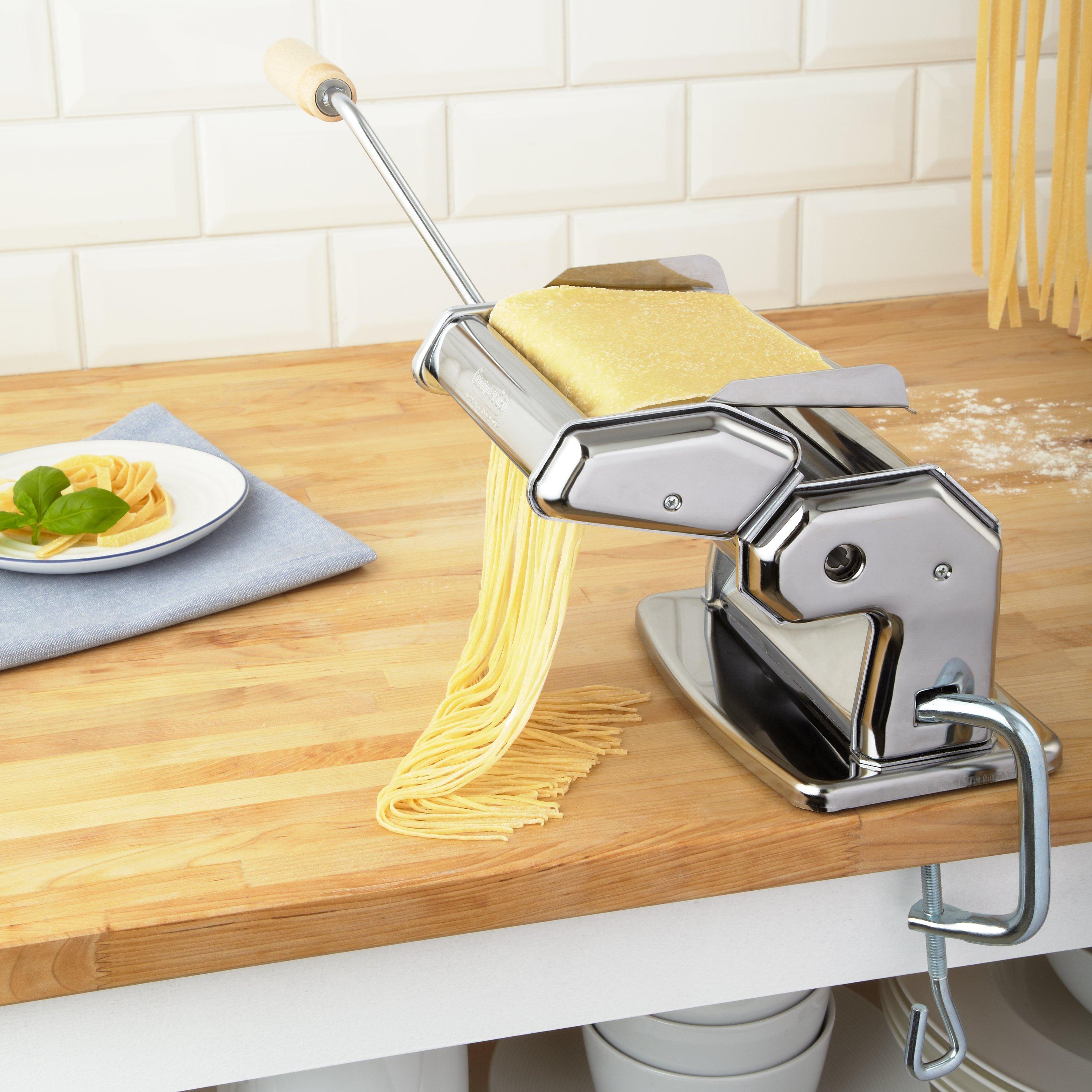 Fresh pasta is easy to make and tastes wonderful! This traditional pasta machine is chrome plated with adjustable rollers and includes tagliatelle and fettucini cutters.