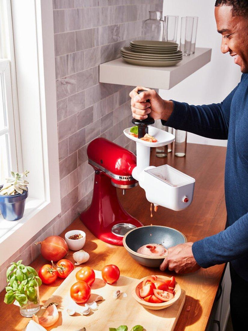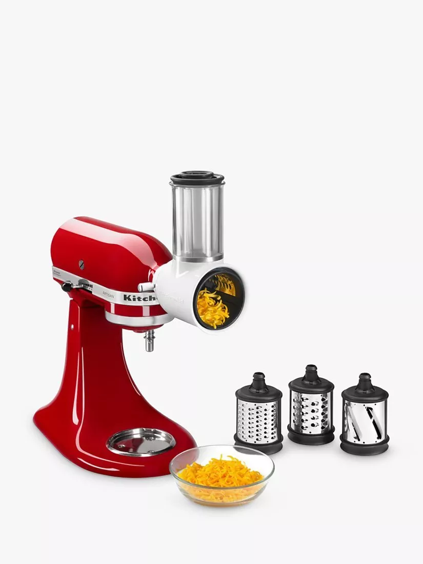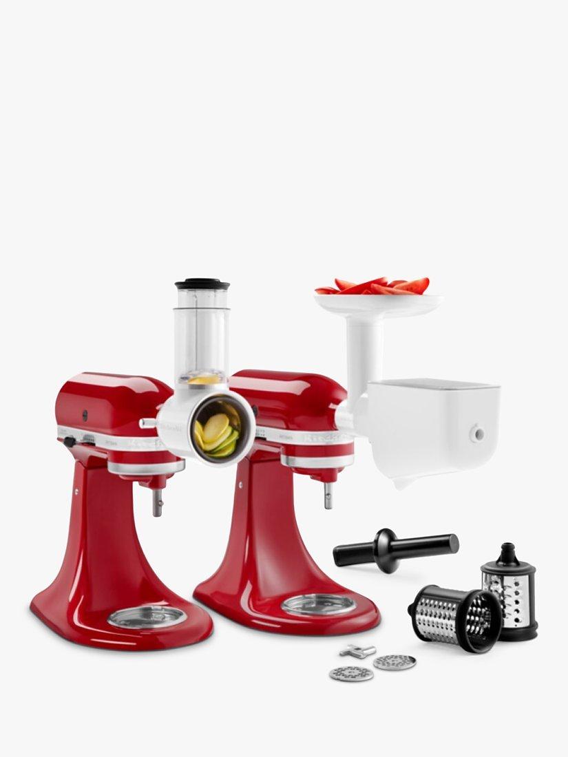 This set of attachments fits all KitchenAid mixers, including a Food Grinder, a Fruit and Vegetable Strainer, and a Fresh Prep Slicer/Shredder.