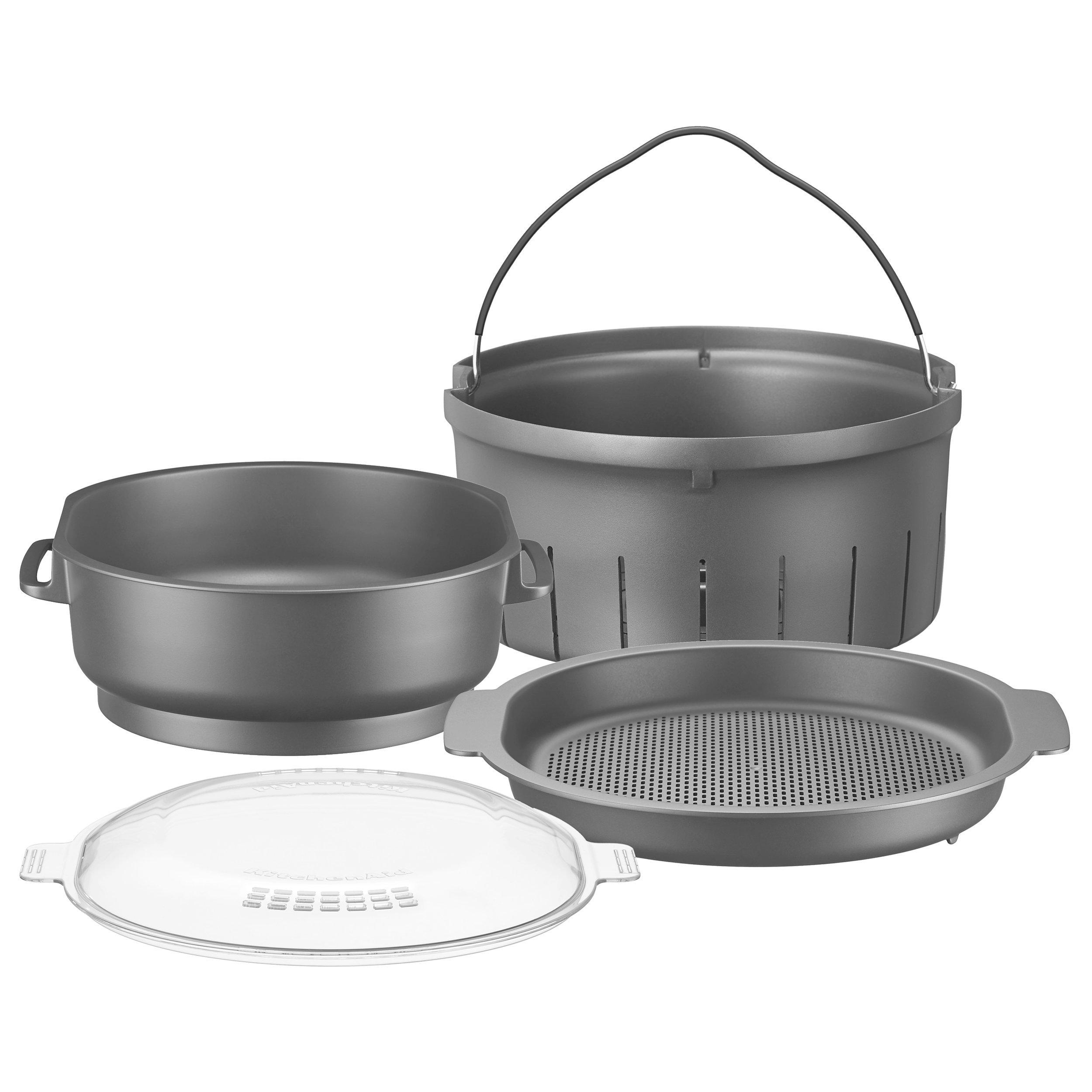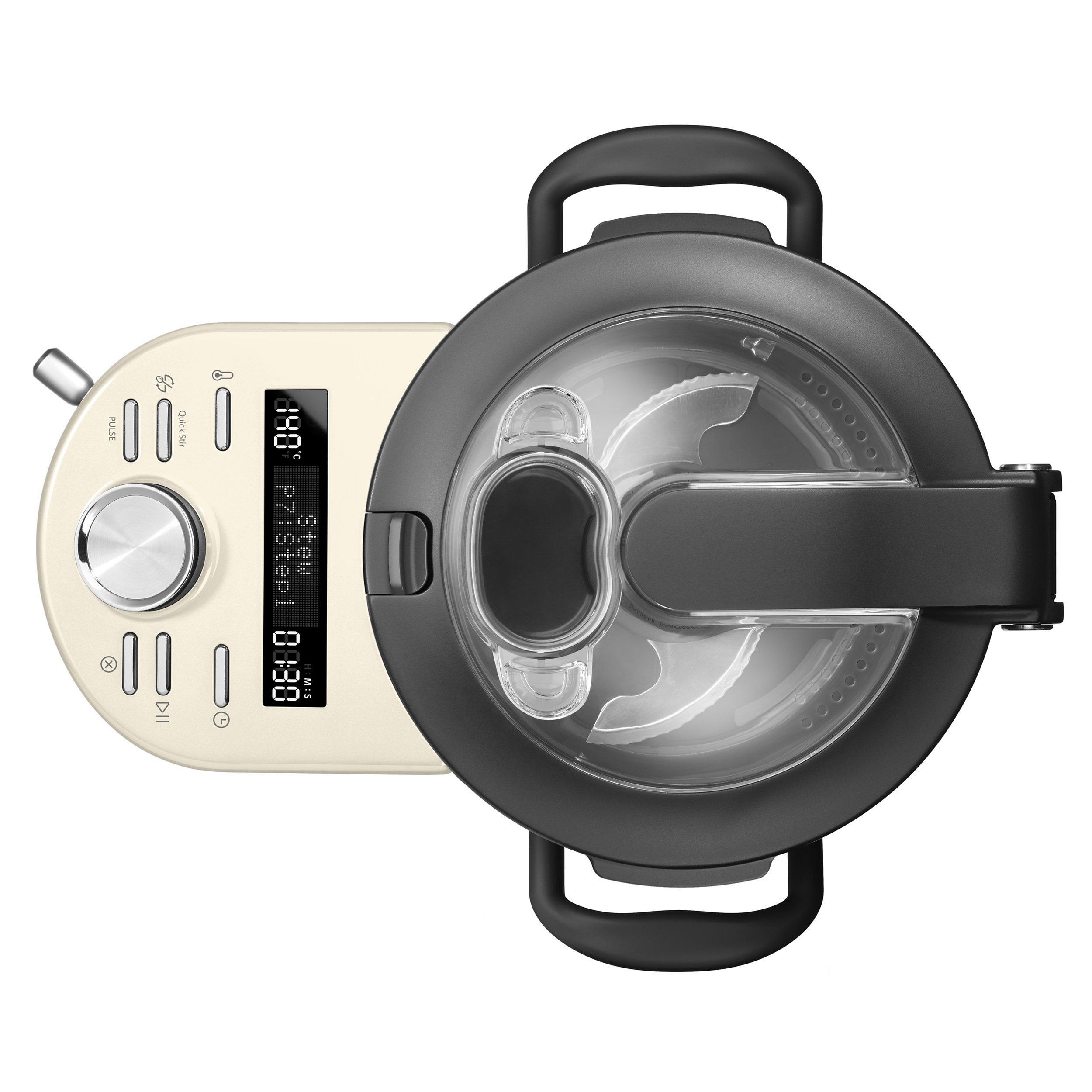 Unique and Stylish 4.5L stainless steel cooking pot with ergonomic handles and hinged lid, StirAssist, Egg Whip, Multiblade, Dough Blade, Upper and Lower Steamer Basket with Lid, Inner Basket, Mini Bowl with Mini Multiblade, Measuring Cup, FREE Cookbook and smart App.