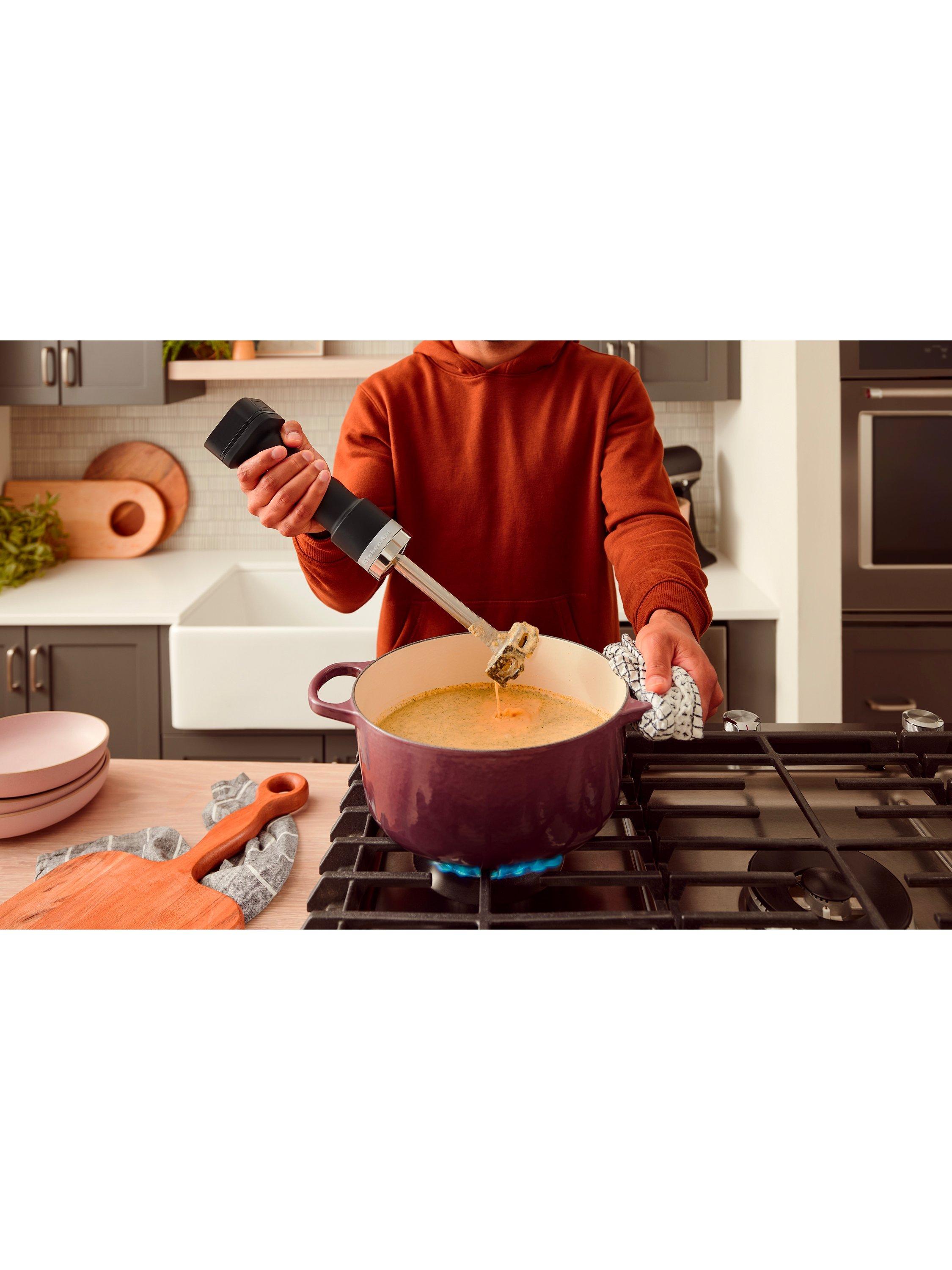This powerful immersion blender is cord-free and completely portable! Its rechargeable, removable battery powers not just this, but all of the appliances in the KitchenAid Go Cordless System. No more annoying power leads, just enjoy the freedom.