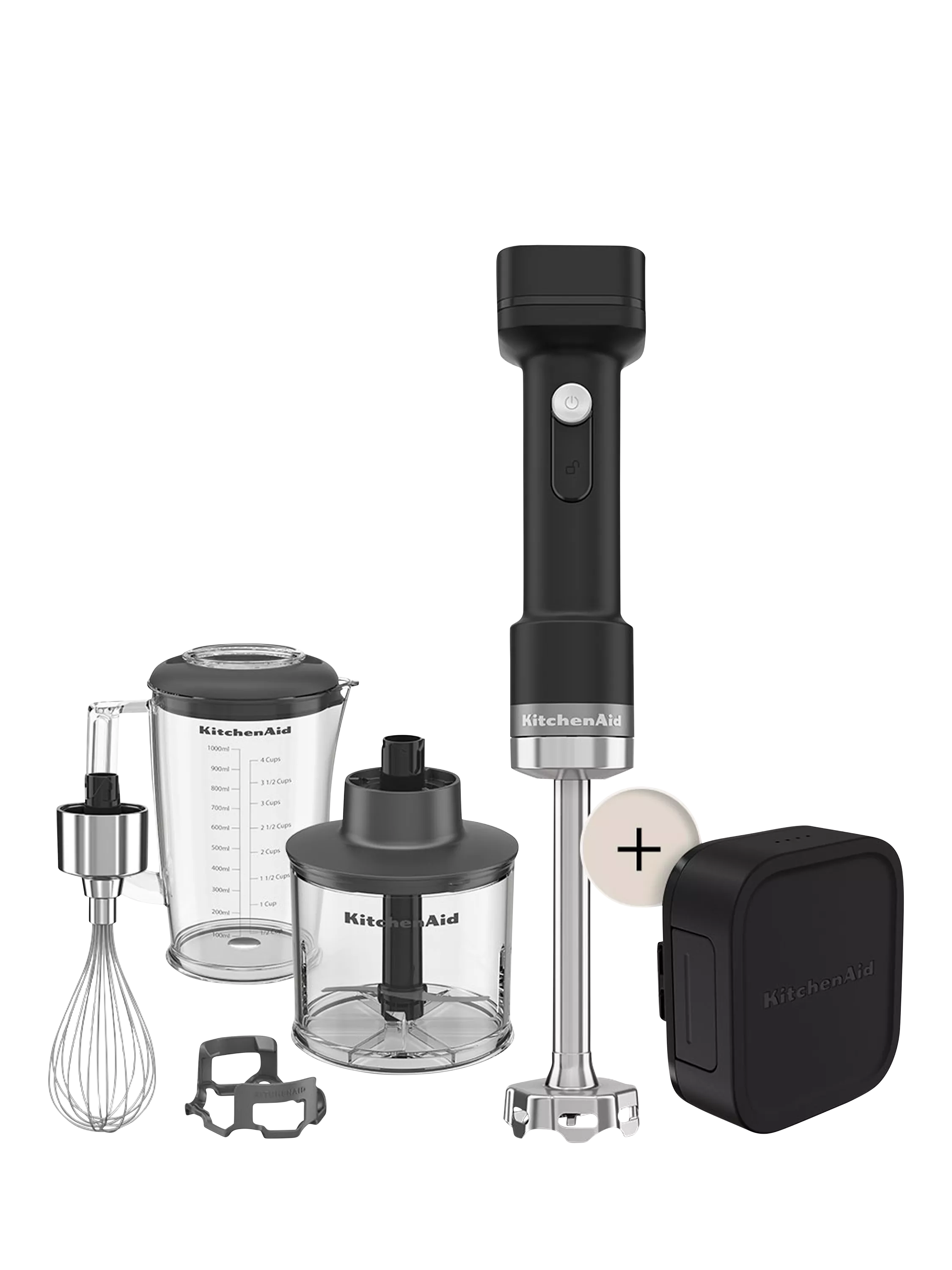 - Hand blender body, battery with USB-C cable, removable blending arm with stainless steel blade, 1L blending jar with lid, pan guard, chopper attachment with blade and bowl, whisk attachment