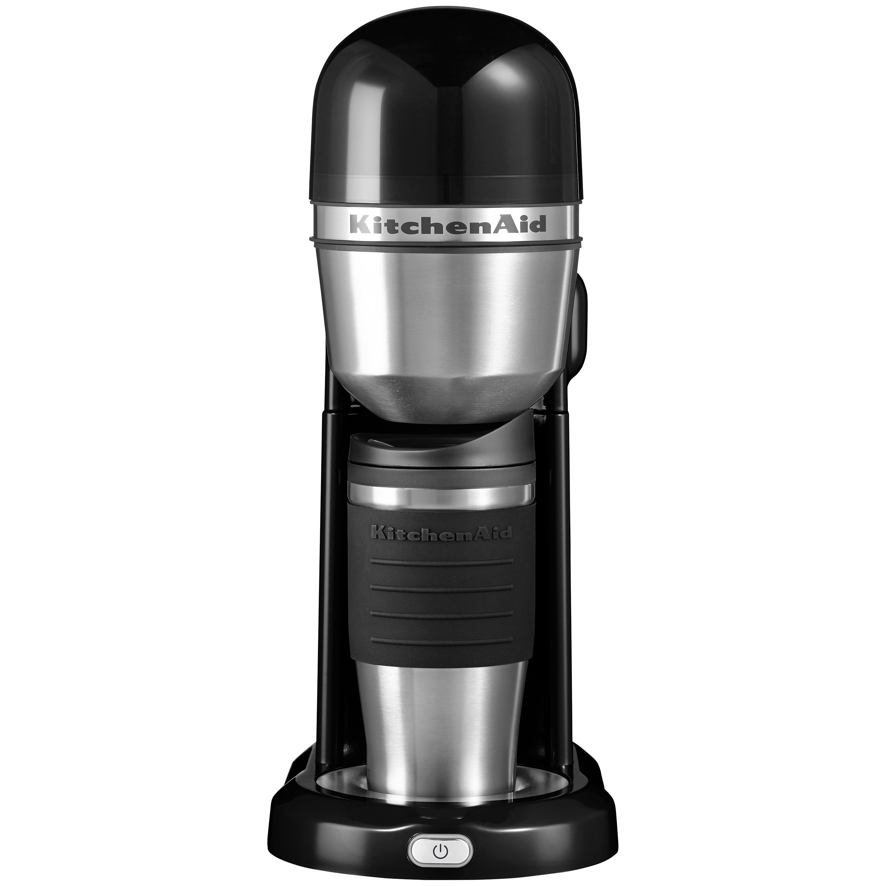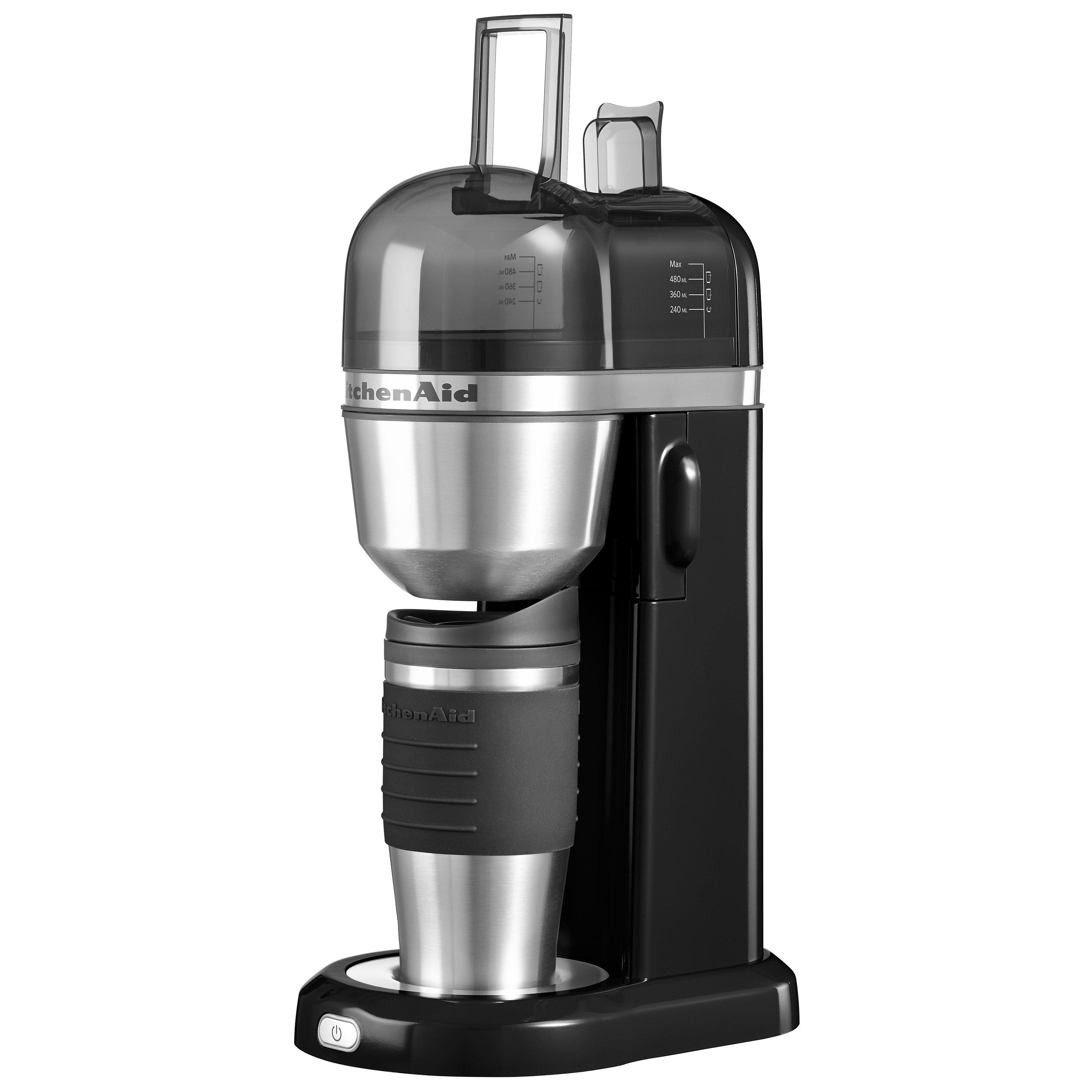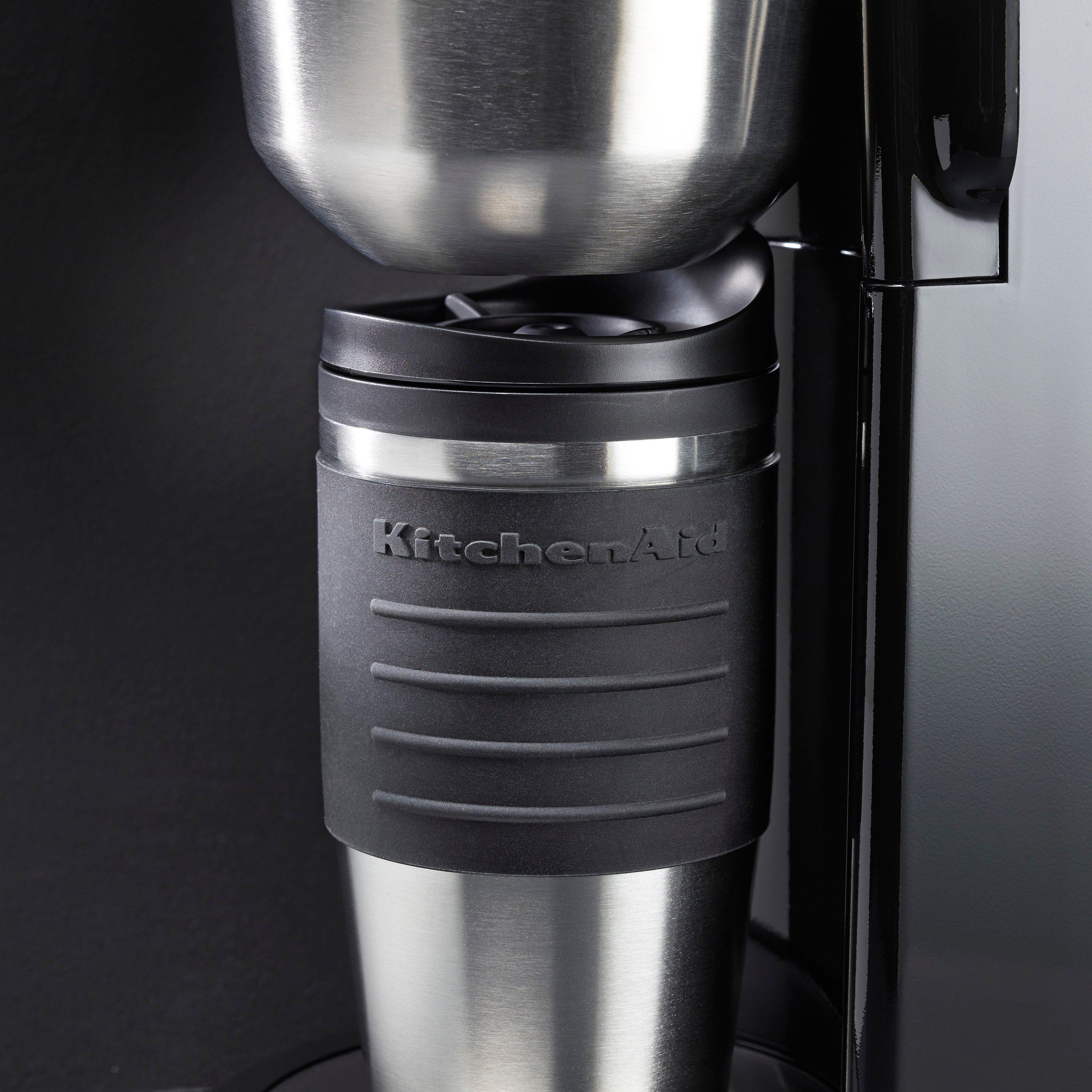 Enjoy a freshly brewed cup of coffee at home or on the go with the KitchenAid Personal coffee maker. Choose your favourite barista style ground coffee and brew the right amount just for you. The sleek, compact design is perfect for your countertop and brews directly into the included 540ml thermal mug or into any mug or cup of your choice. Simply add water to the removable tank, add your favourite coffee to the reusable gold-tone filter and press ON to begin brewing. No pods required.