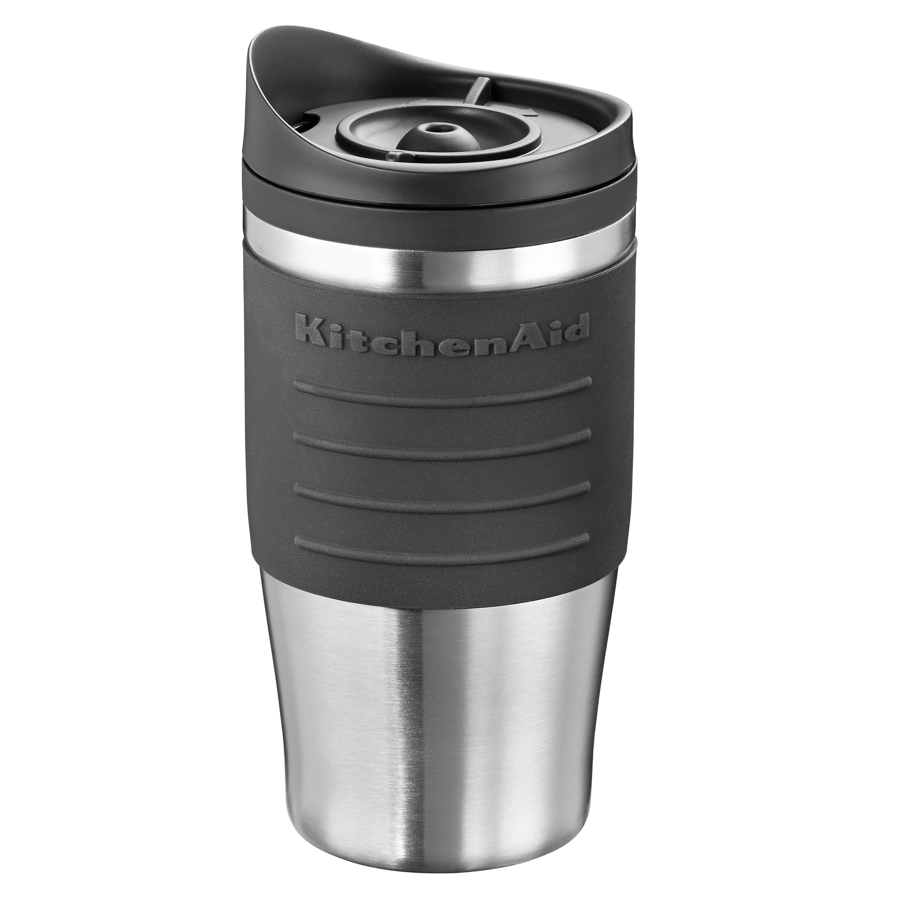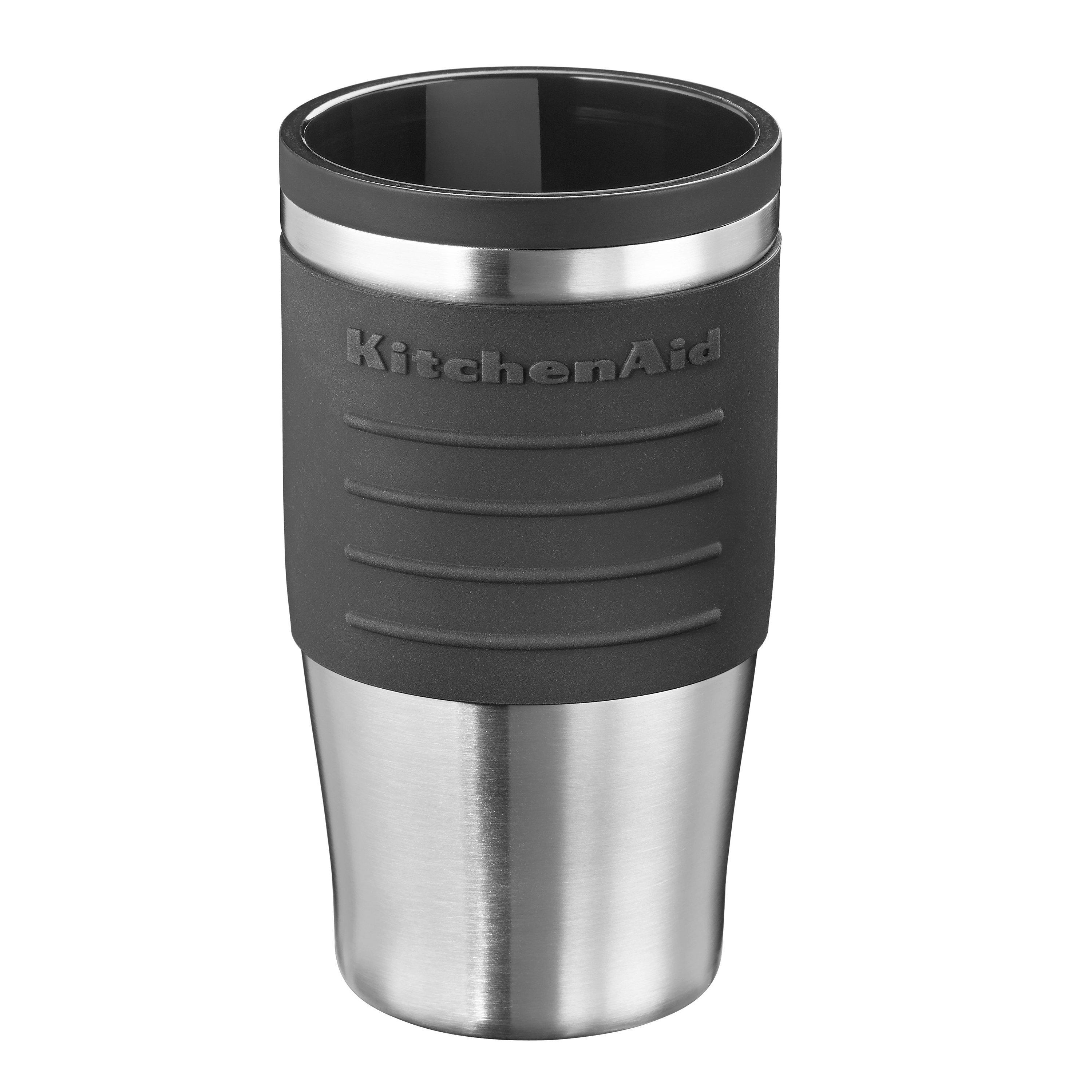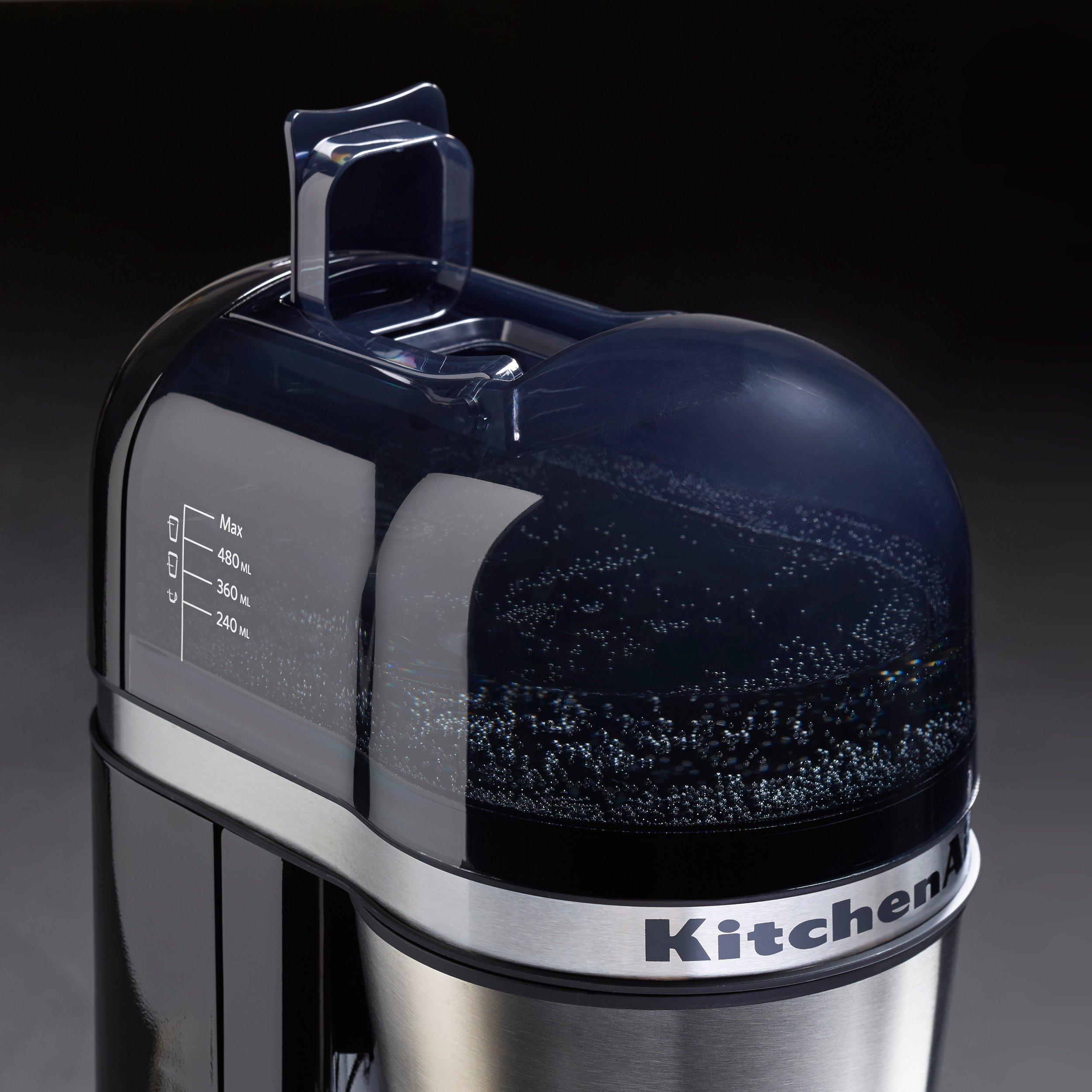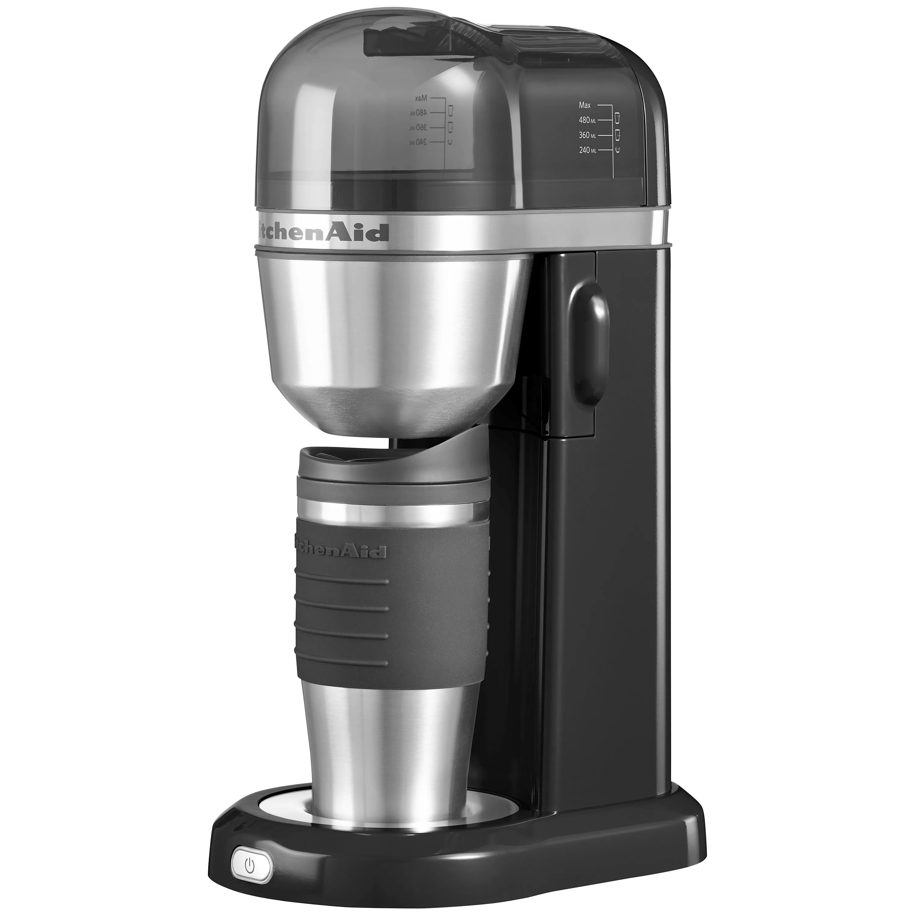 Enjoy a freshly brewed cup of coffee at home or on the go with the KitchenAid Personal coffee maker. Choose your favourite barista style ground coffee and brew the right amount just for you. The sleek, compact design is perfect for your countertop and brews directly into the included 540ml thermal mug or into any mug or cup of your choice. Simply add water to the removable tank, add your favourite coffee to the reusable gold-tone filter and press ON to begin brewing. No pods required.