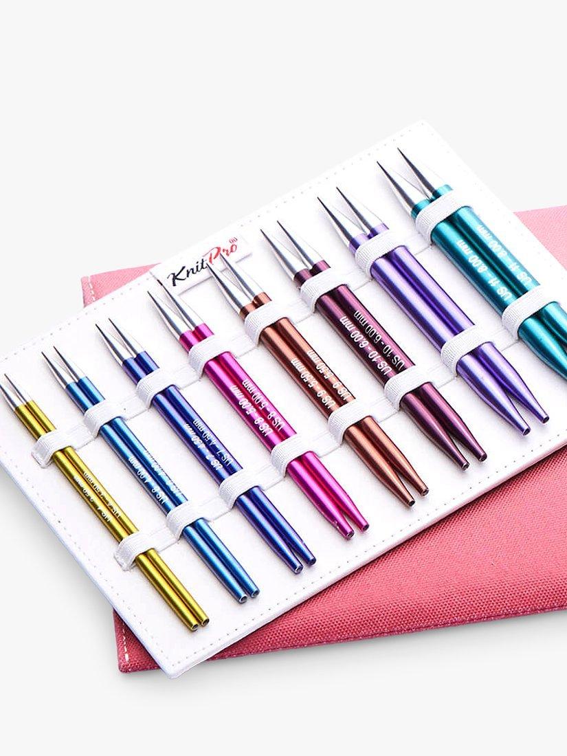Set of 8 aluminium knitting needles in a spectrum of bright and lively colours with beautiful silver tips.