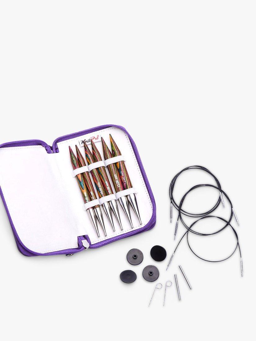 The Symfonie interchangeable knitting needle set comes in an elegant purple fabric case and contains: 1x 9mm, 10mm and 12mm needles; 360° swivel stainless steel cables (2 x 60cm, 80cm, 100cm); 6 end caps, 3 cable keys and 1 set of cable connectors.