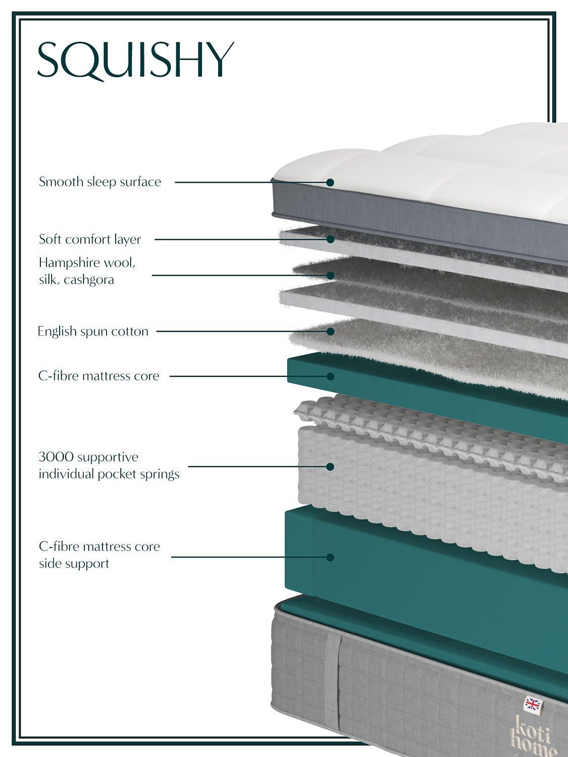 A combination of temperature regulating English spun cotton and Hampshire wool, silk and cashgora make up the natural fillings. These are layered on top of a C-Fibre core which houses 3000 pocket springs in a king size. The supportive and individually layered pocket springs move independently, ensuring body contouring, comfort and support. And edge-to-edge support means you have the full width of the mattress to sleep on.