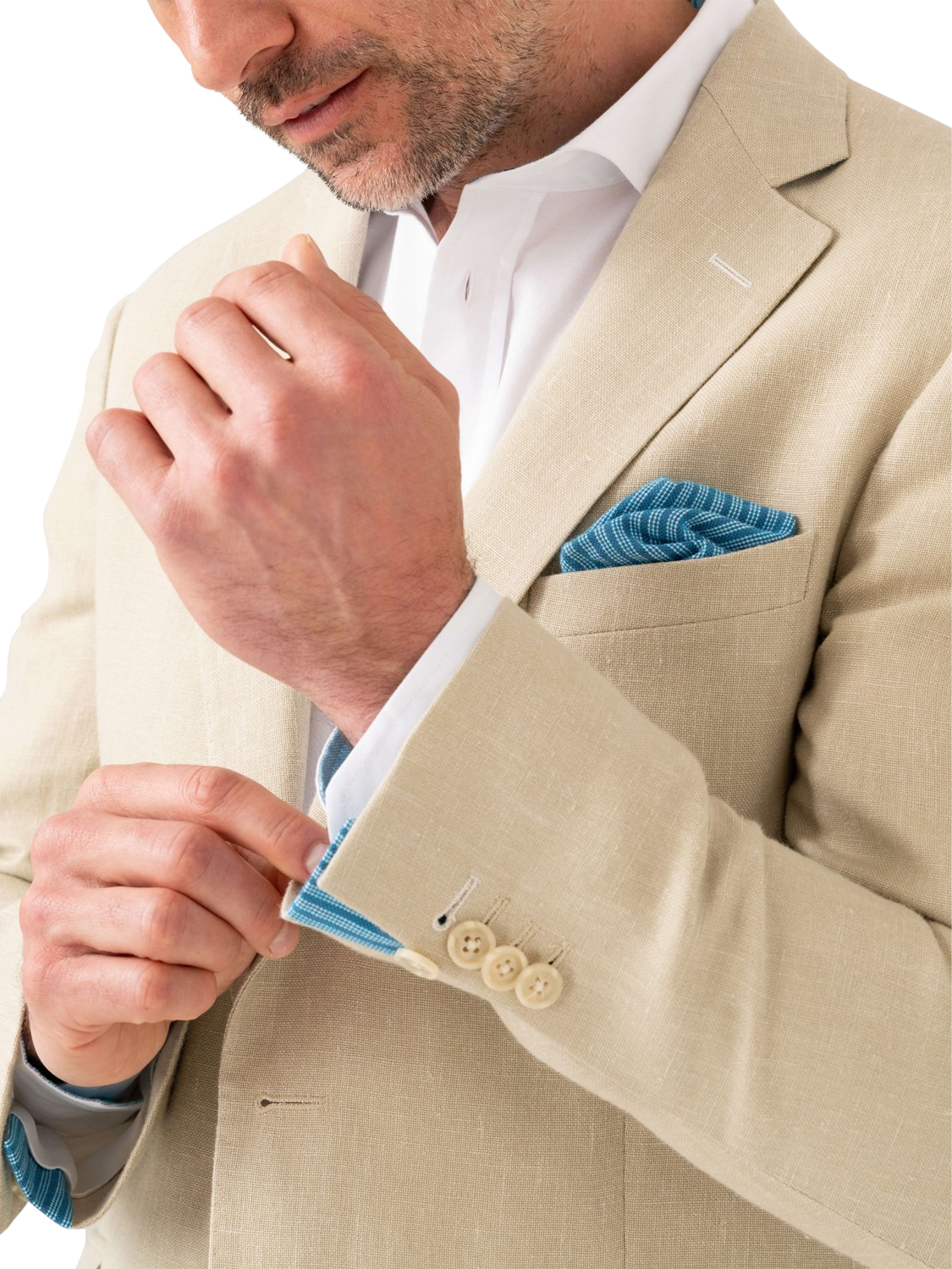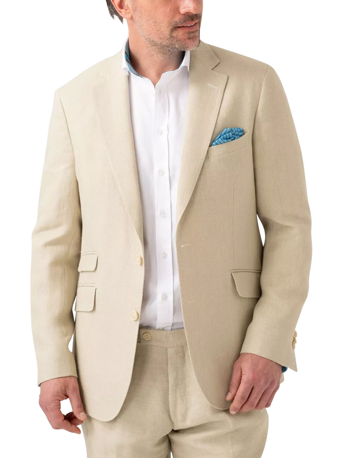 KOY linen blazer with welt pockets and buttoned cuff detail.
