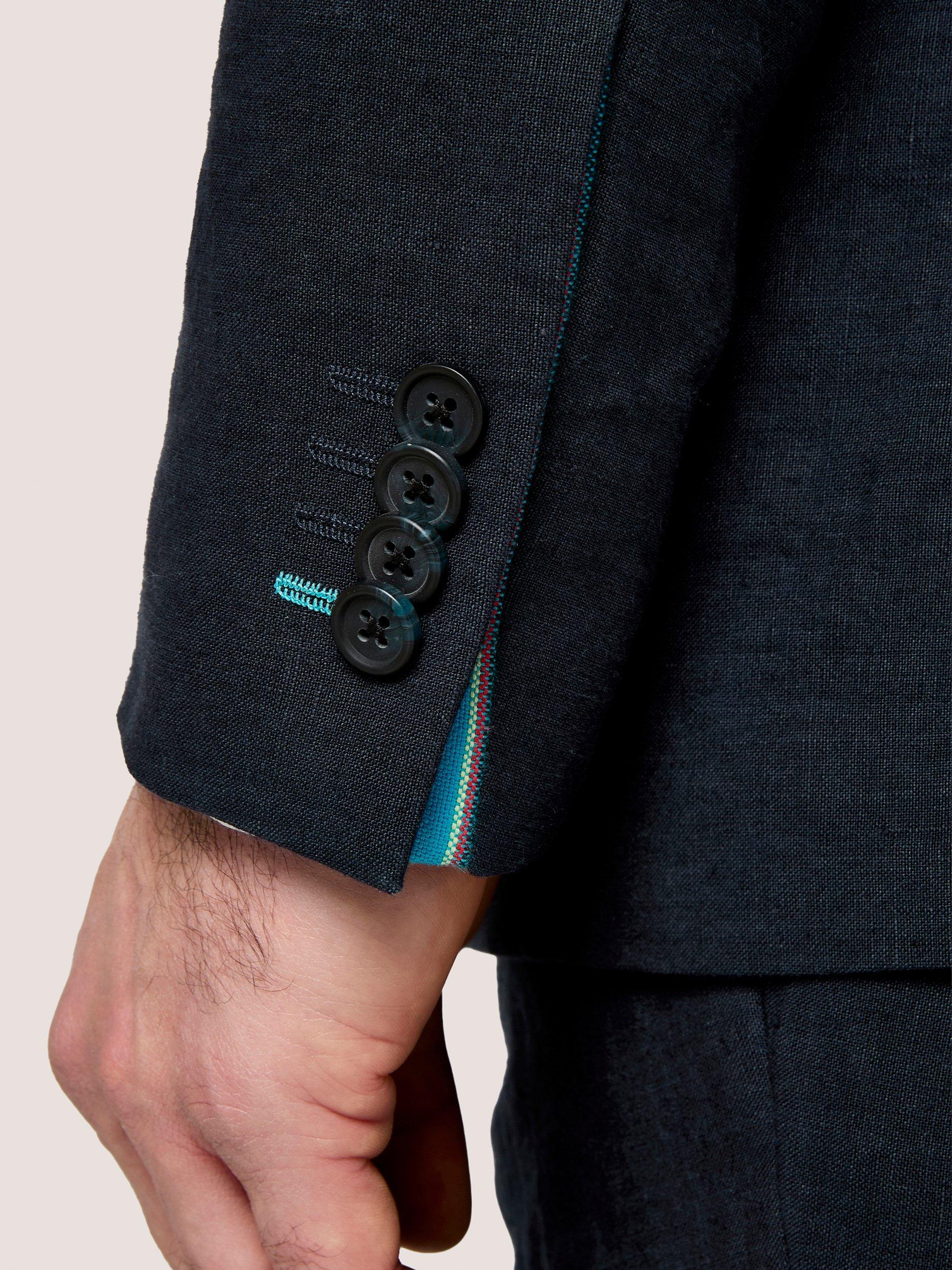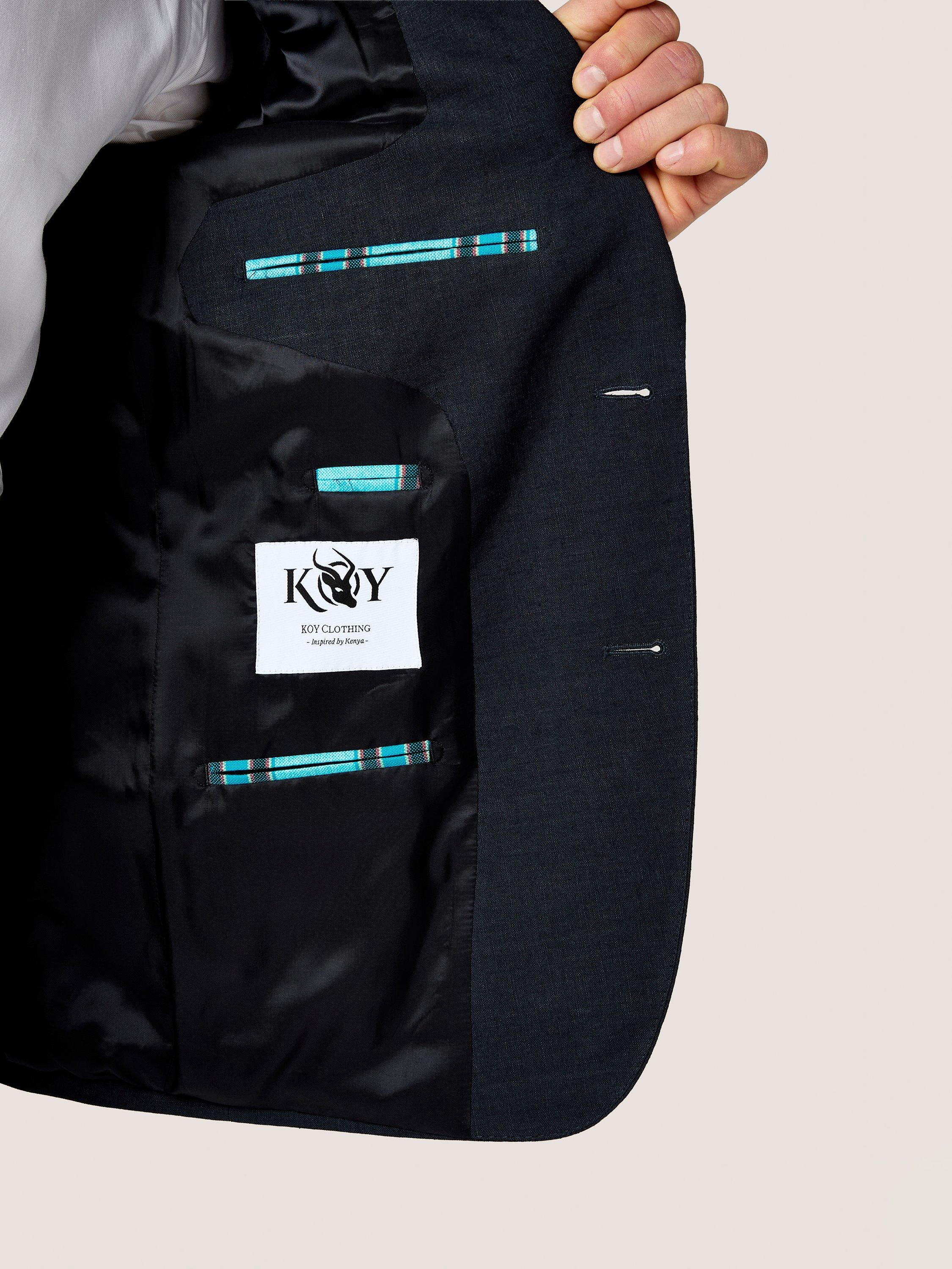 This jacket is made from 100% linen and includes subtle detailing of the authentic Kenyan kikoy fabric. An added feature for this unique jacket is a pull-out kikoy pocket square.