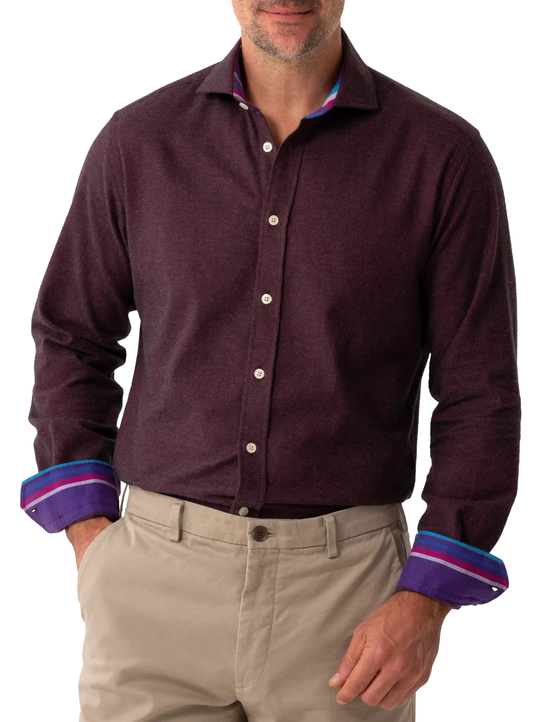 This shirt is cut from a soft blend of cotton and cashmere with striped African Kikoy fabric at the collar and cuffs. The striking finishing touches also give this shirt a unique feel with a powerful story and meaning behind it.