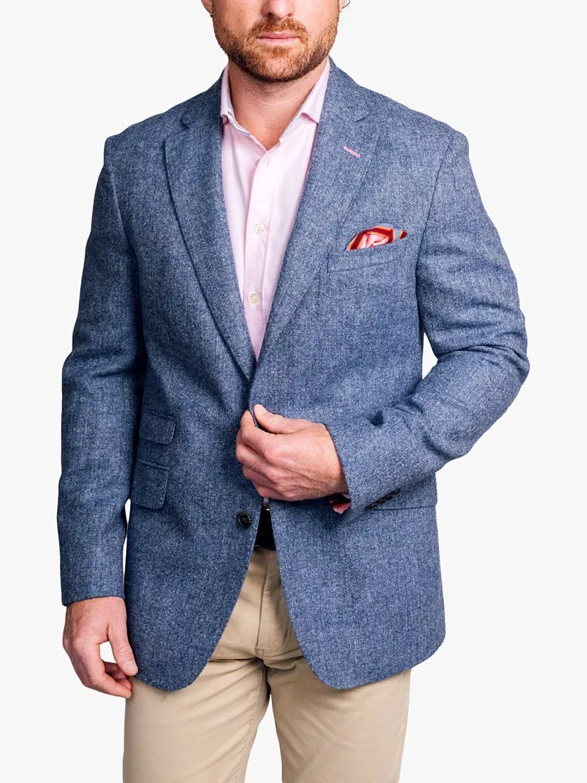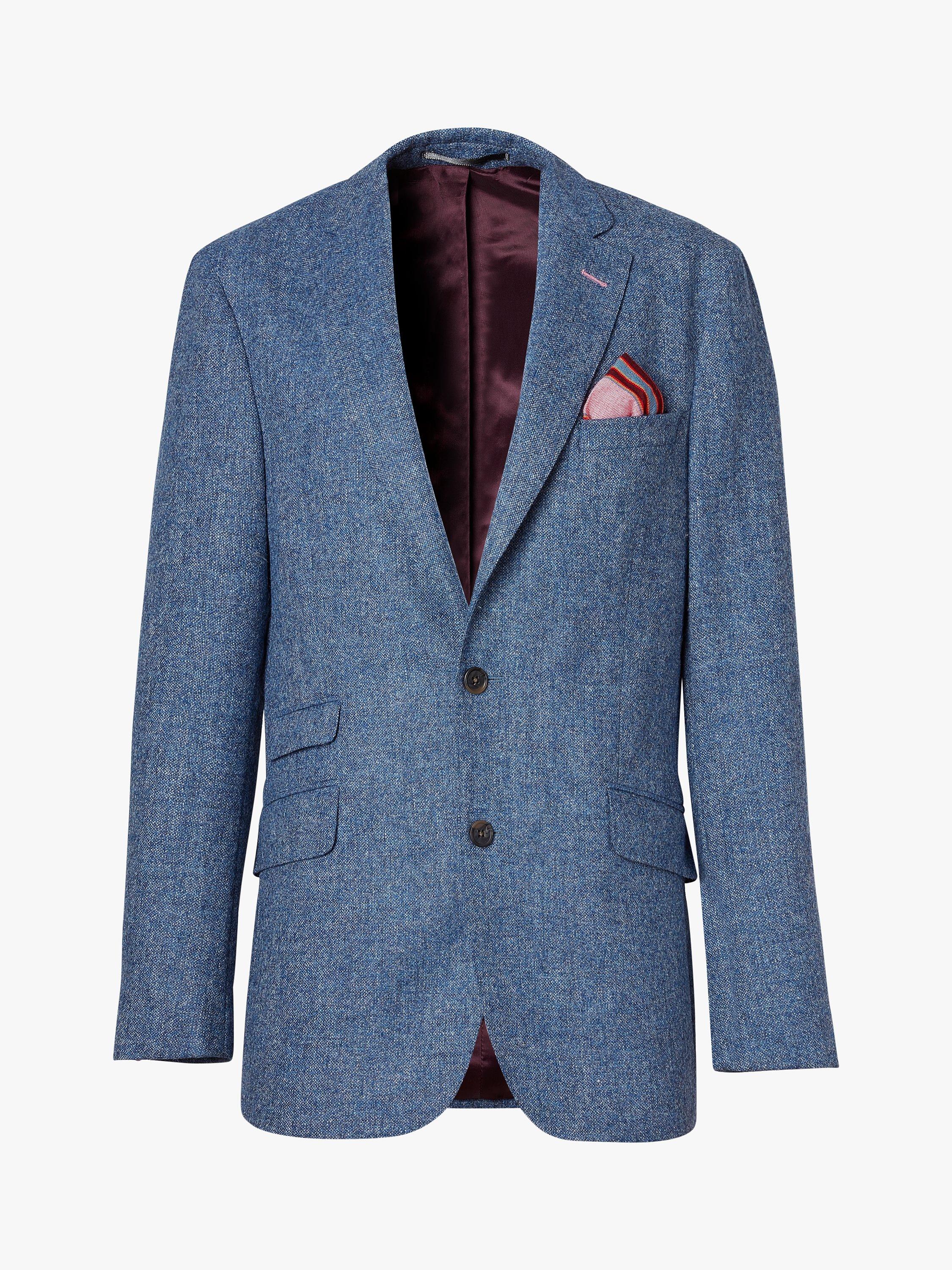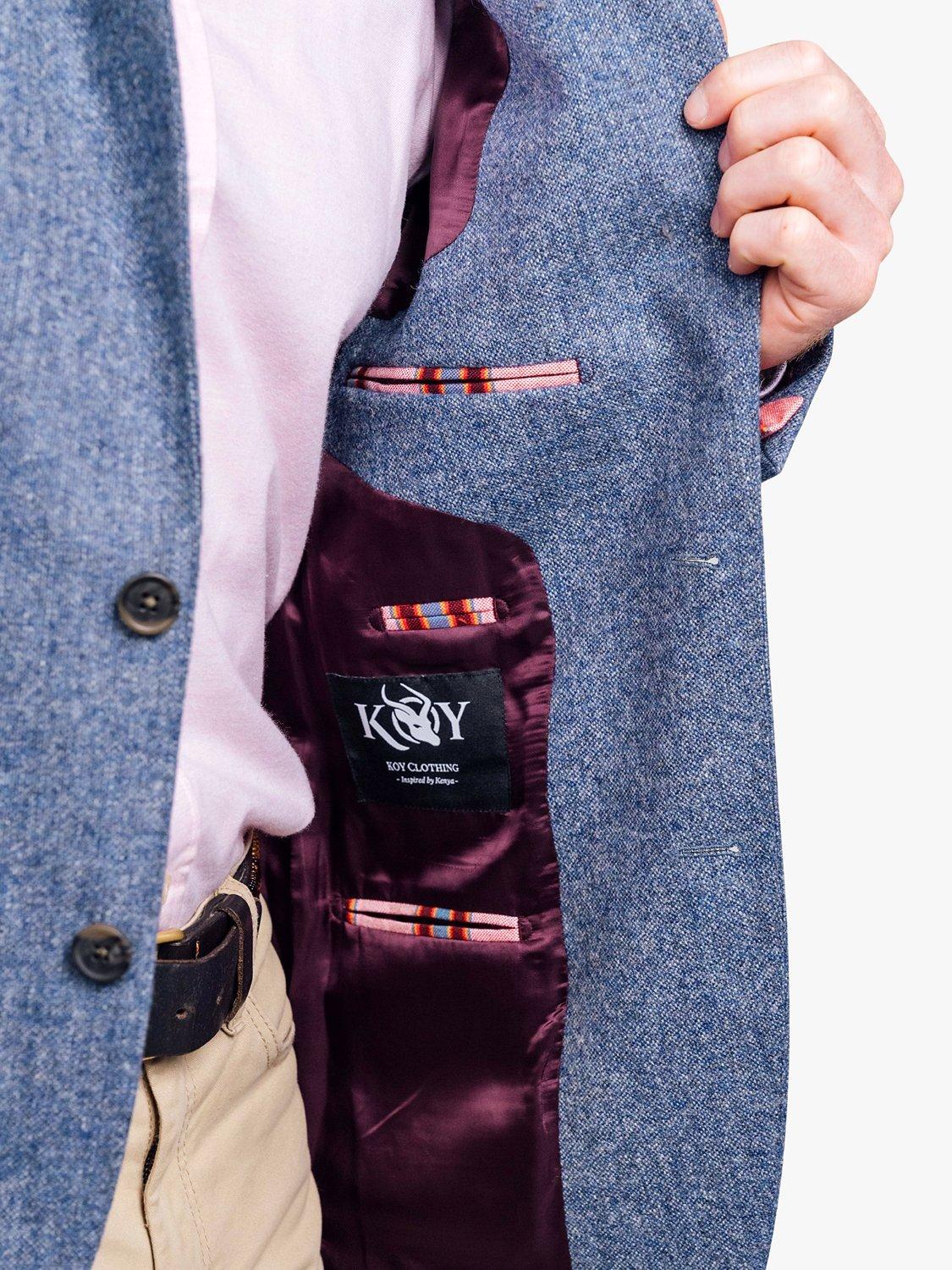 Cut to a classic tailored design, it features a two-button front, elegant peak lapels, flap side pockets alongside a matching ticket pocket, and a breast pocket complete with a pull-out Kikoy purple pocket square.