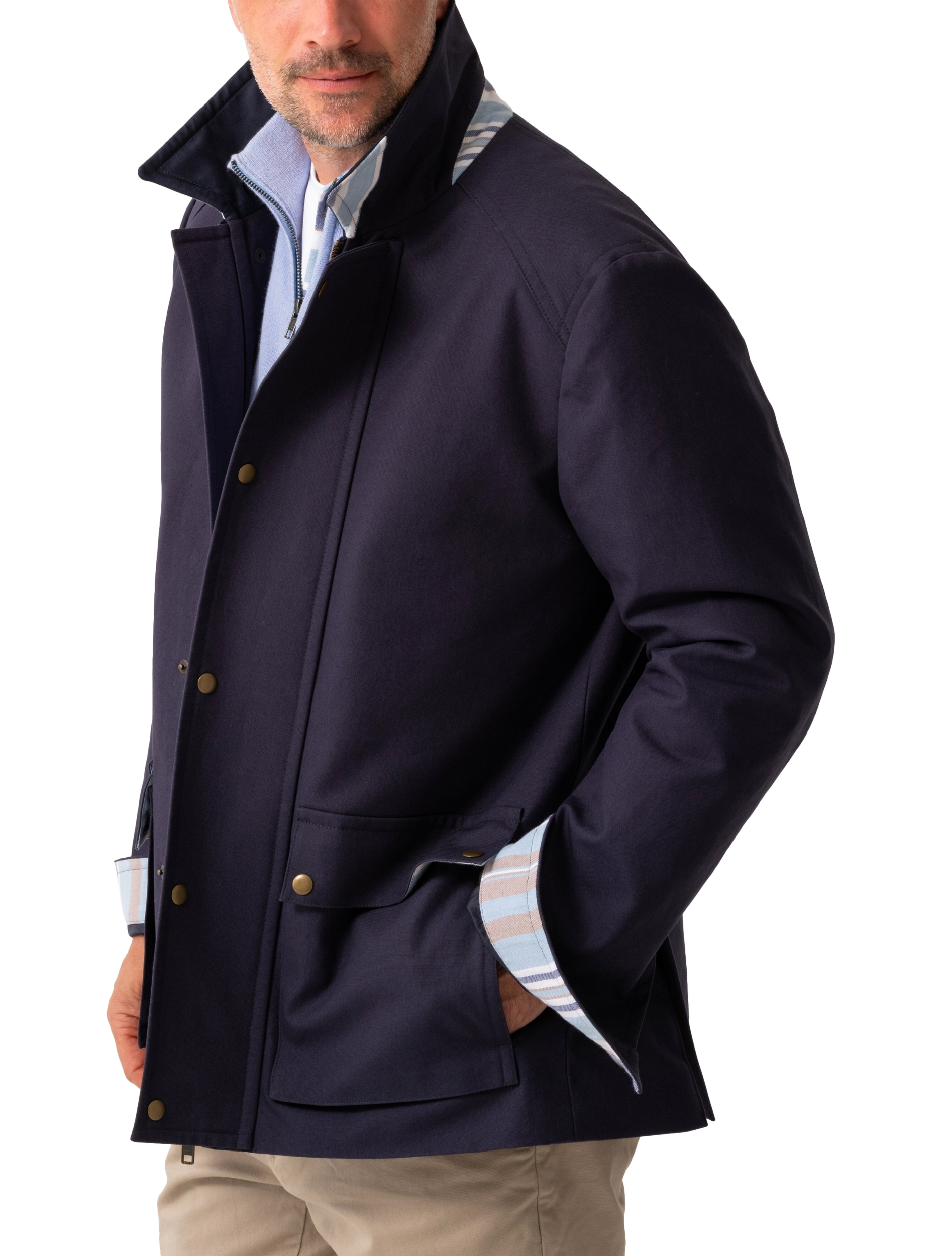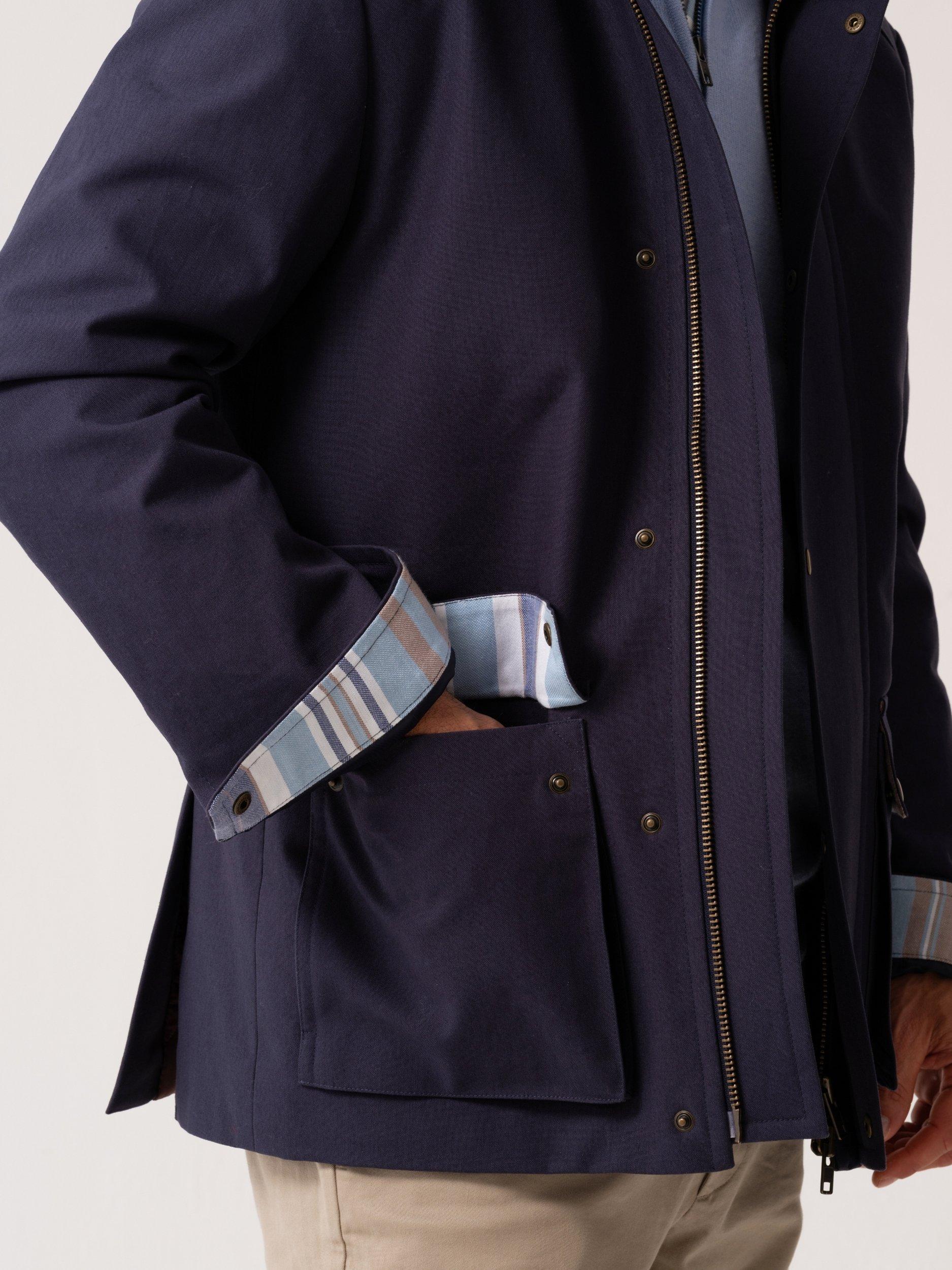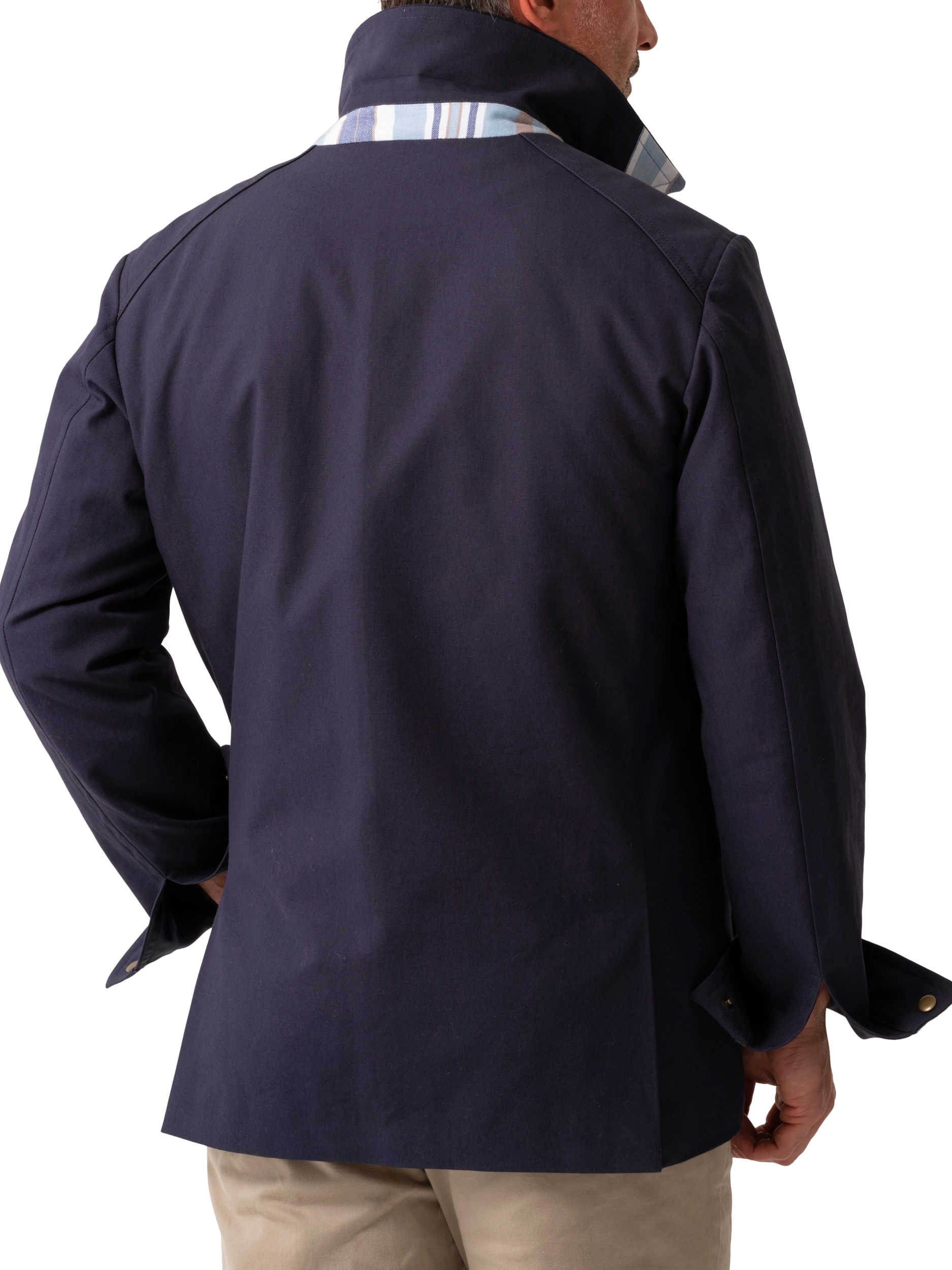 A semi water resistant jacket made from heavyweight cotton and detailed with two convneient patch pockets. This outerwear piece also includes subtle detailing inspired by the authentic Kenyan Kikoy fabric under the pocket flaps, collar and cuffs.